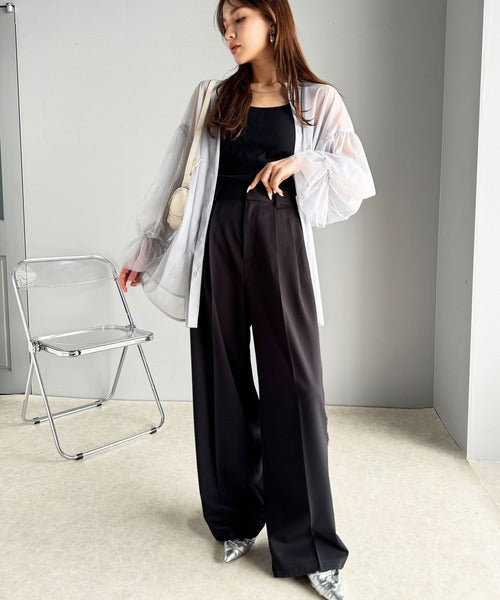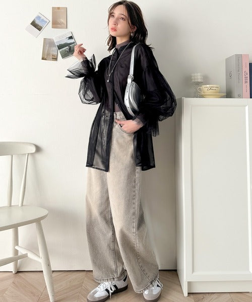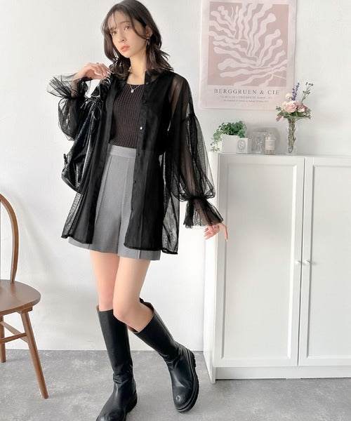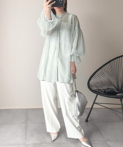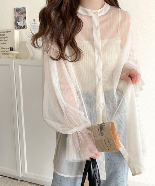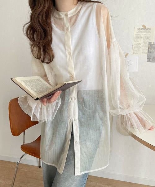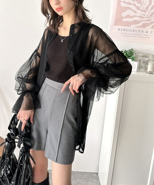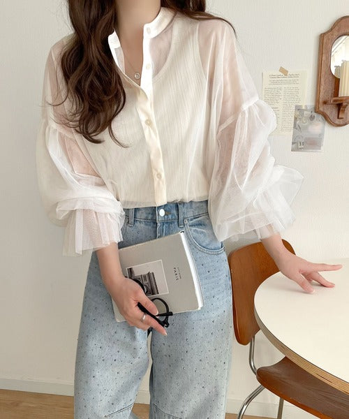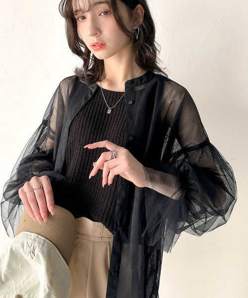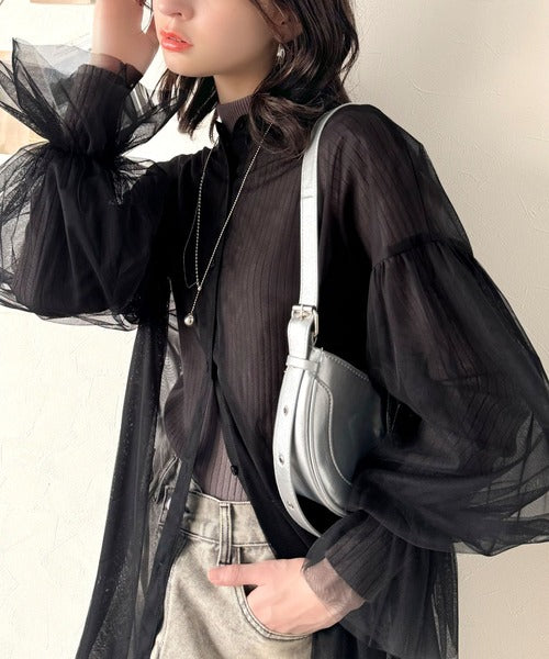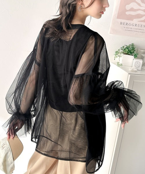 エレガントなシアー素材が大人の魅力を引き立てる。前後2wayフリル袖チュールレイヤードシャツ(長袖) ce1010372