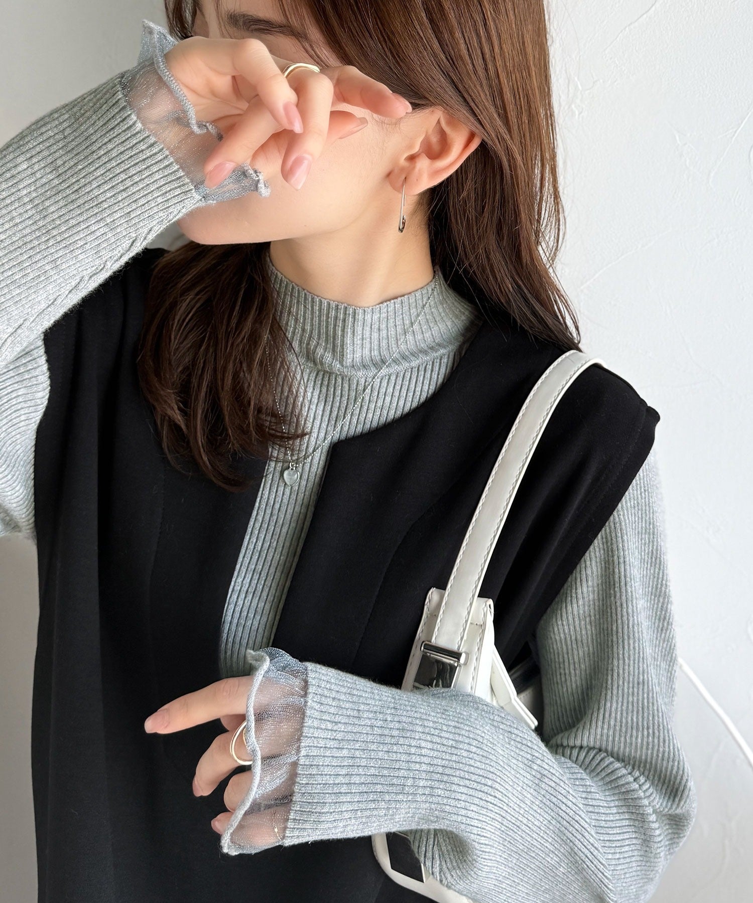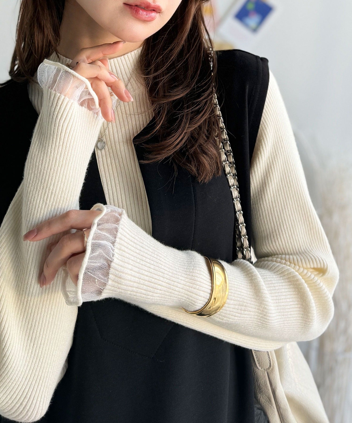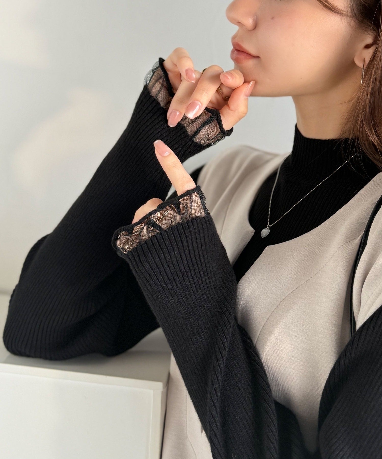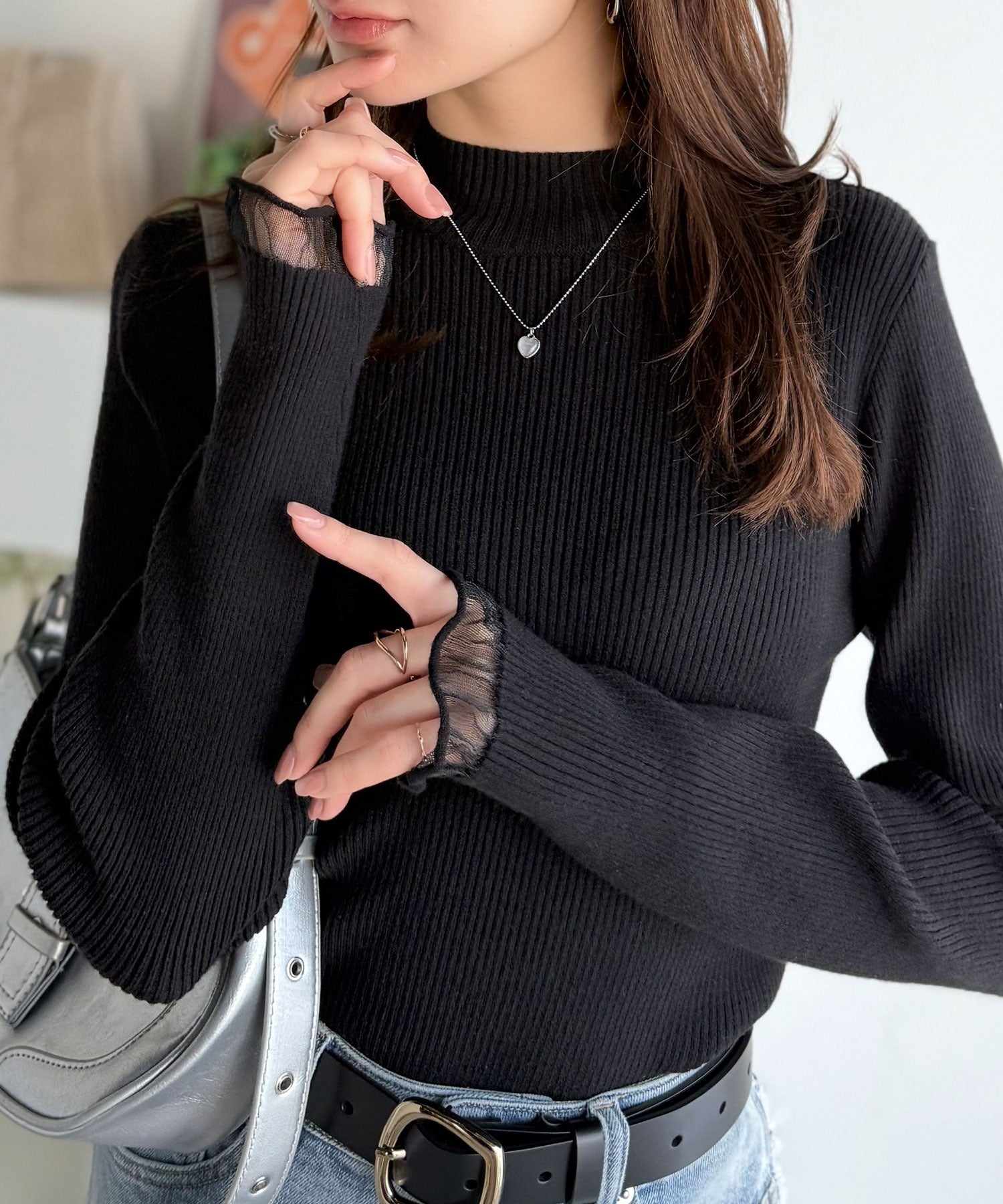 《daaco×クラシカルエルフコラボ》袖先がフェミニンなアクセントに。プチハイネック袖シアーリブニット ce1010513