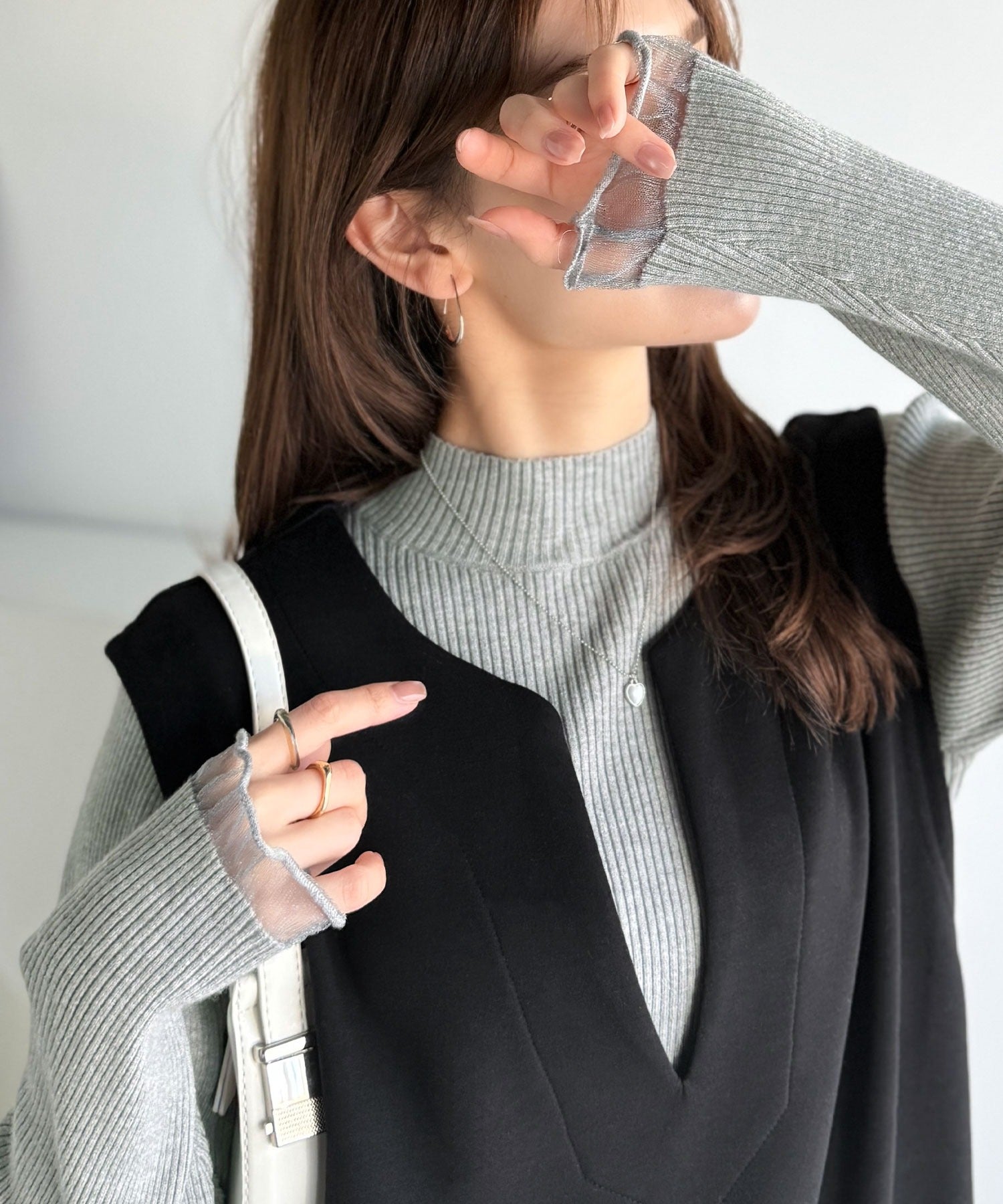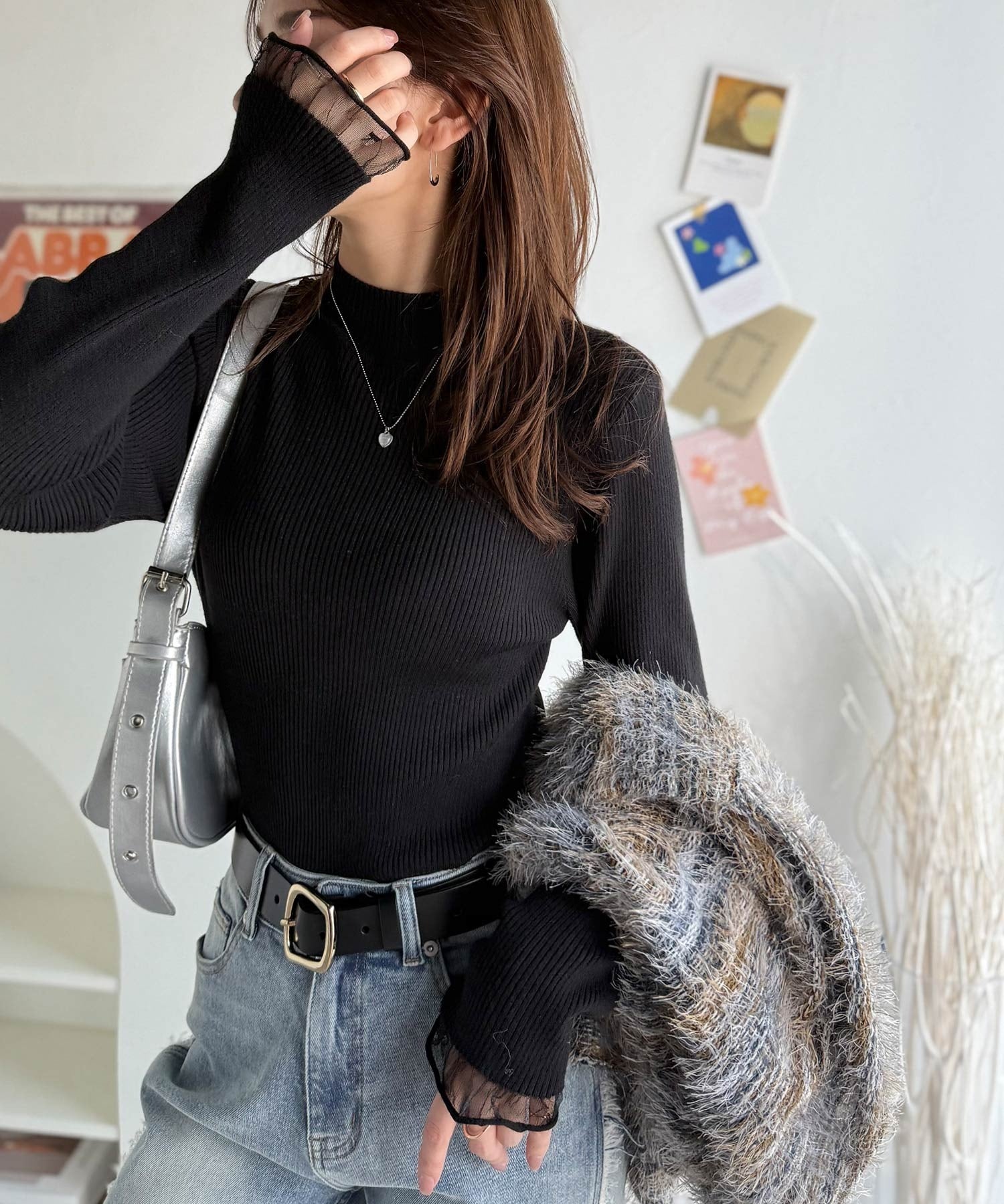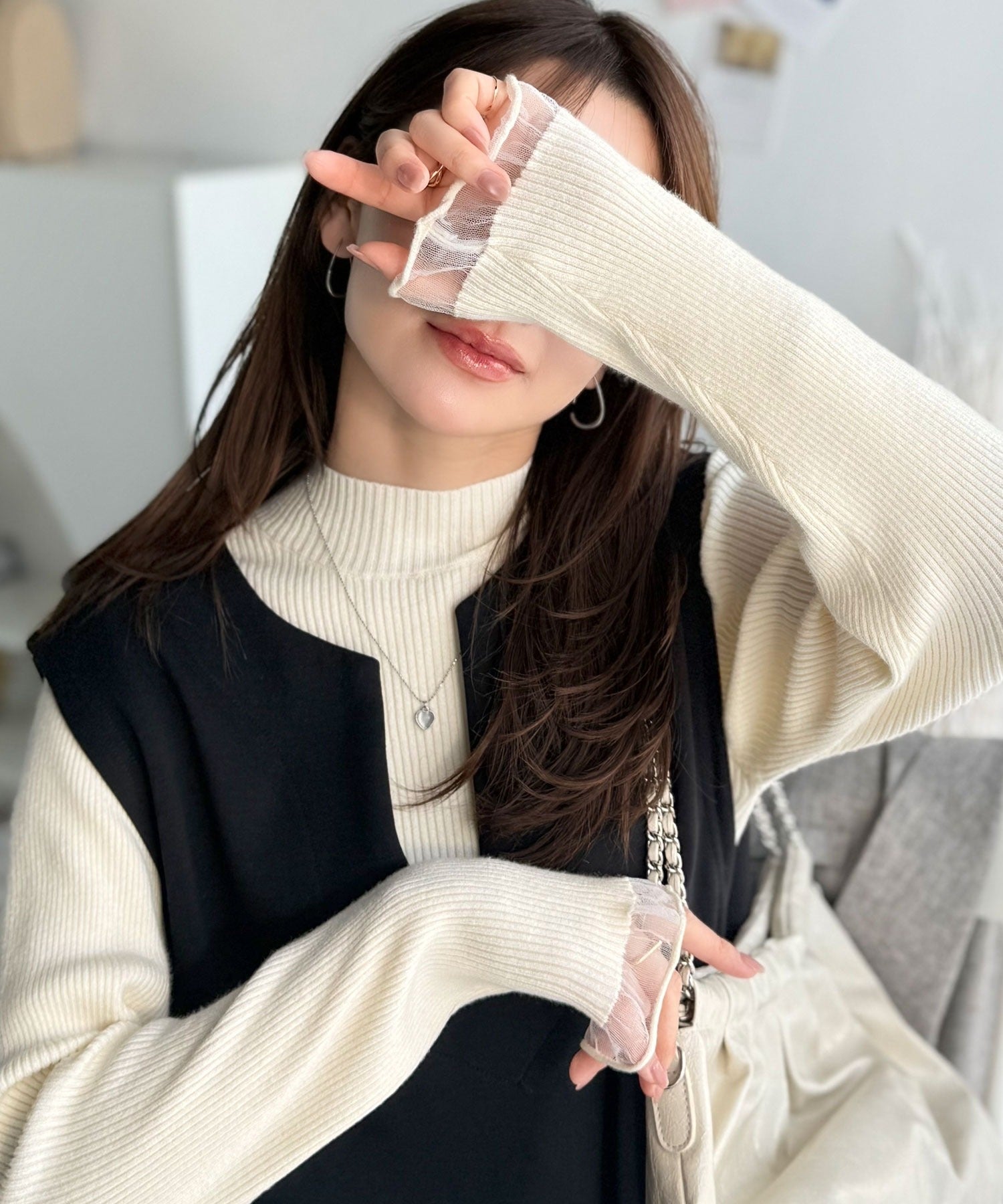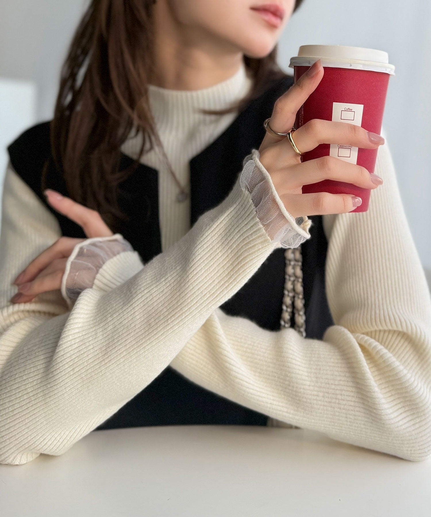 《daaco×クラシカルエルフコラボ》袖先がフェミニンなアクセントに。プチハイネック袖シアーリブニット ce1010513