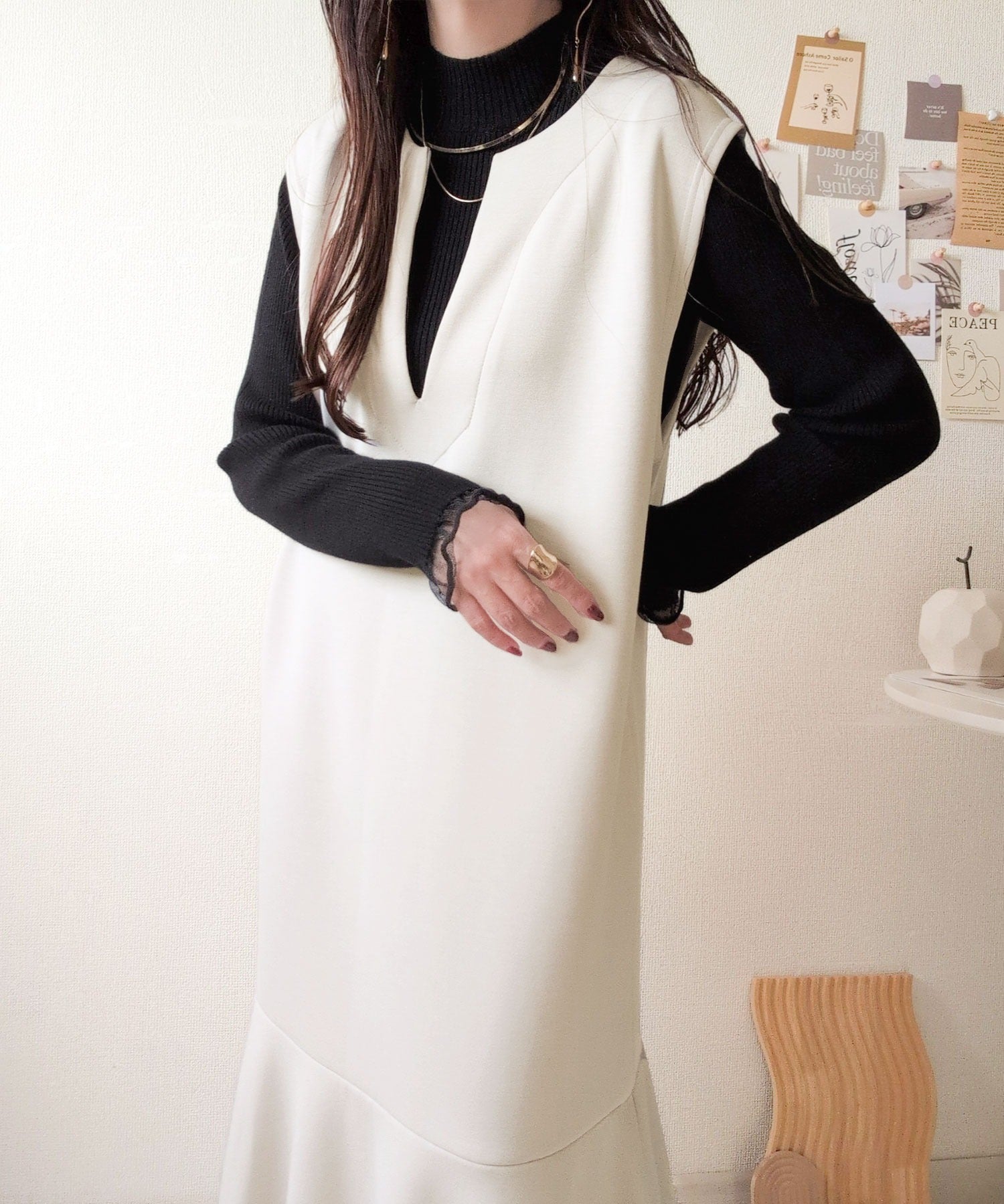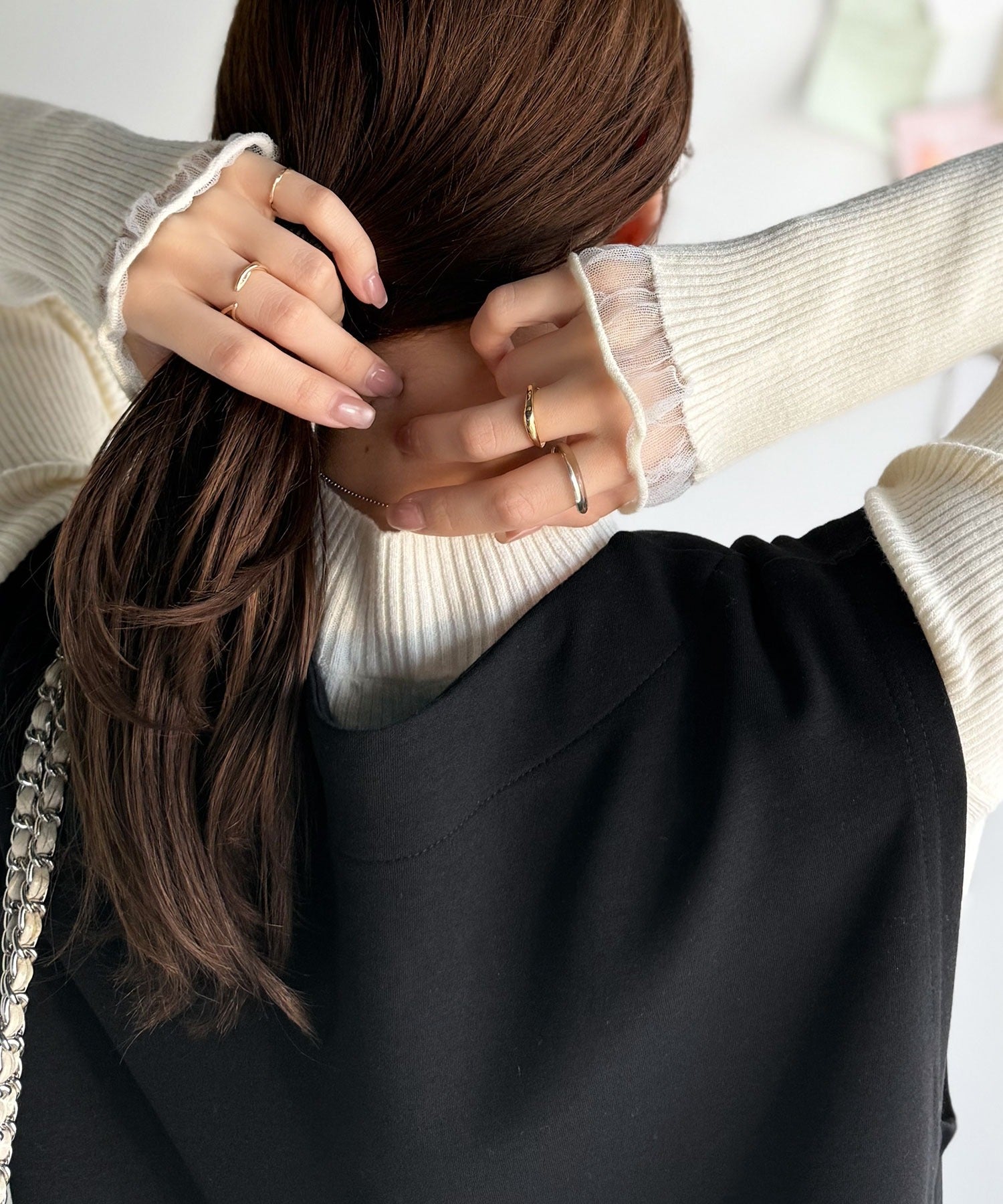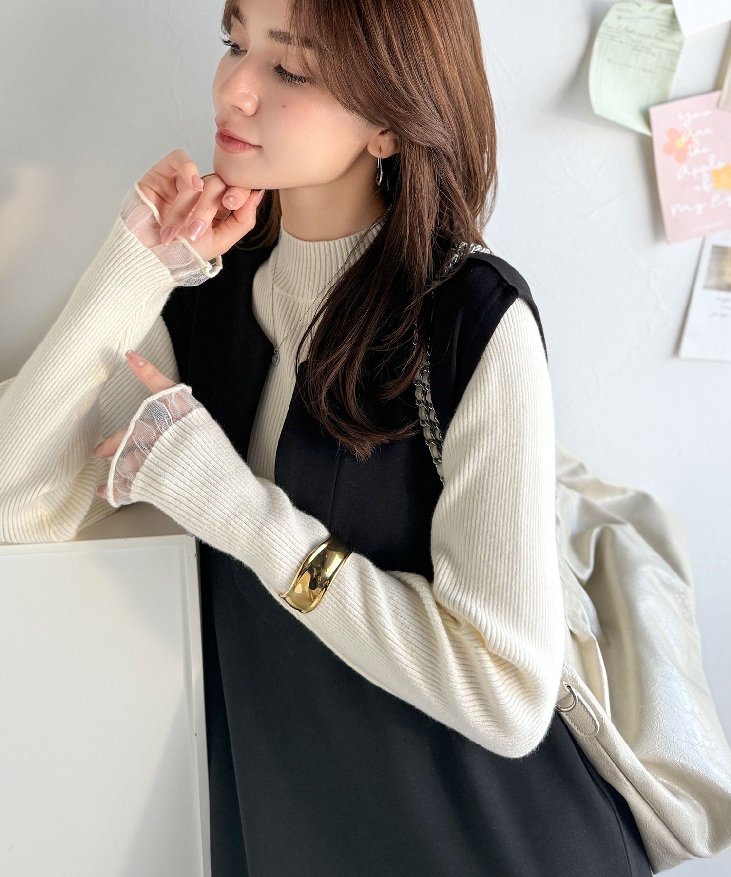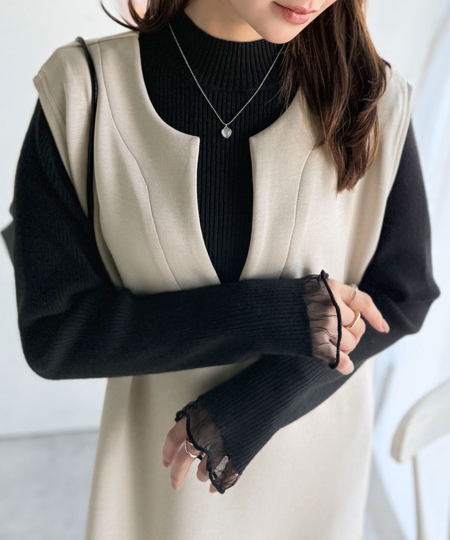 《daaco×クラシカルエルフコラボ》袖先がフェミニンなアクセントに。プチハイネック袖シアーリブニット ce1010513