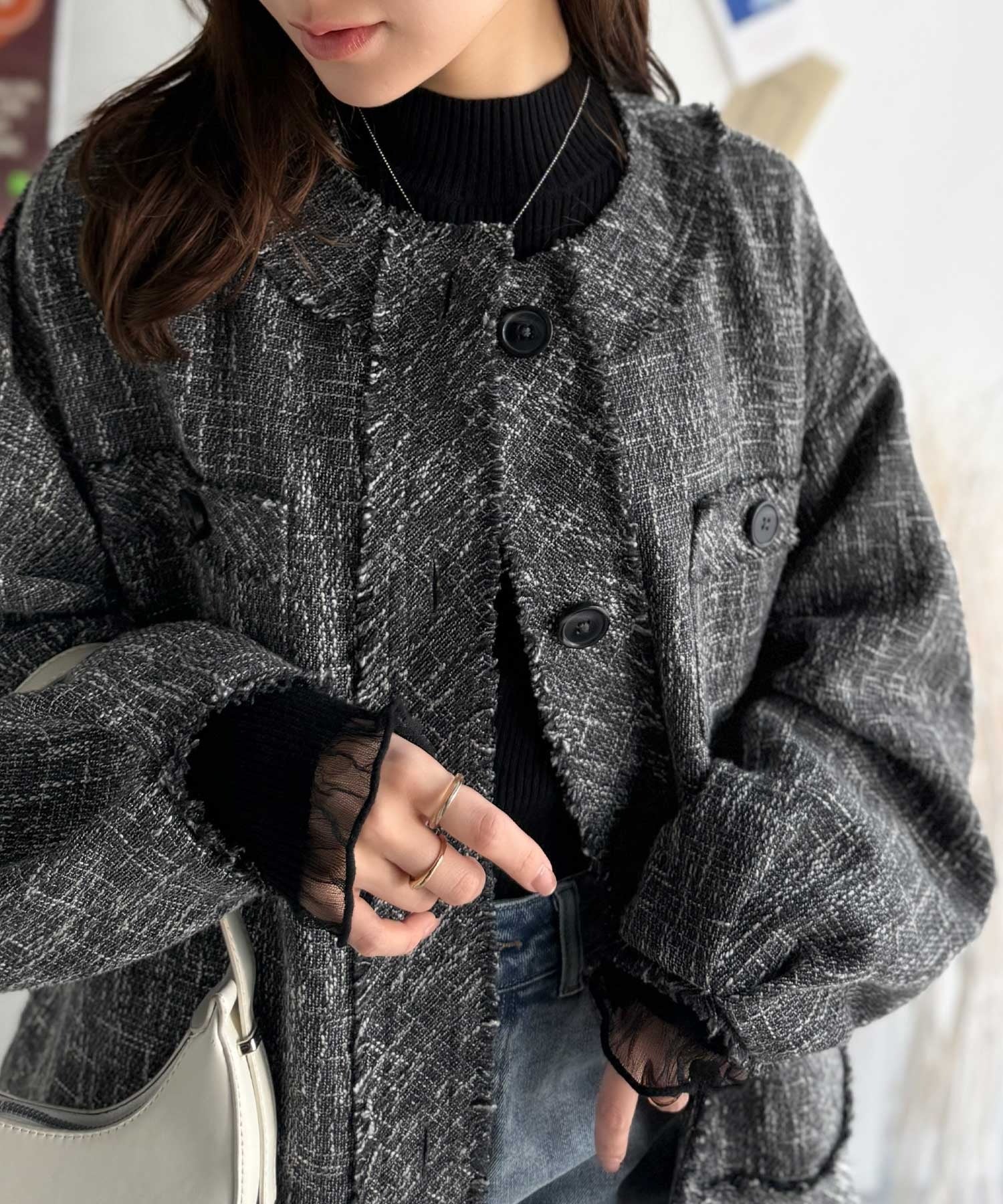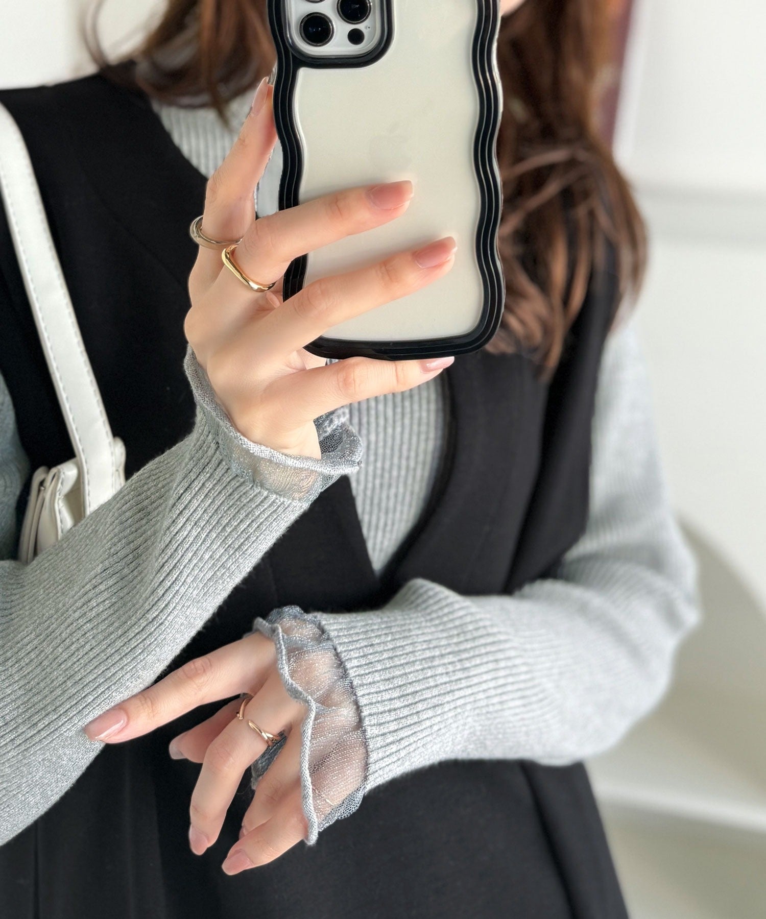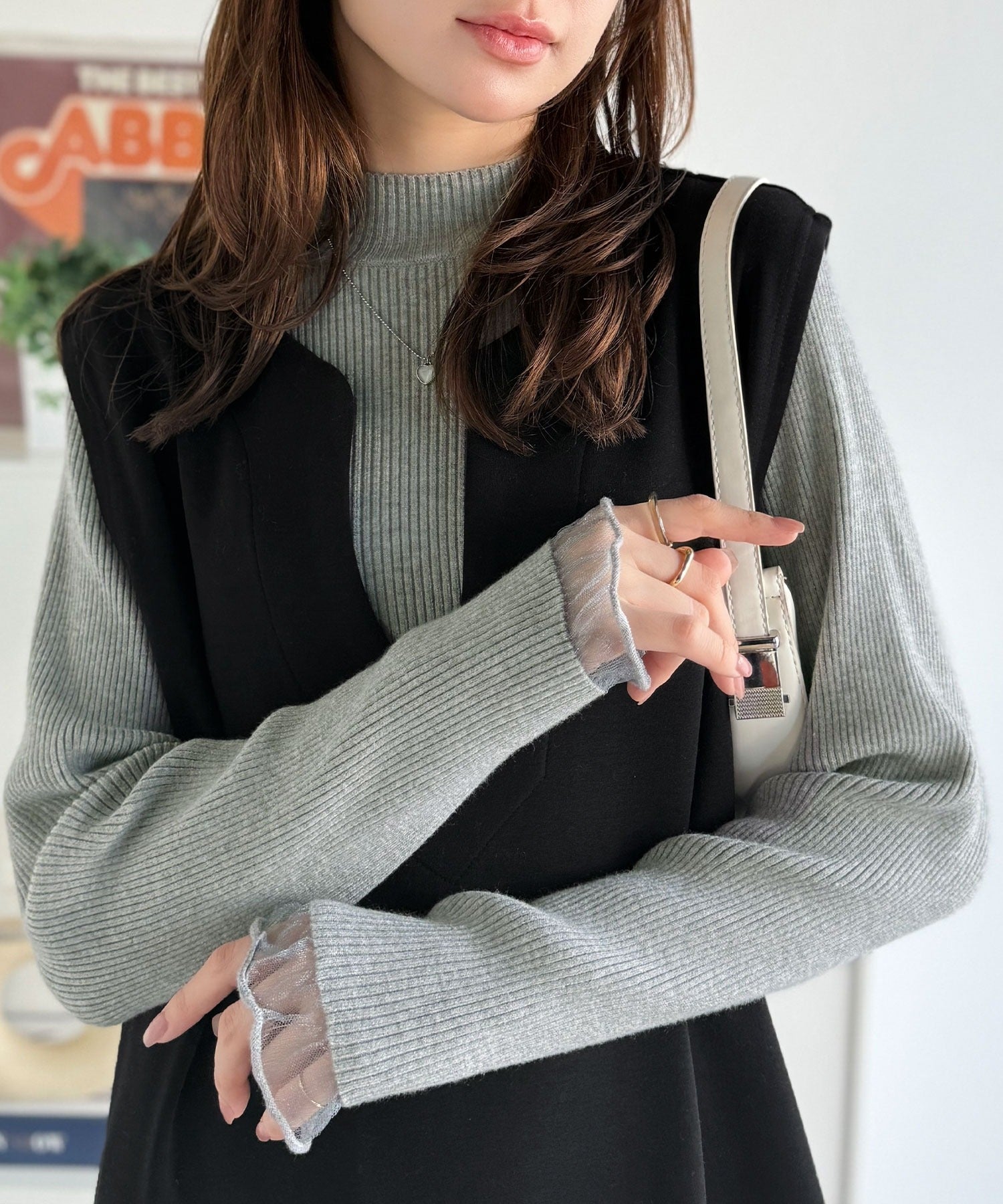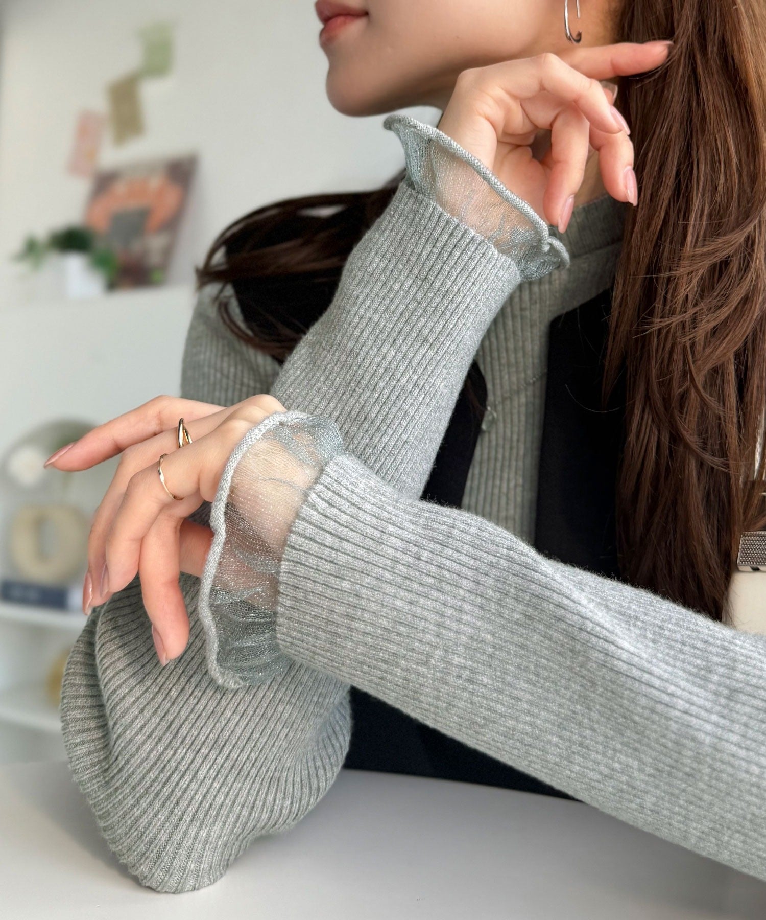 袖口をシアー素材に切り替えたデザインが印象的。