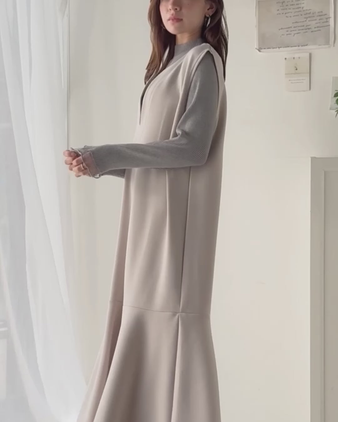 袖口をシアー素材で切り替え、動くたびに揺れるフレアシルエットがフェミニンなアクセントに。