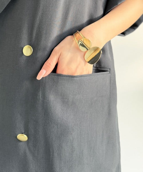 ダブルブレストと金ボタンで上品さをキープしつつ、身体のラインを拾わないリラクシーなシルエット。