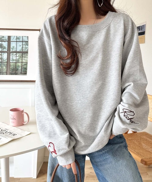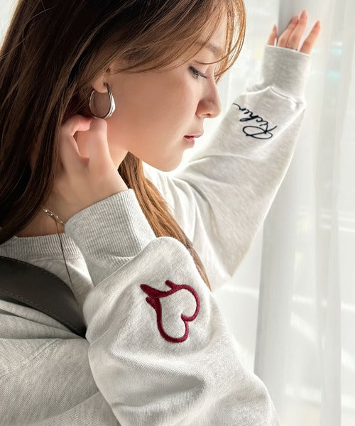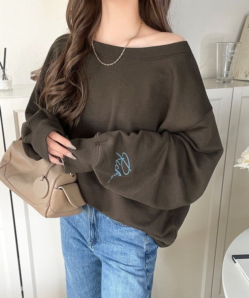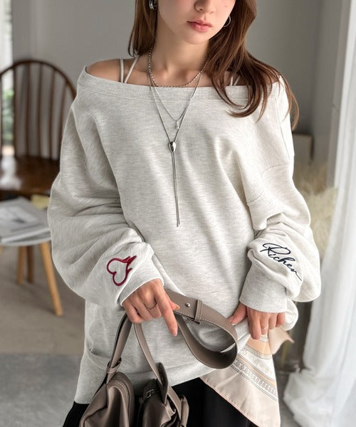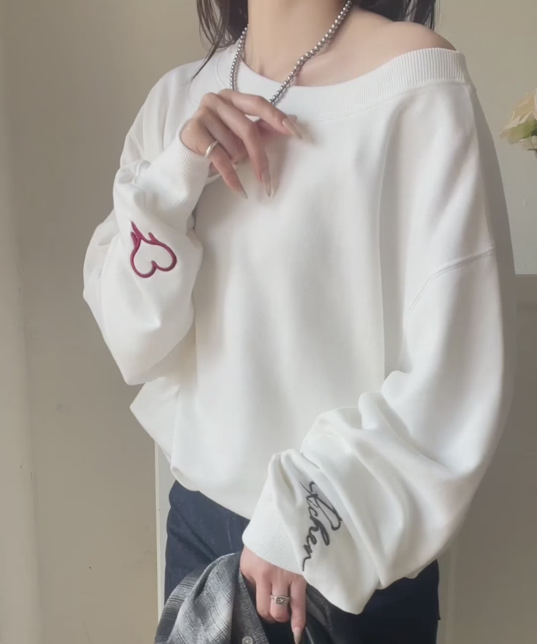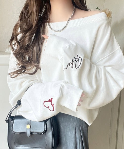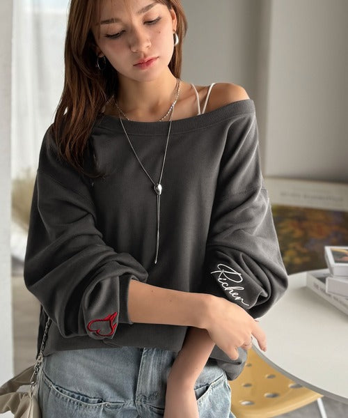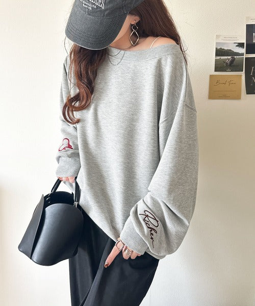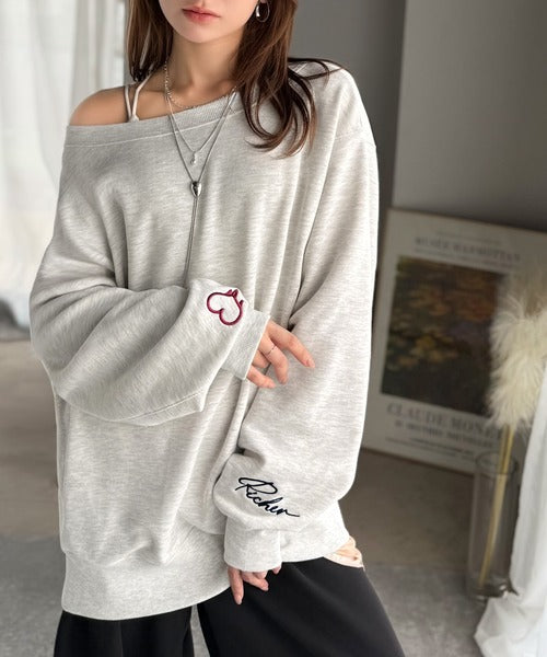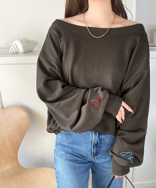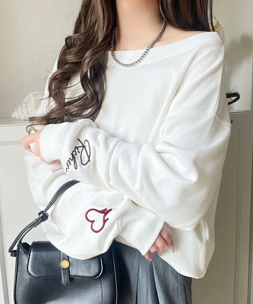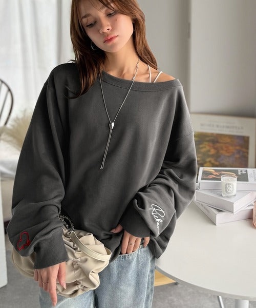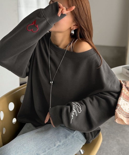 こなれた主役級の存在感♪袖ハート&手書き風ロゴ刺繍裏毛オフショルオーバーサイズスウェット(長袖) ce1330045