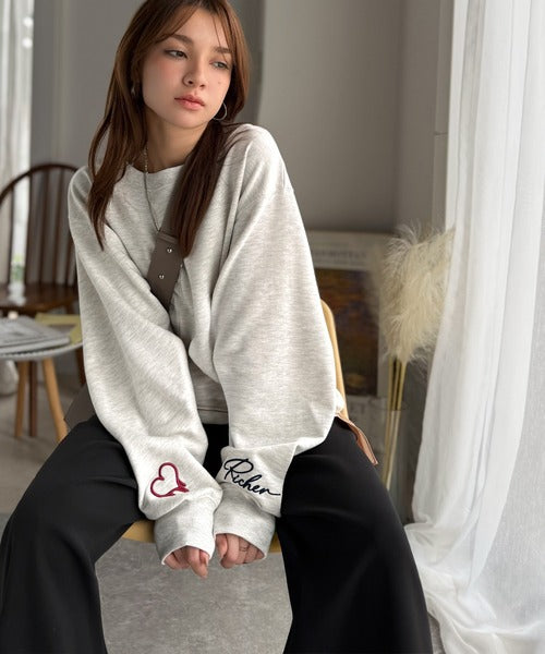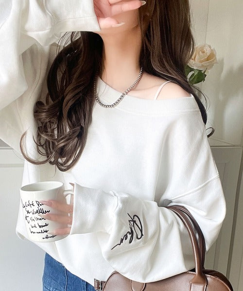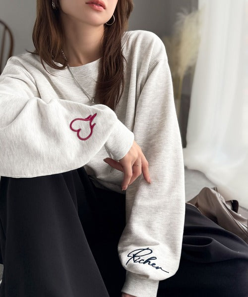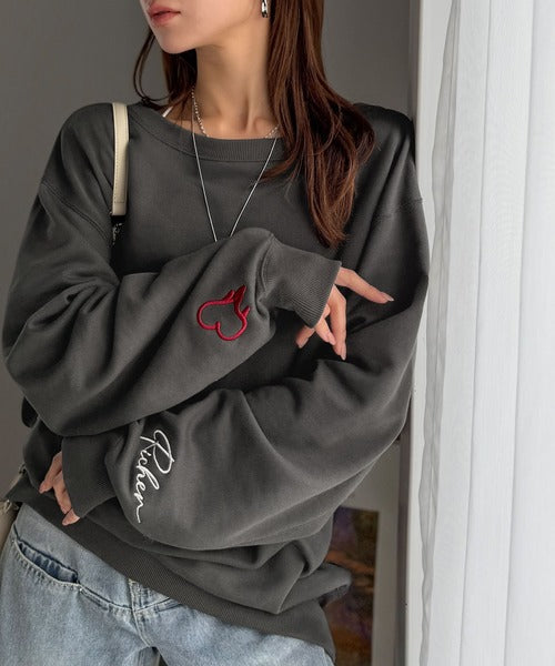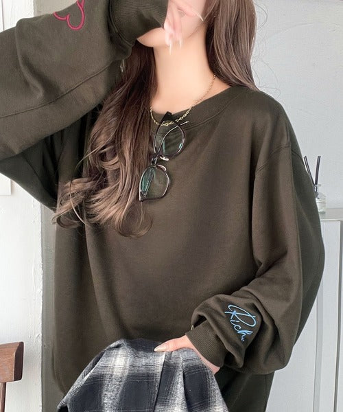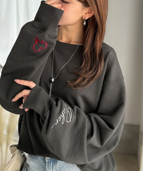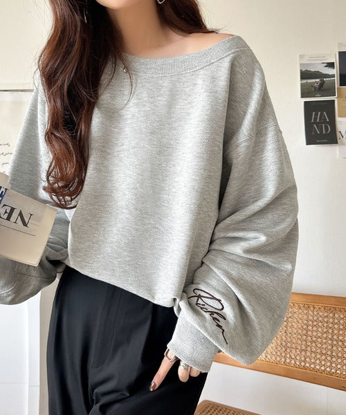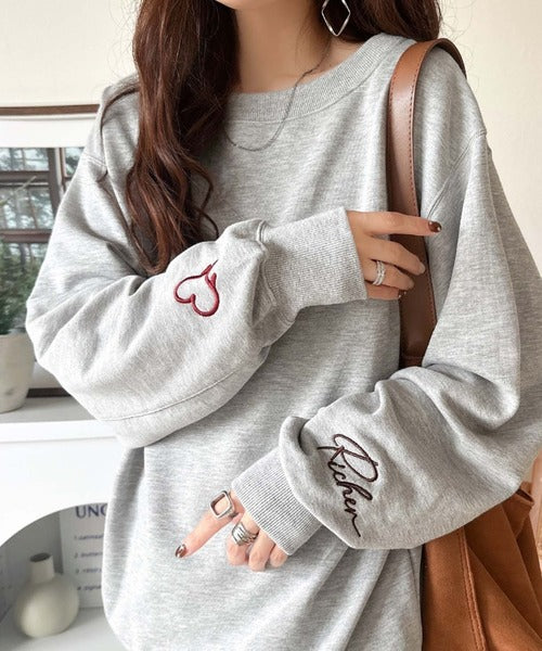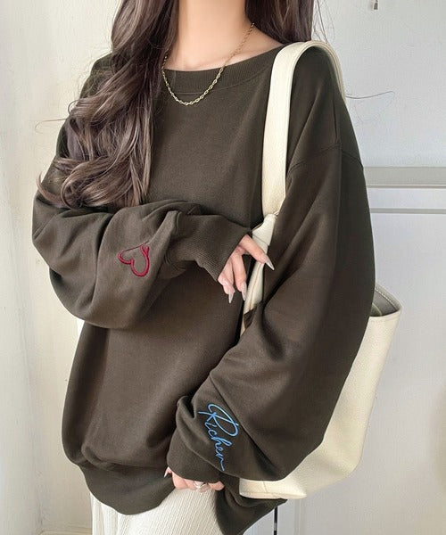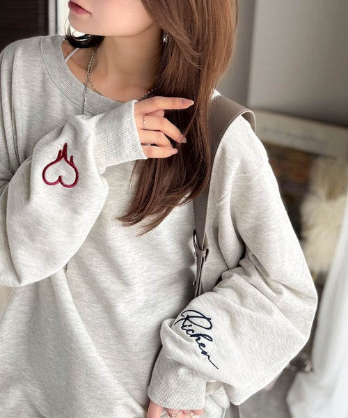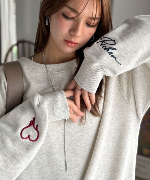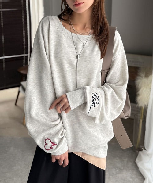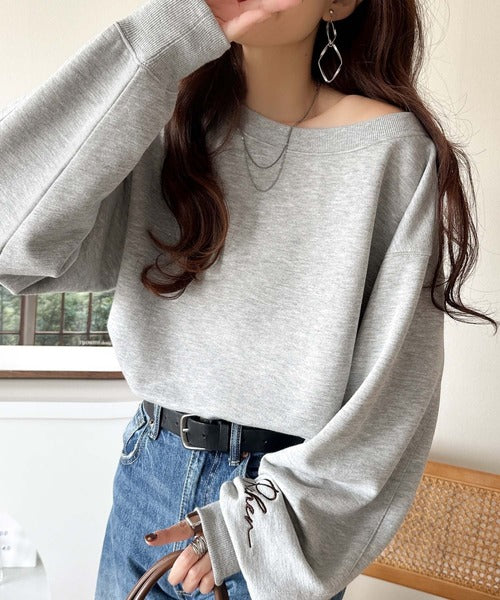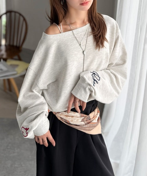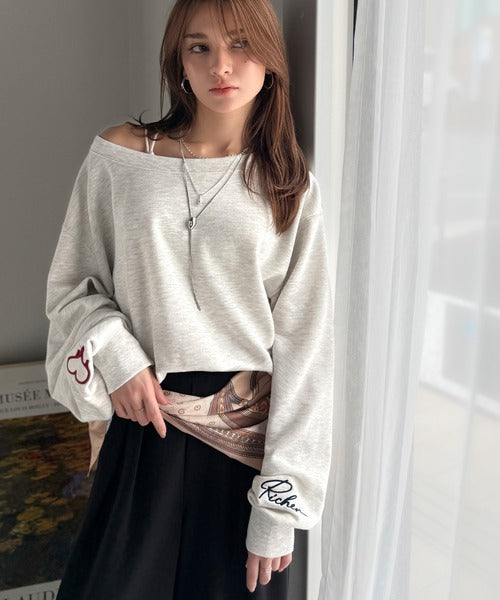 こなれた主役級の存在感♪袖ハート&手書き風ロゴ刺繍裏毛オフショルオーバーサイズスウェット(長袖) ce1330045
