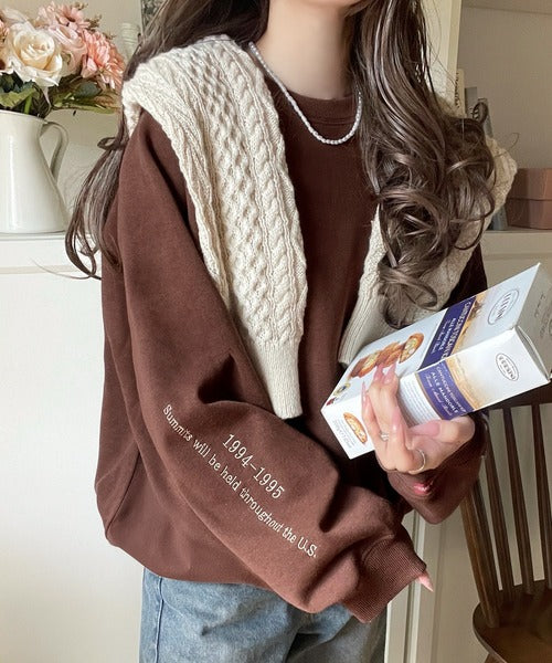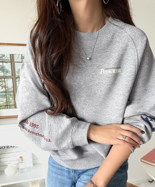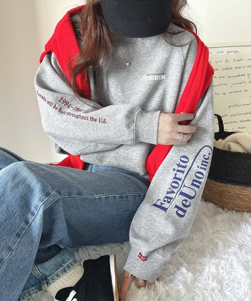両袖に施された刺繍と英字プリントを組み合わせると、