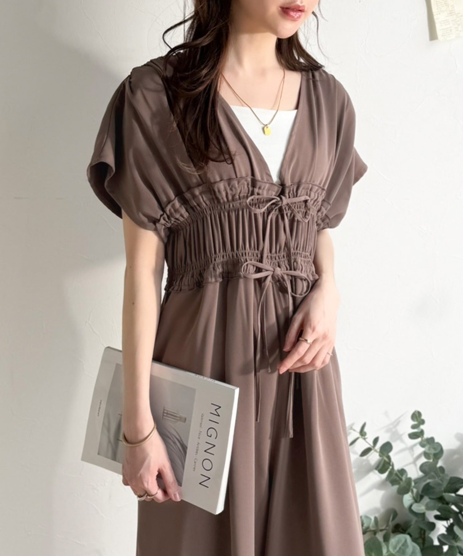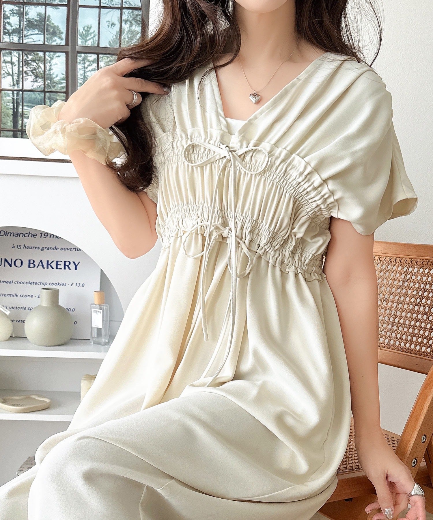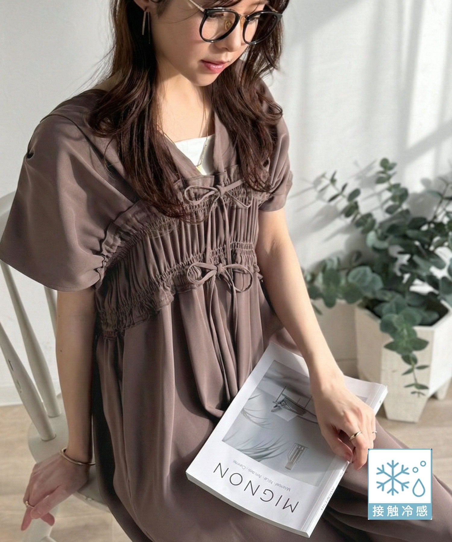 繊細なシャーリングやリボンを施した洗練デザイン。