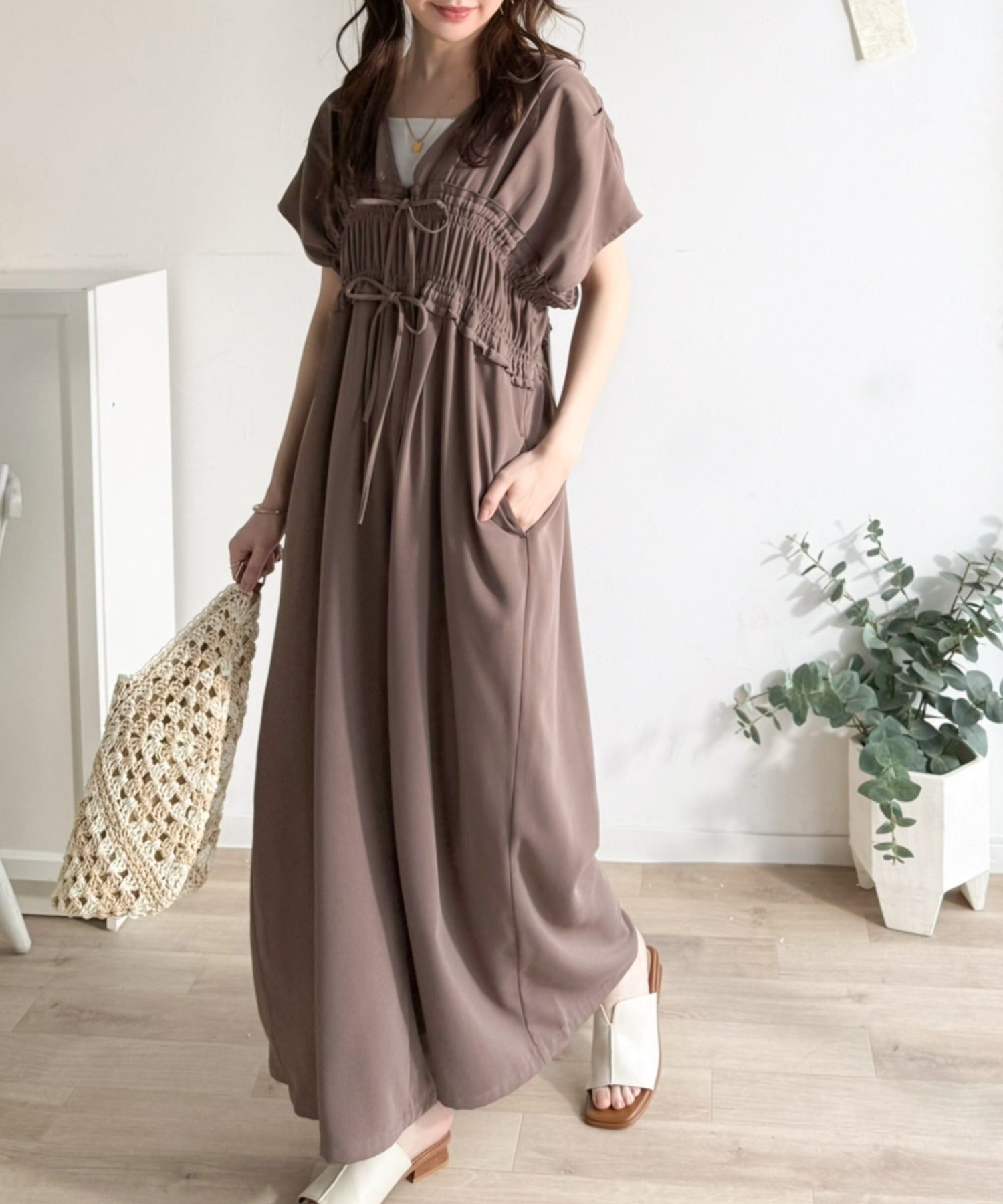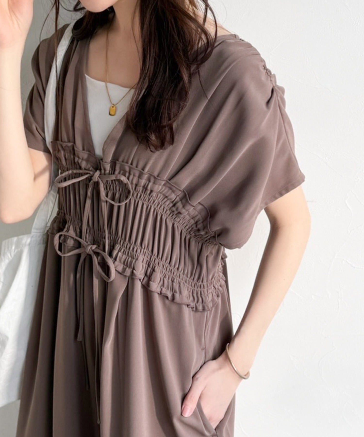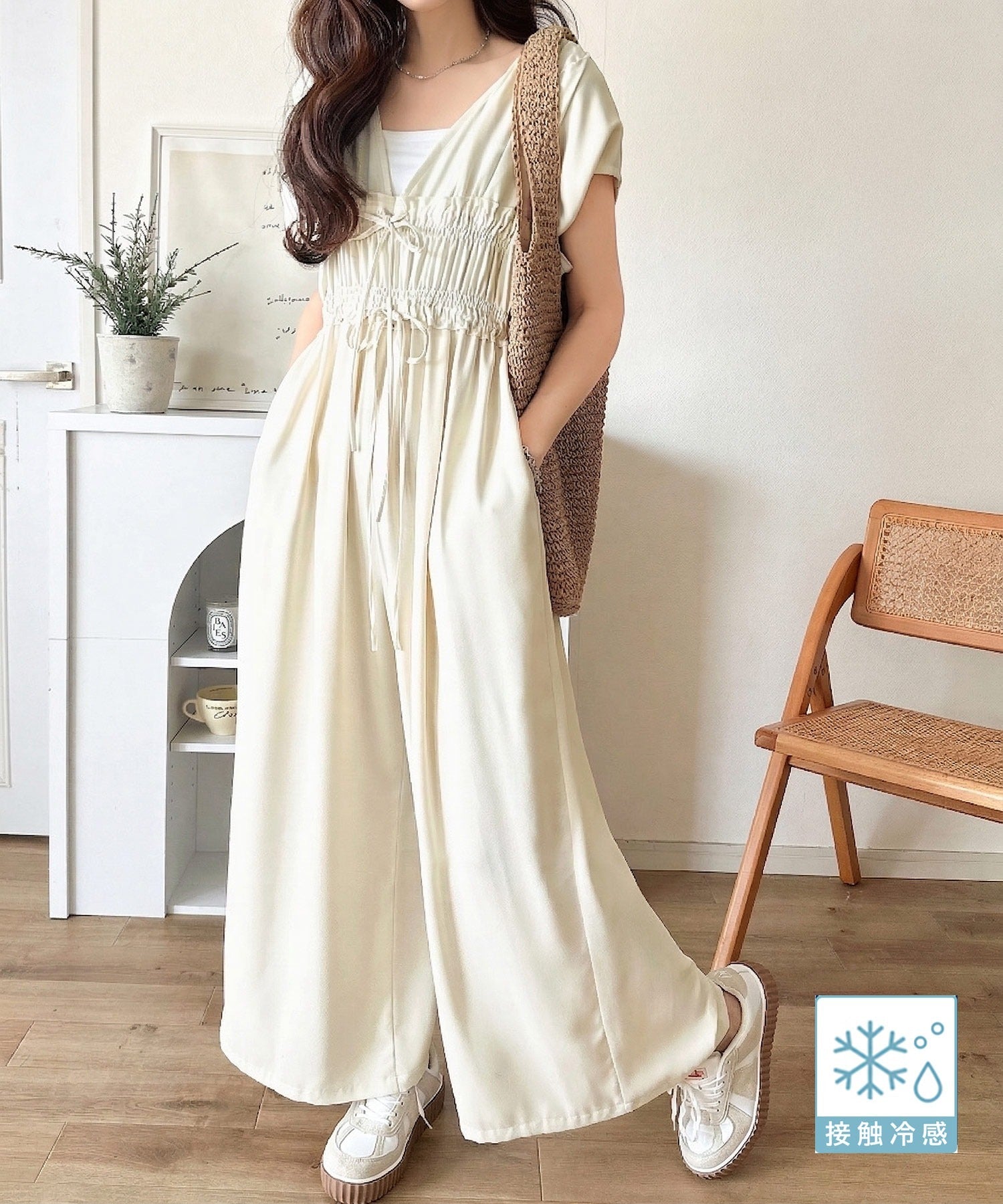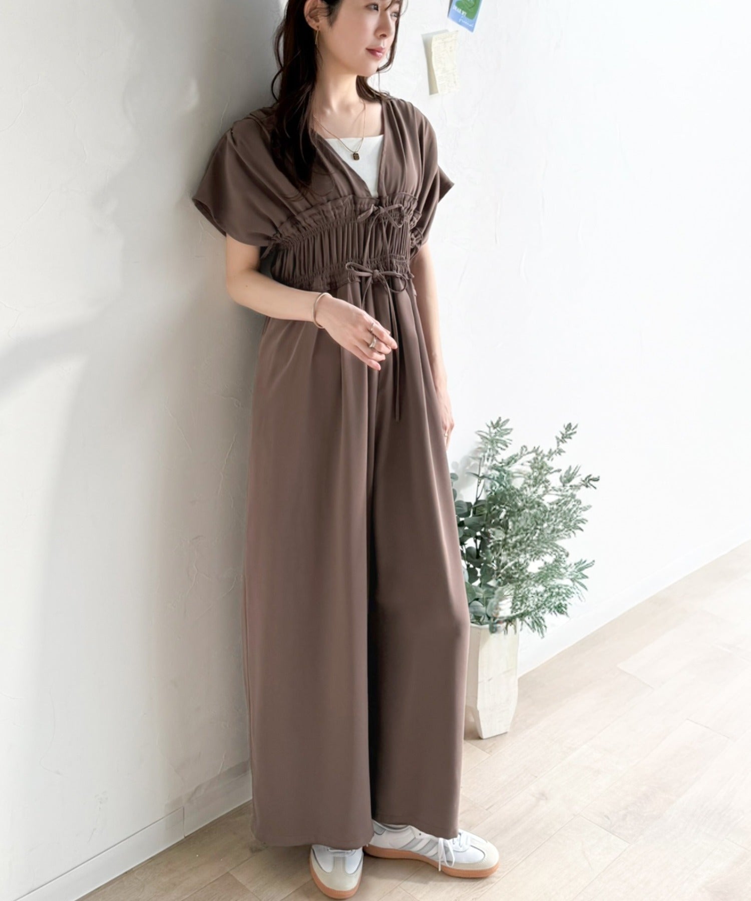 【接触冷感機能付き】一枚サラリ、サマになる。綺麗めシャーリングリボンオールインワン ce1070197