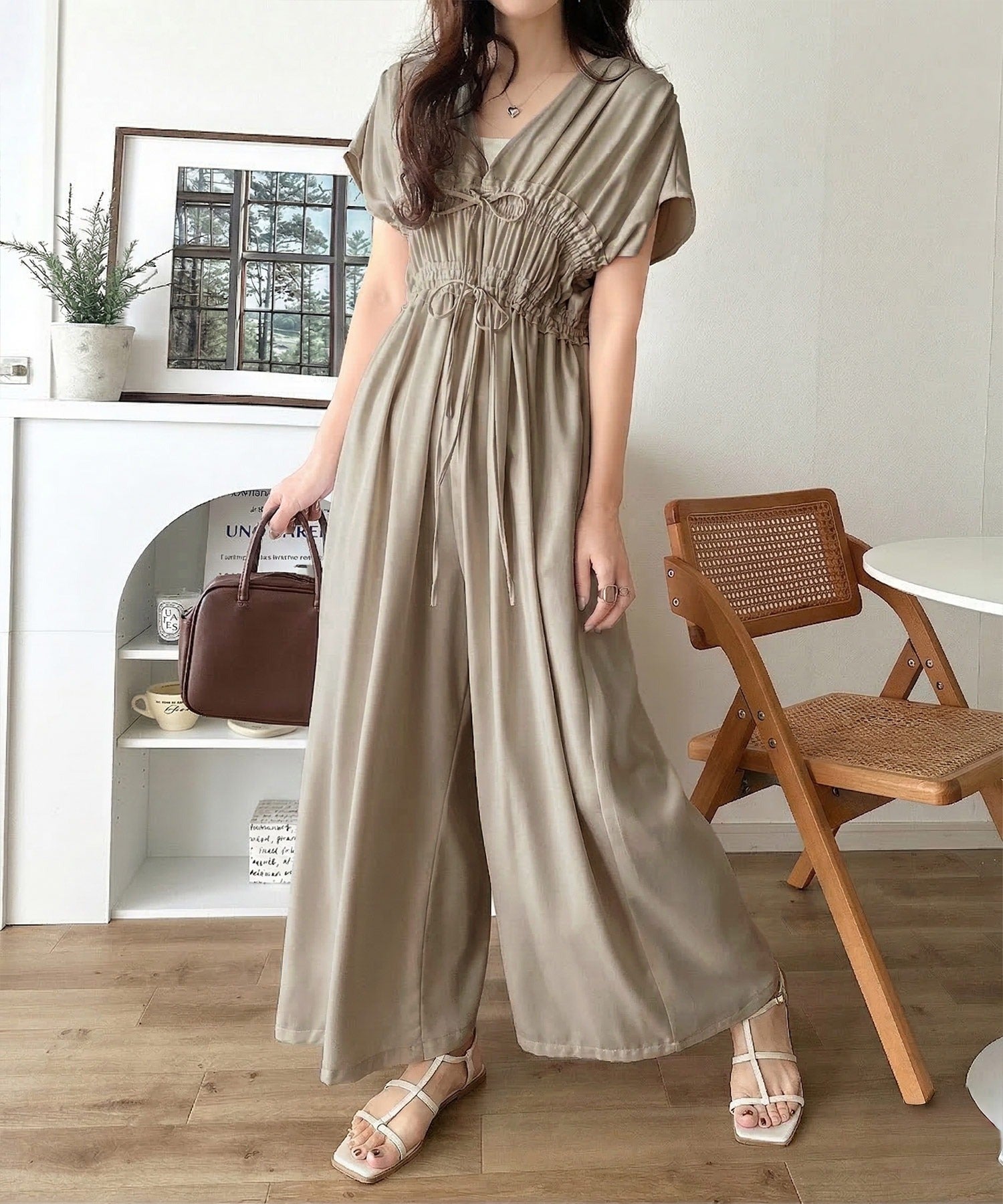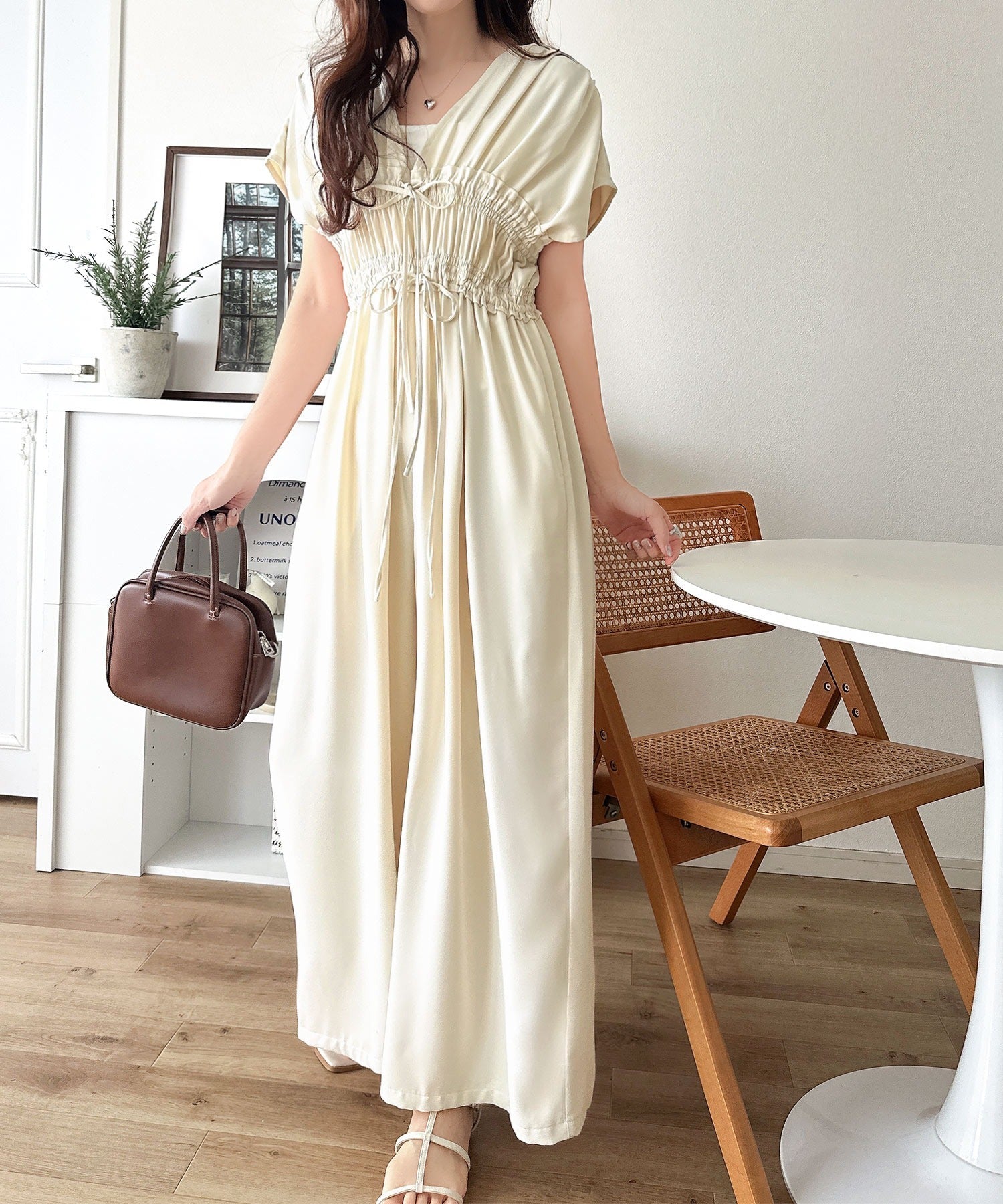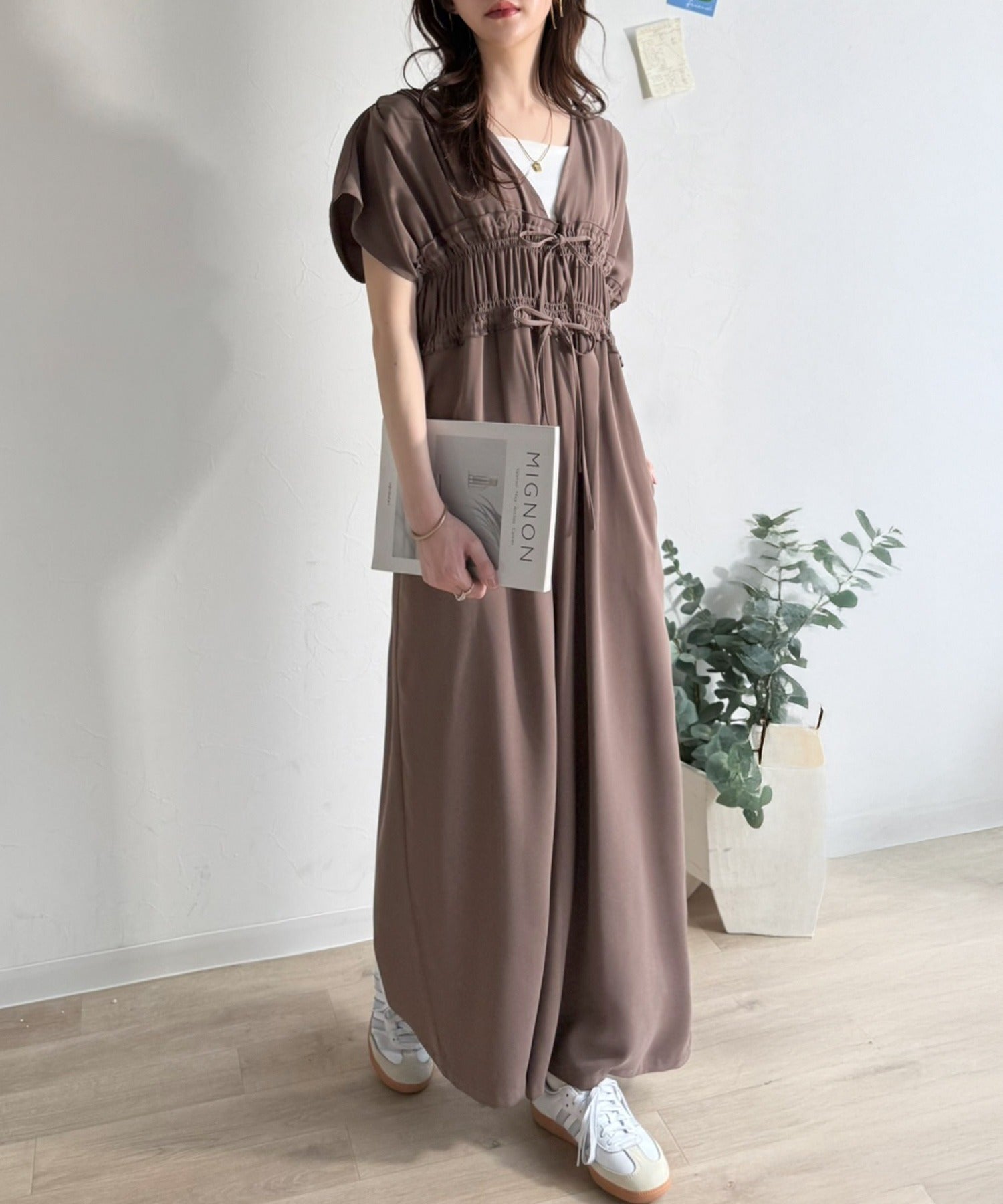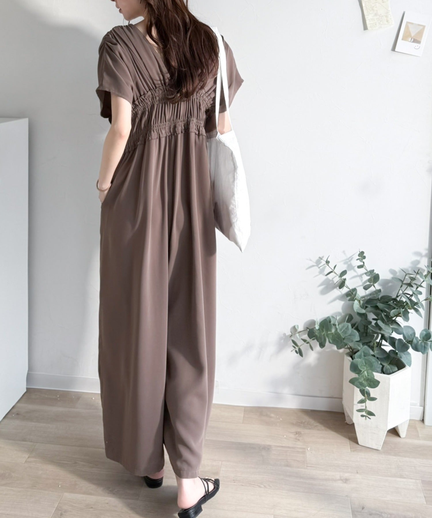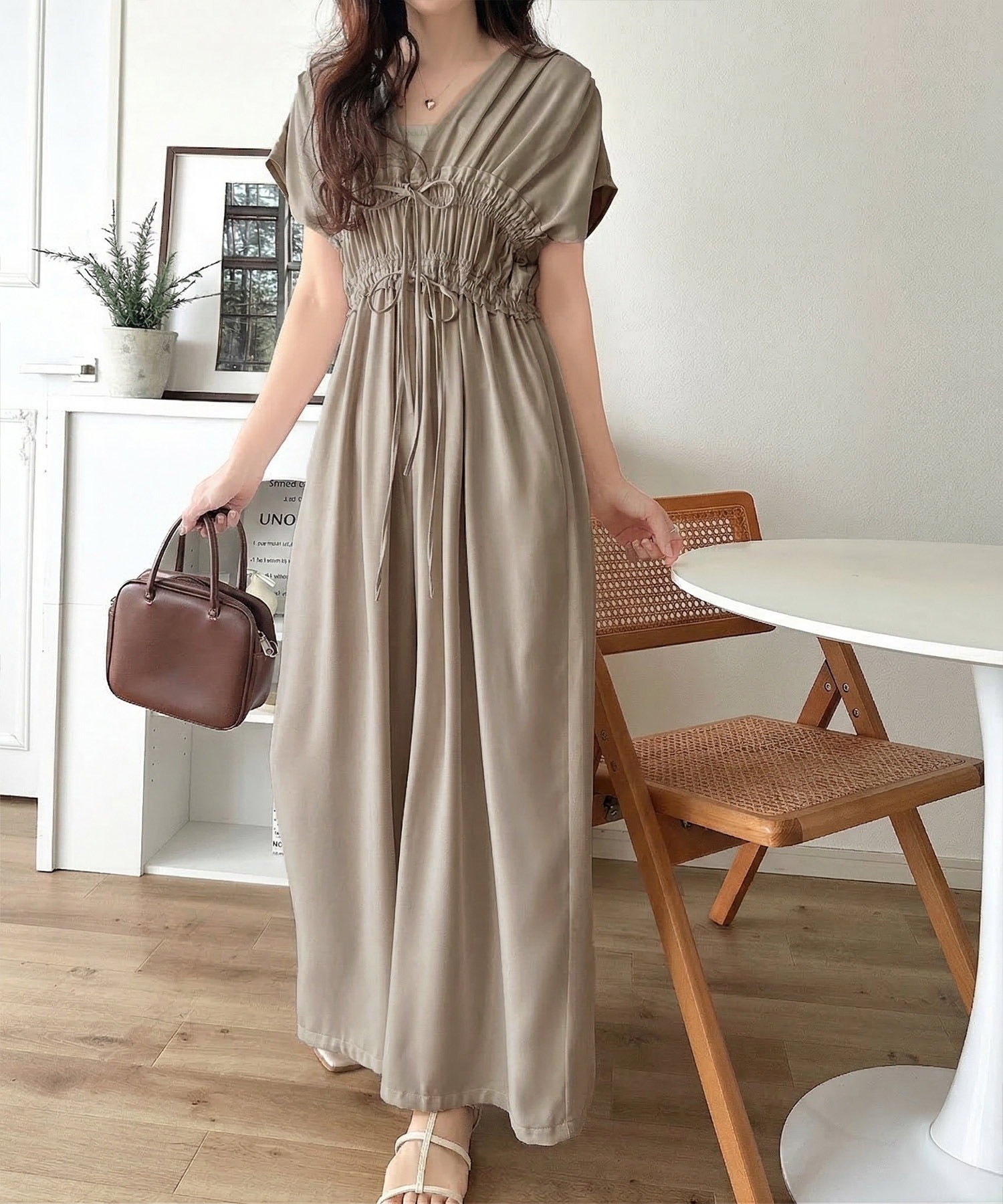 【接触冷感機能付き】一枚サラリ、サマになる。綺麗めシャーリングリボンオールインワン ce1070197