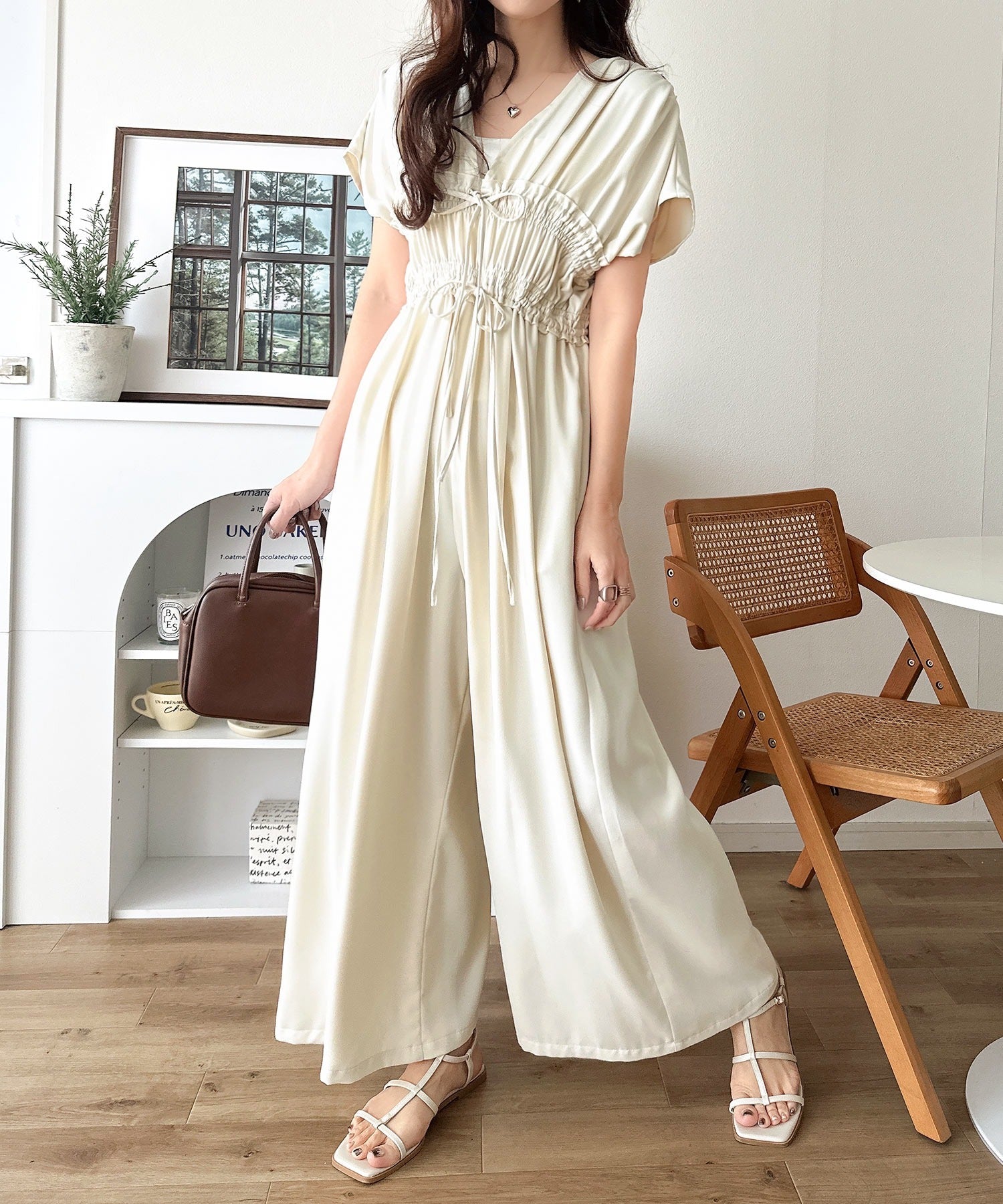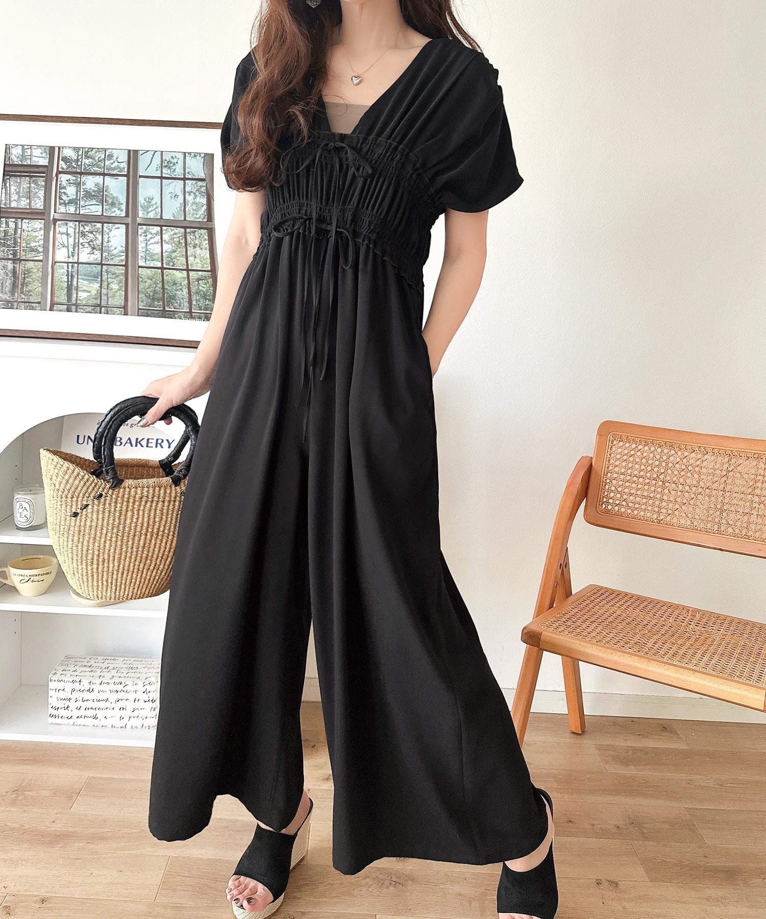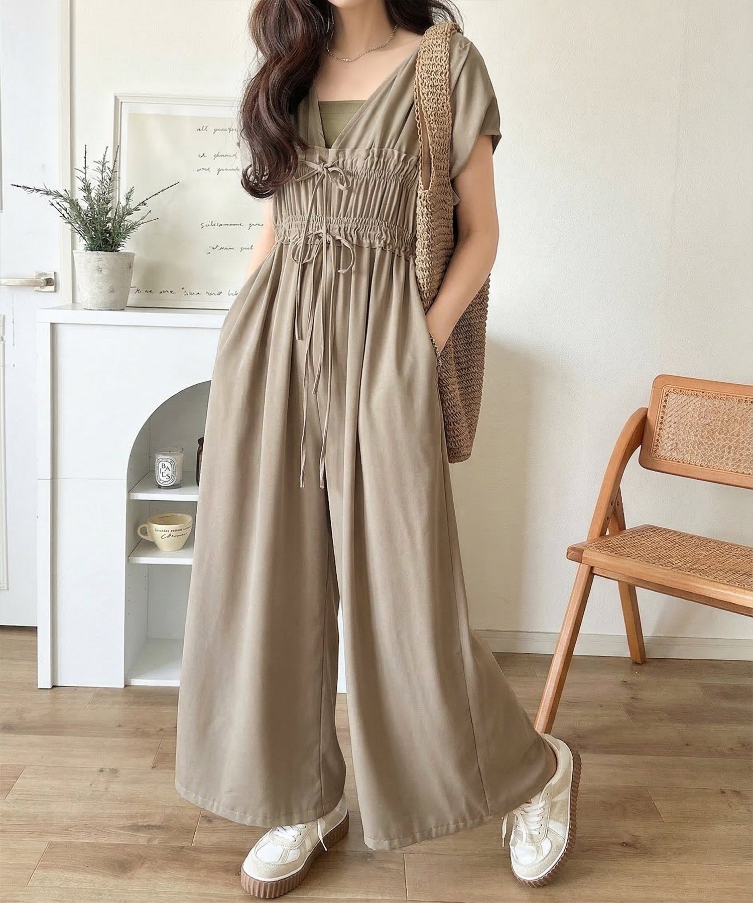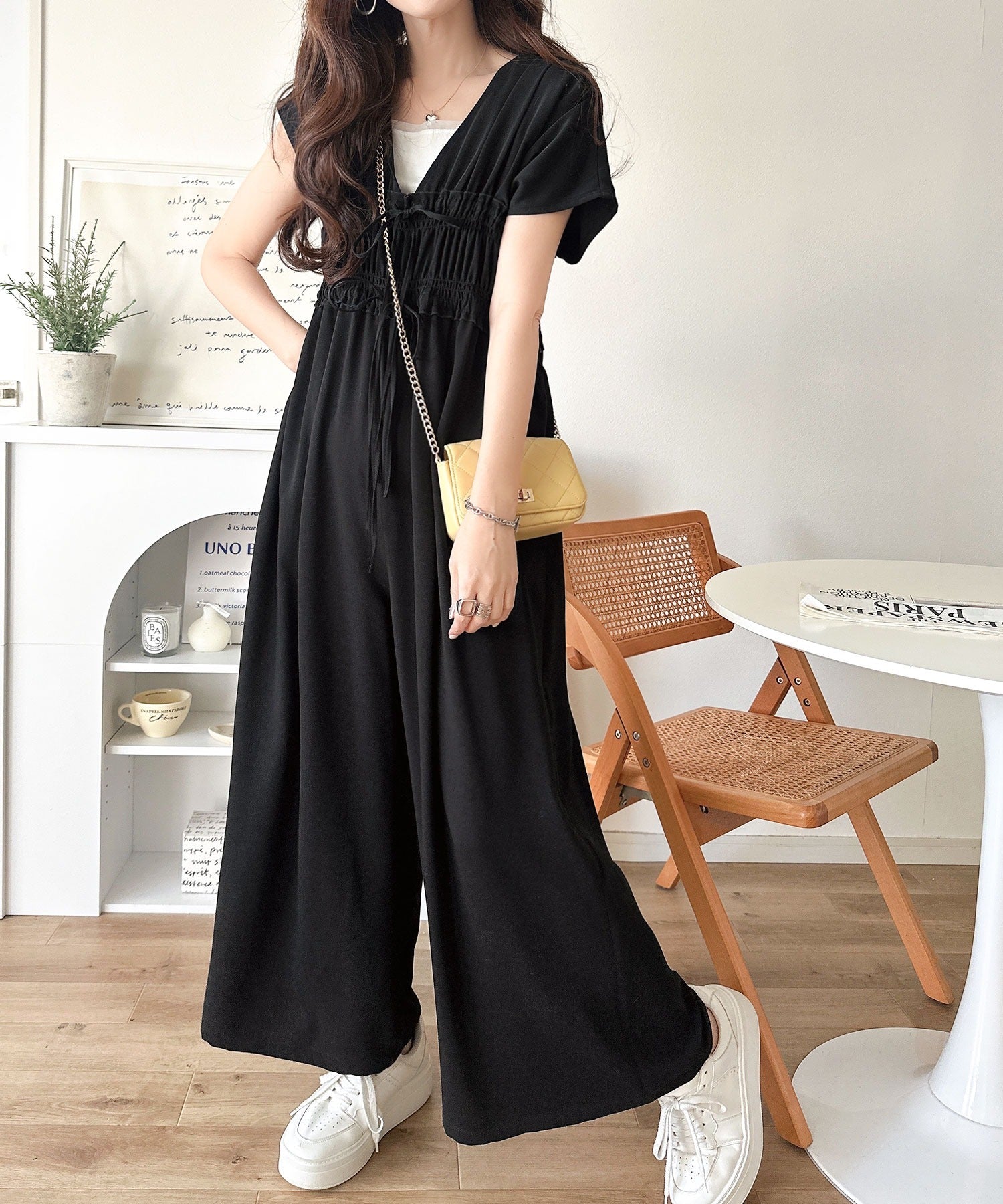 【接触冷感機能付き】一枚サラリ、サマになる。綺麗めシャーリングリボンオールインワン ce1070197