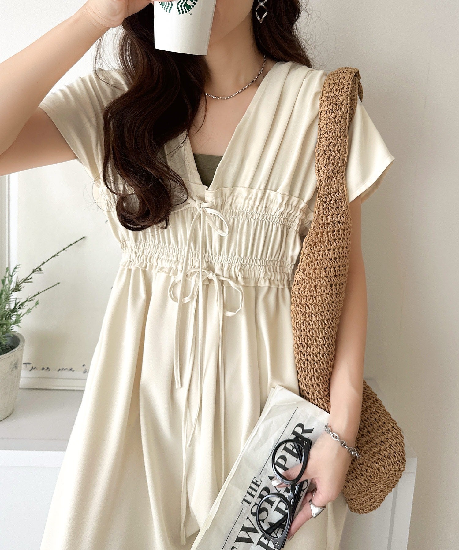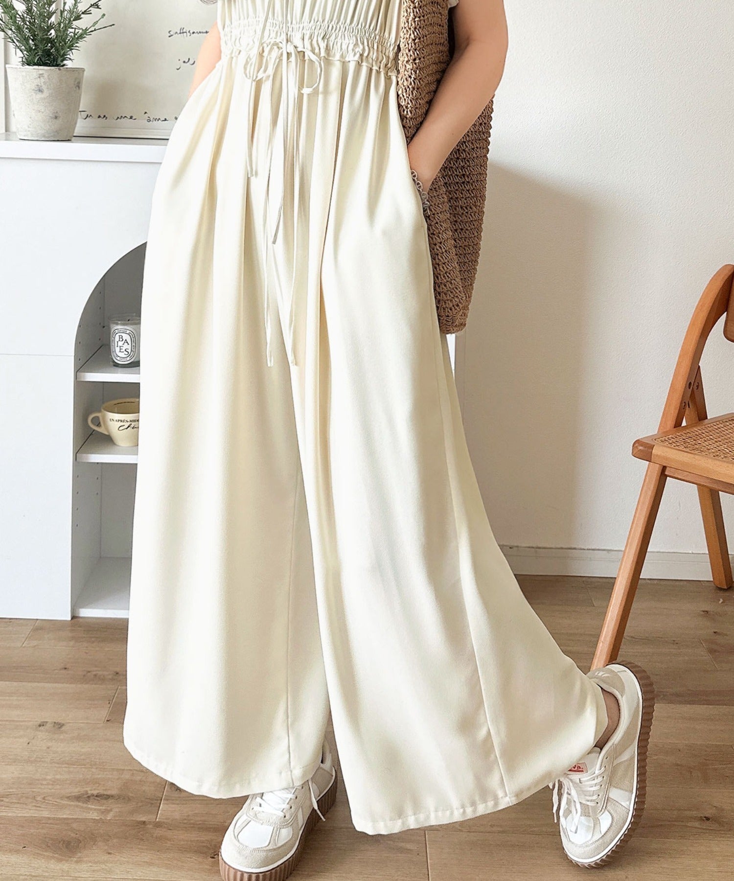 ハットや春夏素材のバッグとを合わせれば、少しカジュアルスタイルに。