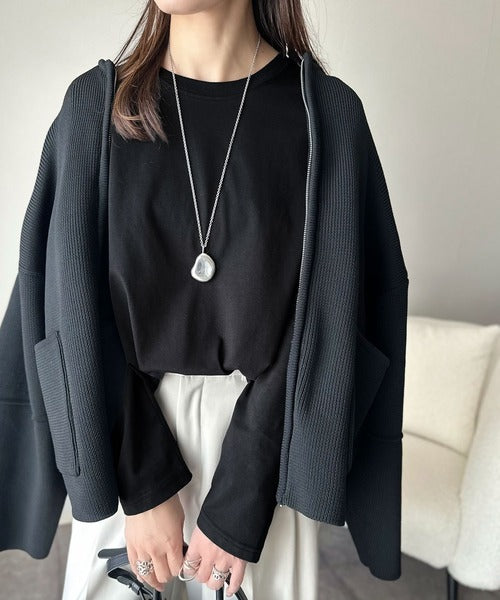 ヒップにかかる少し長めの着丈と、ラインを拾わないゆるめのシルエットで、体型カバーにも◎