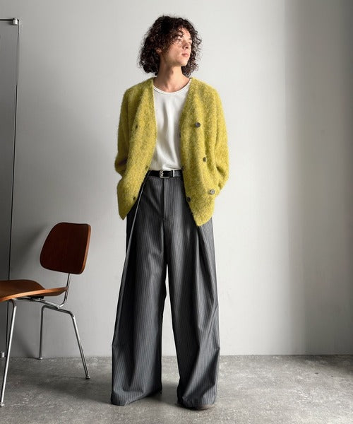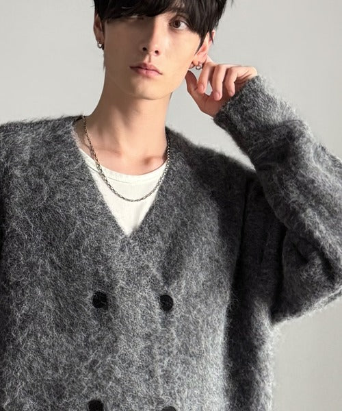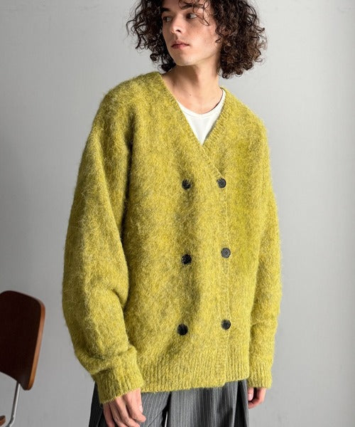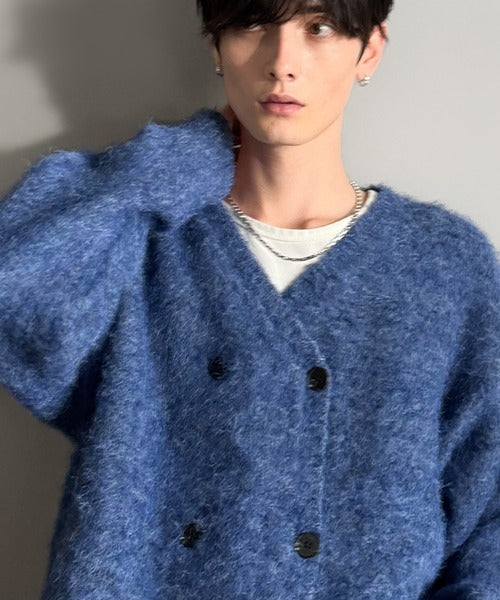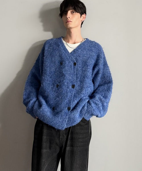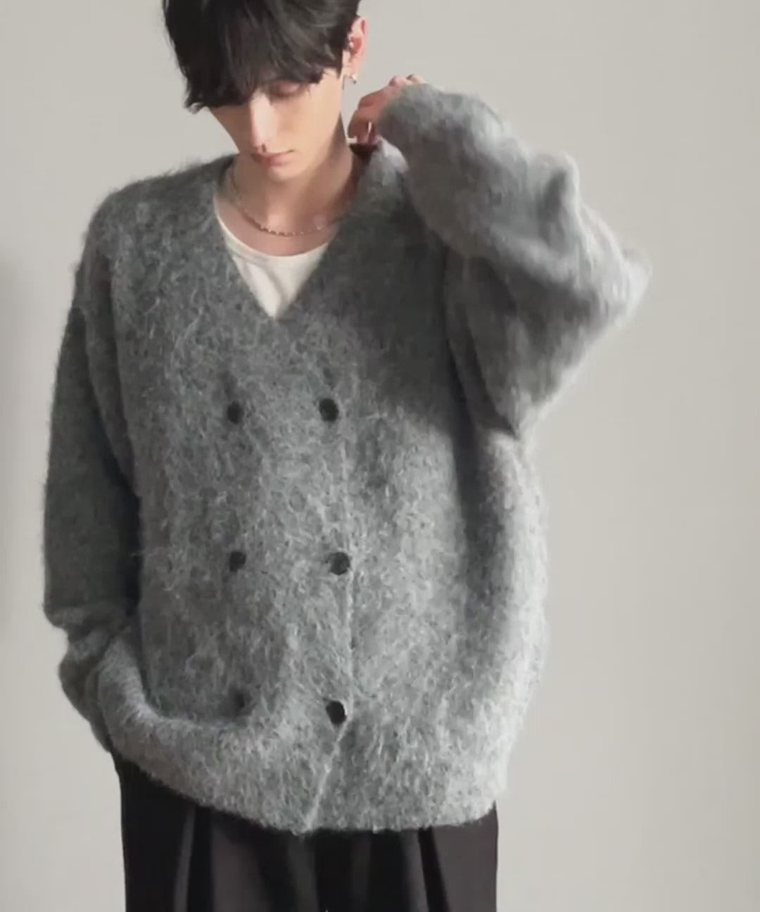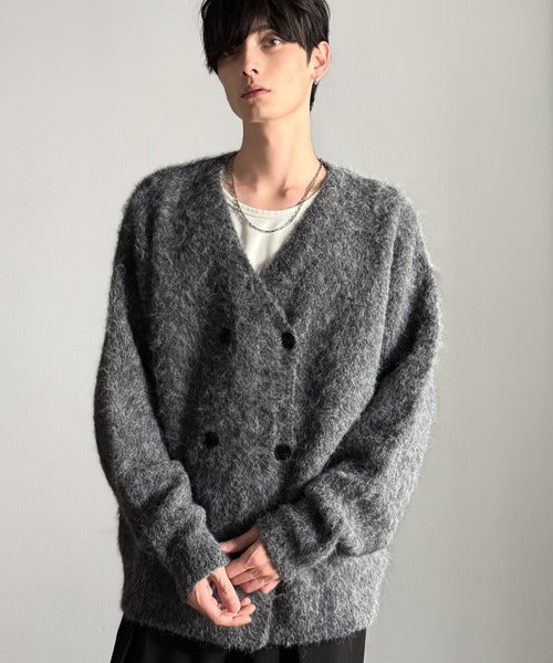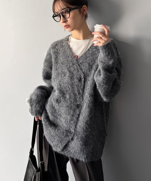 ミックスシャギー素材を使用した、ダブルテーラード仕立てのニットカーディガン。