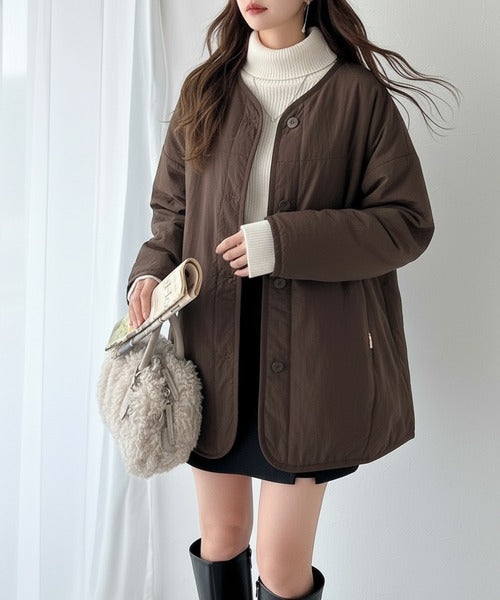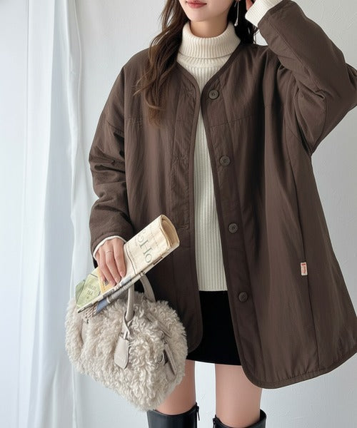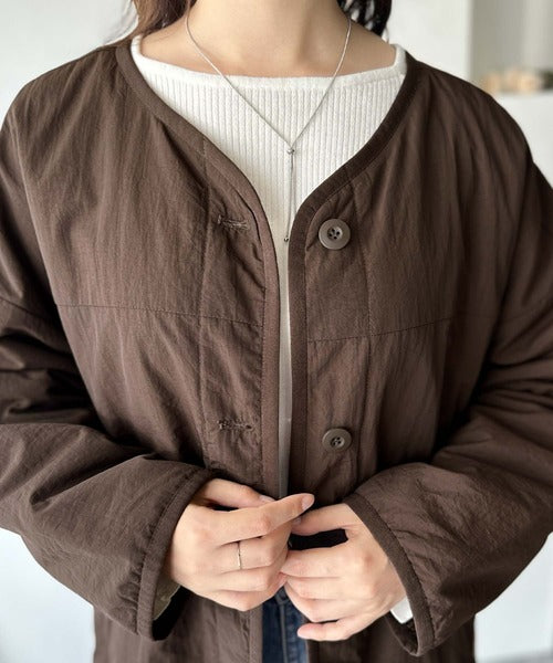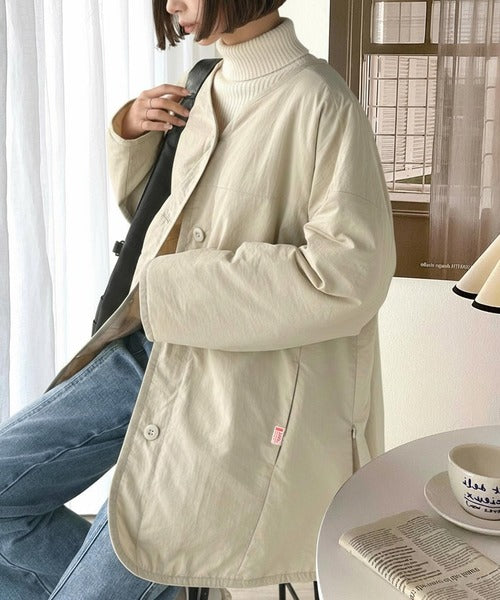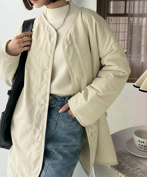 着るだけで今っぽく、かつシンプルに決まるノーカラー中綿ジャケット。