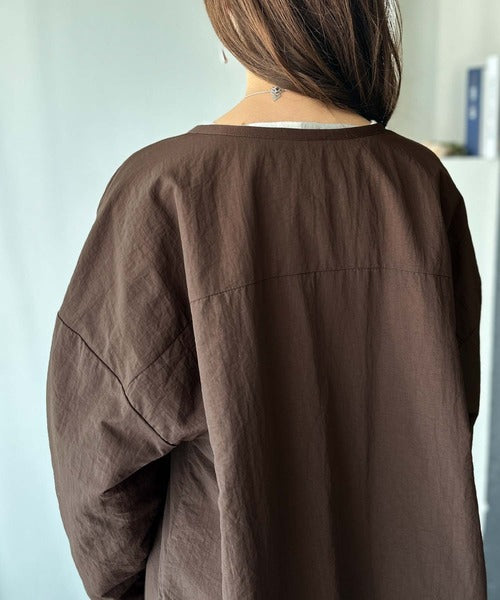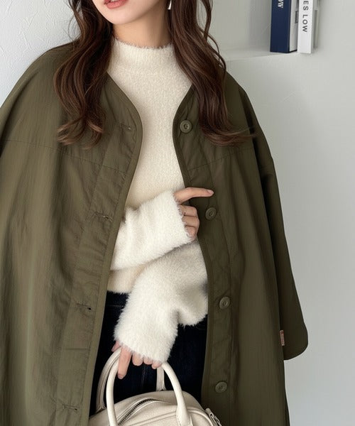襟なしデザインなので、フード付きパーカーやタートルとの相性も抜群◎