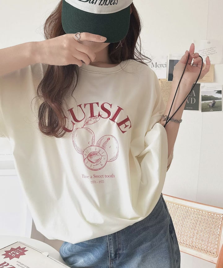 フルーツグラフィックが可愛いオーバーサイジングのTシャツ。