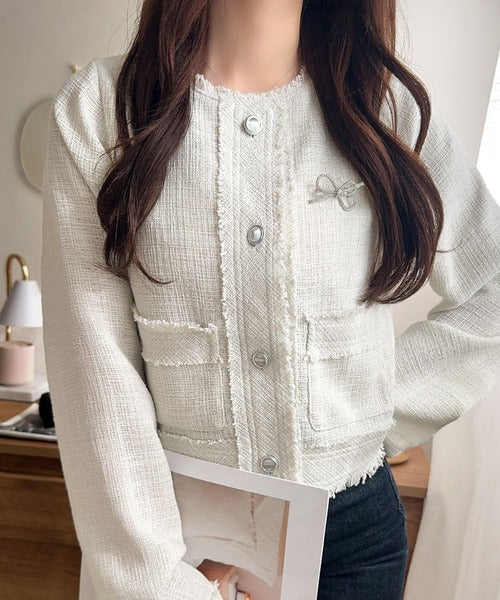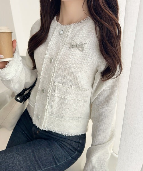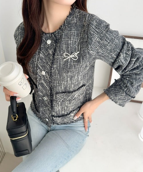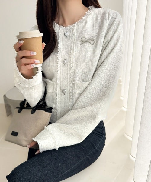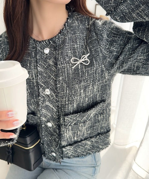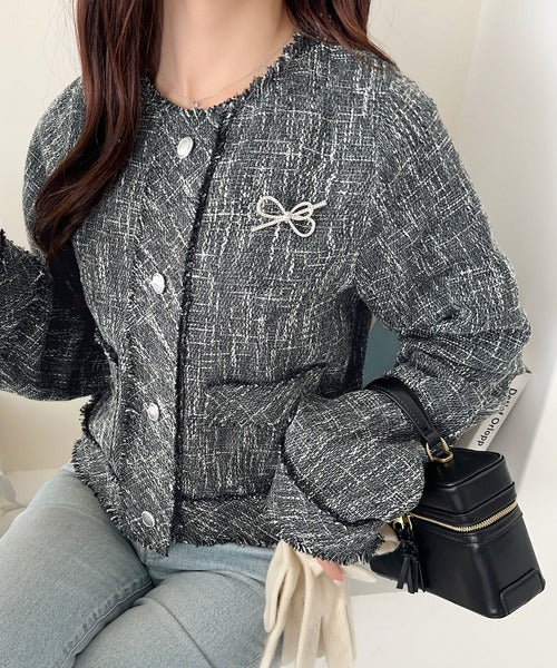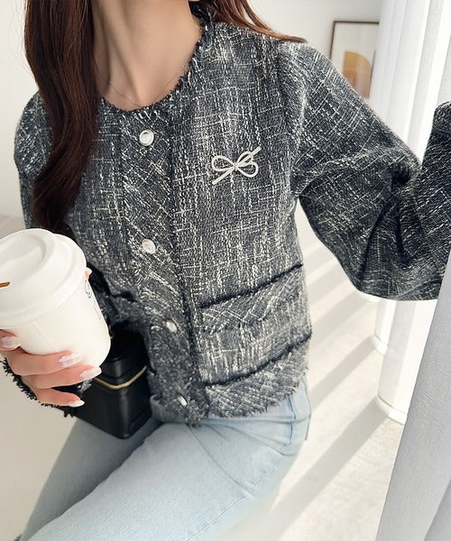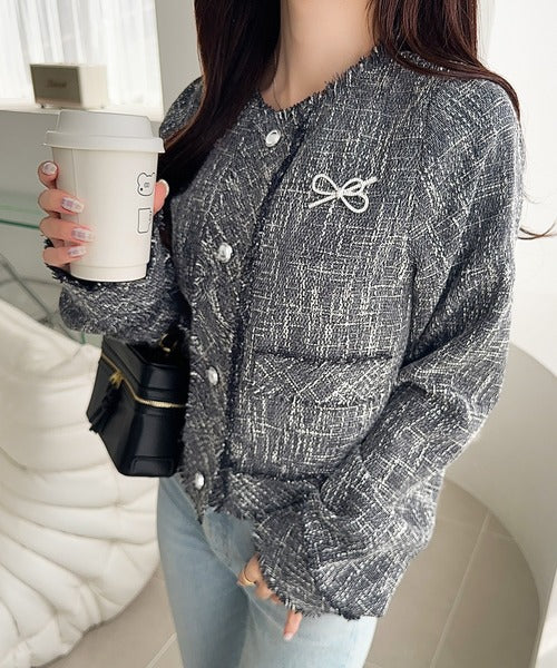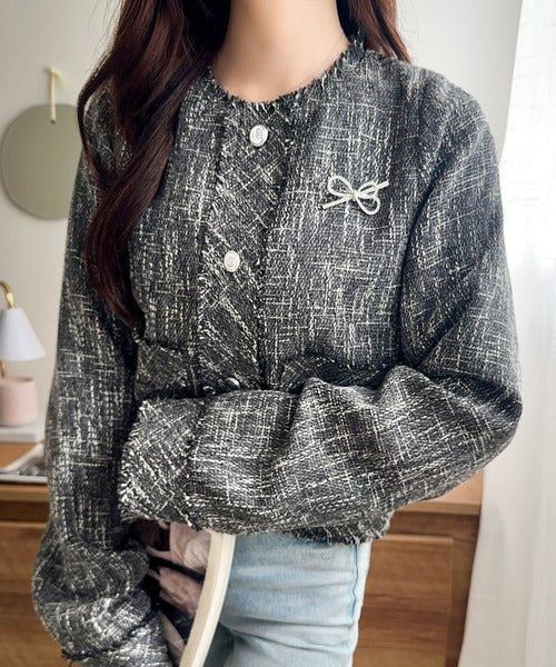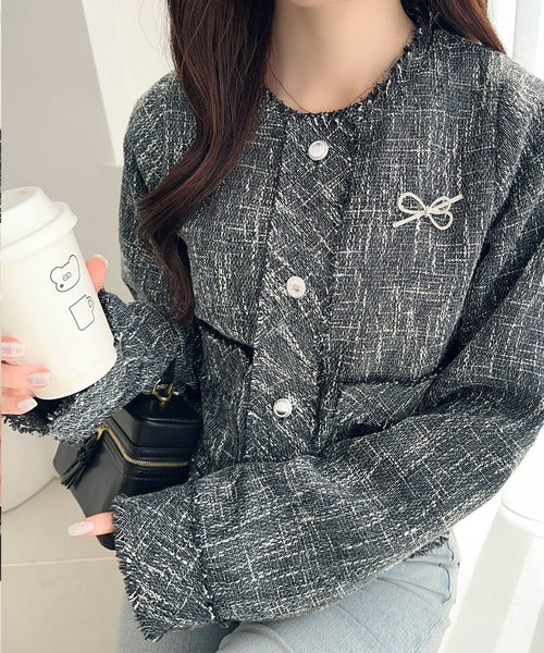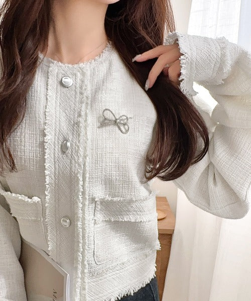きらめく魔法に甘さを添えて♪リボンブローチ使い長袖ラメ入りツイードジャケット(フォーマル) mi1019111