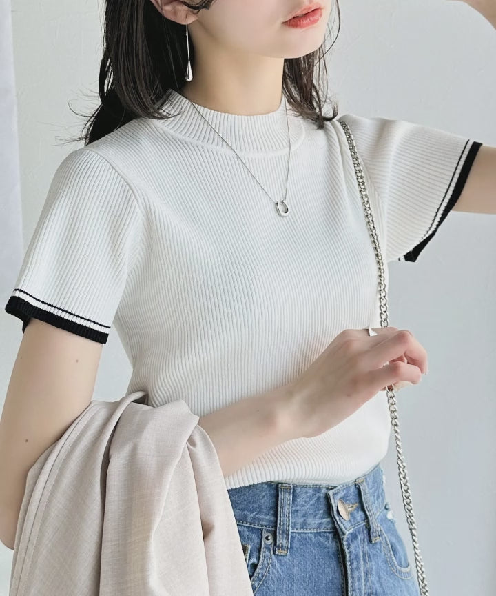 大人の洗練トップス。配色フレンチスリーブボトルネックリブニット ce1020232
