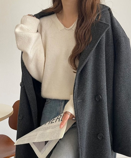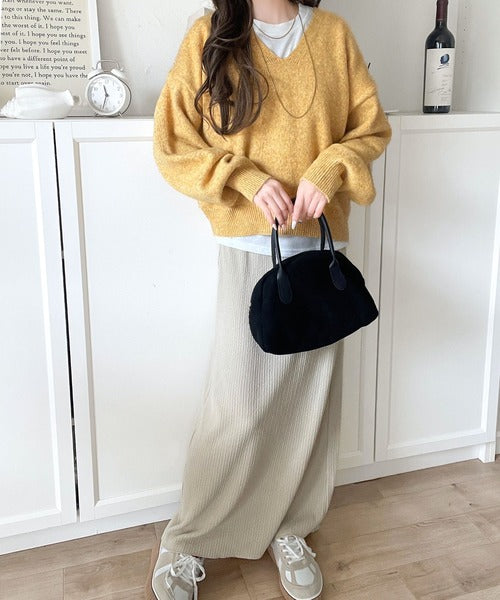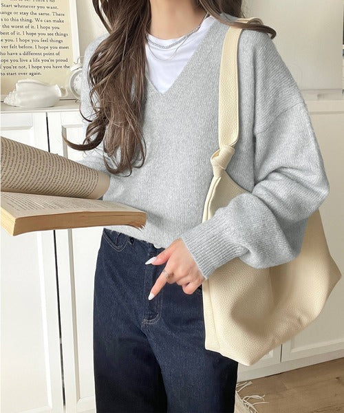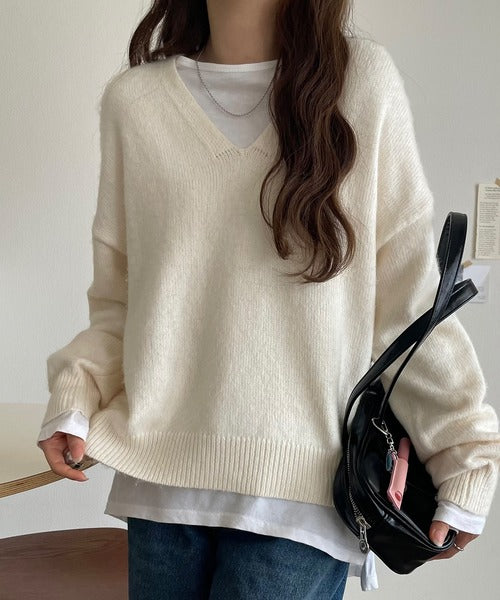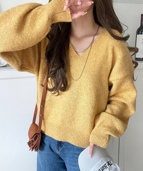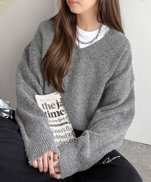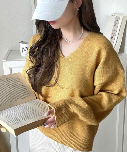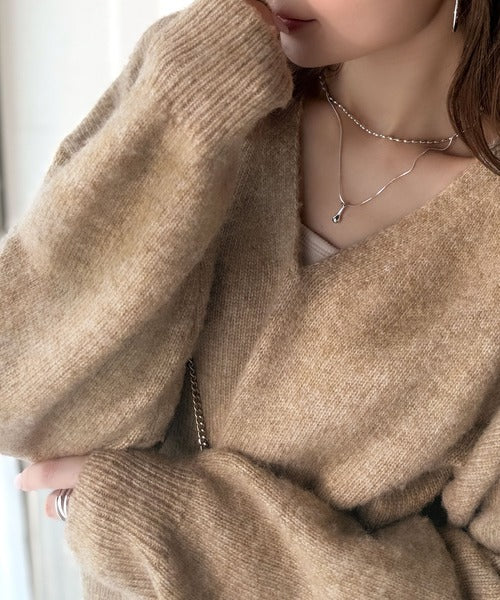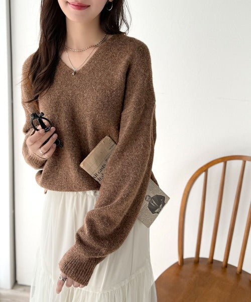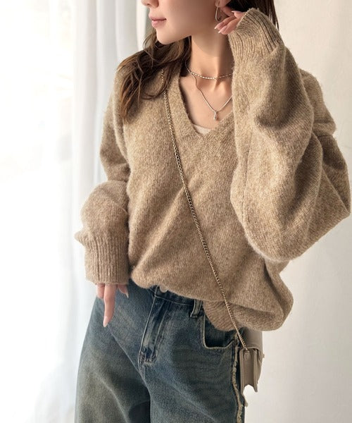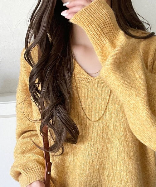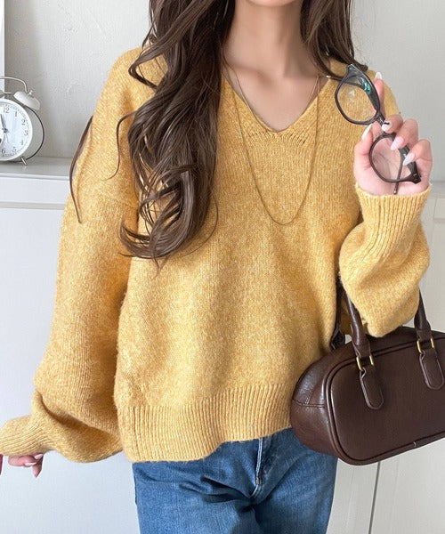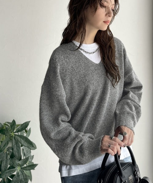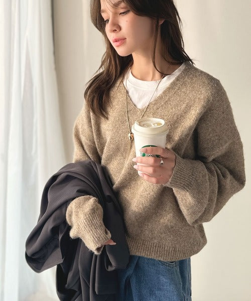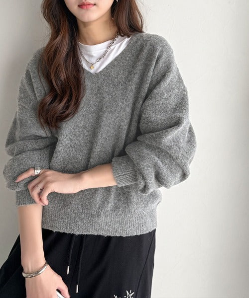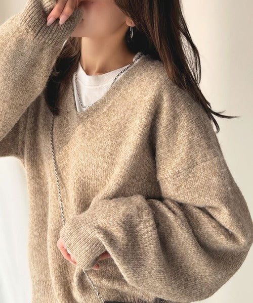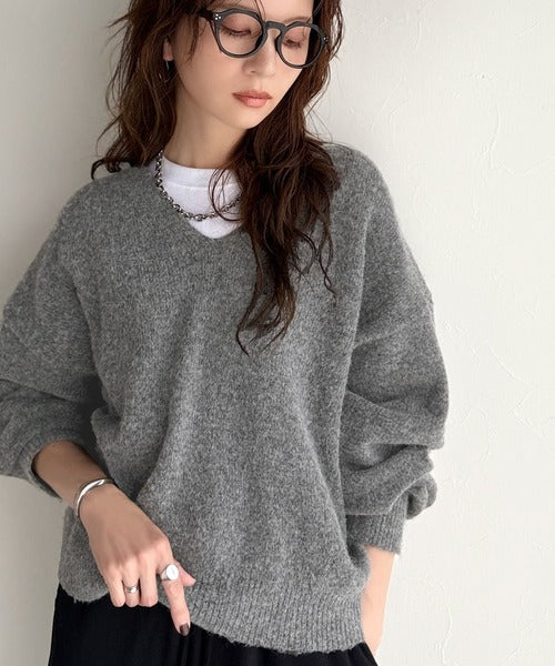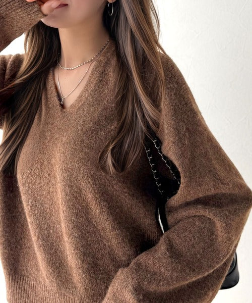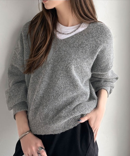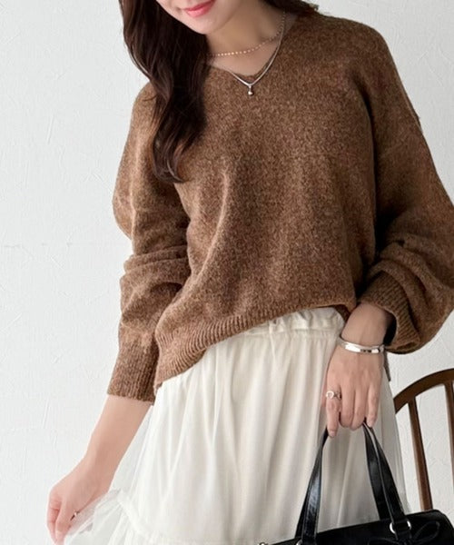 やわらかくふんわりとした質感が魅力の、メランジ調Vネックニットプルオーバー。