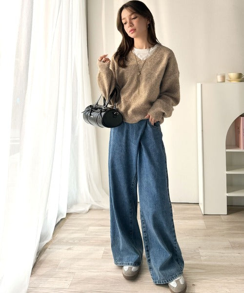 首元はすっきりと開いたVネックで、デコルテをきれいに見せつつ、抜け感のある大人な印象に。