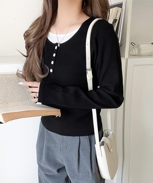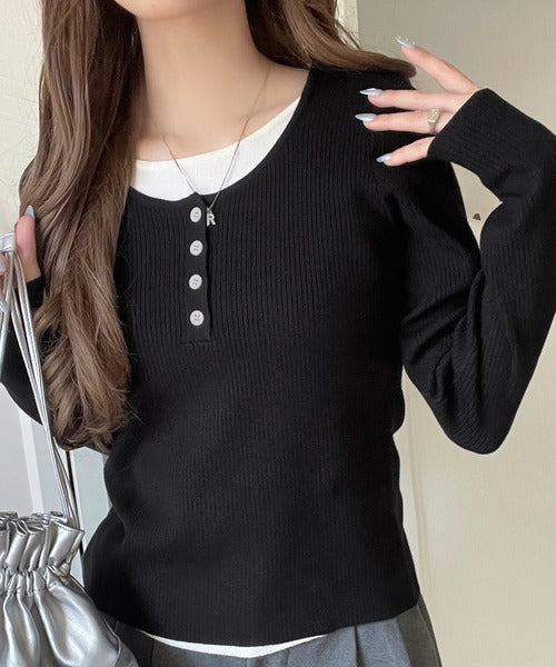 レイヤード風のフェイクデザインが、視線を引きつけるプルオーバーニット。