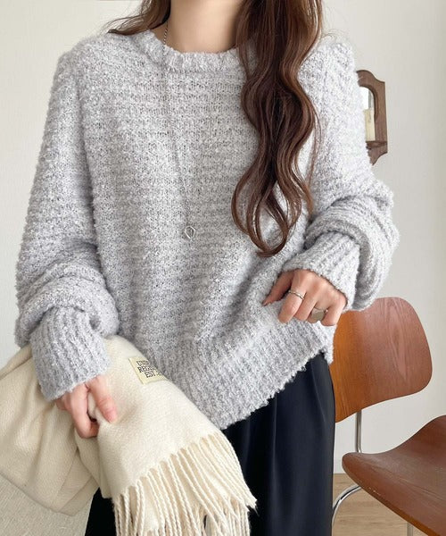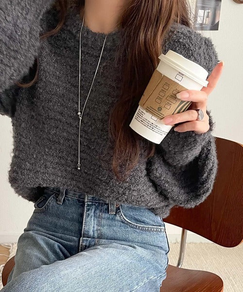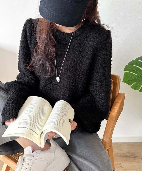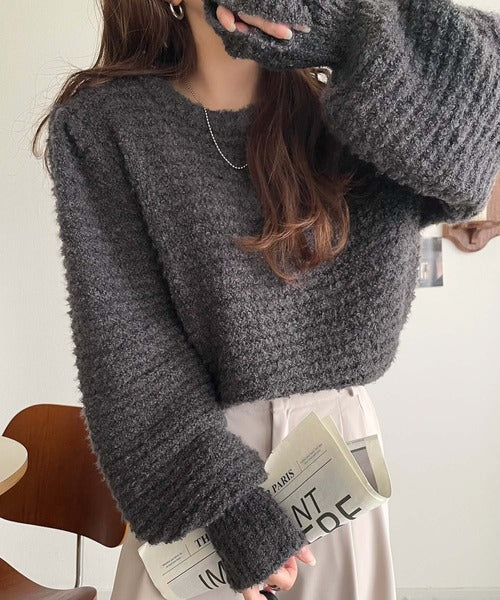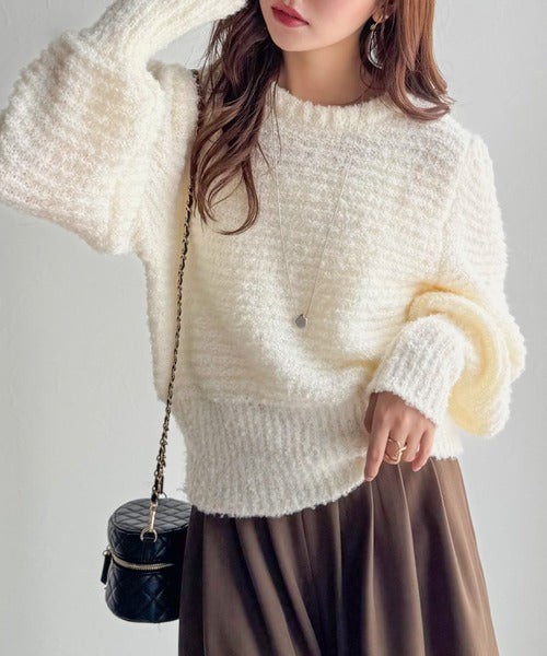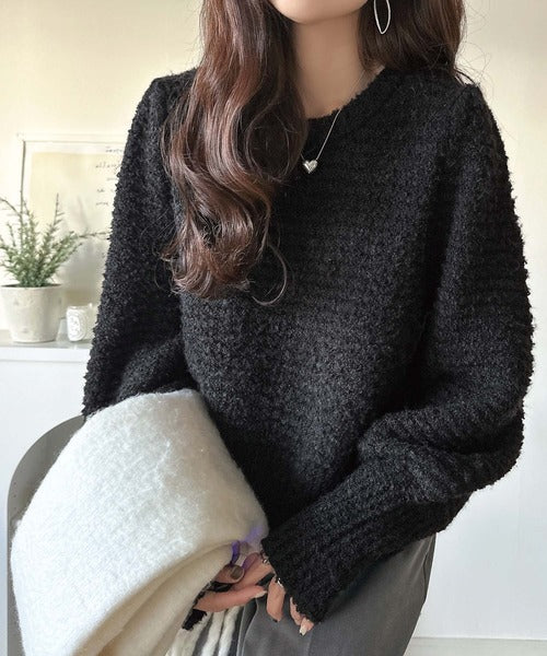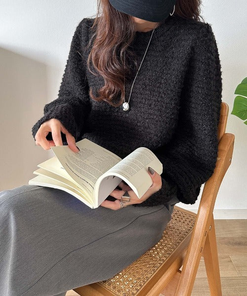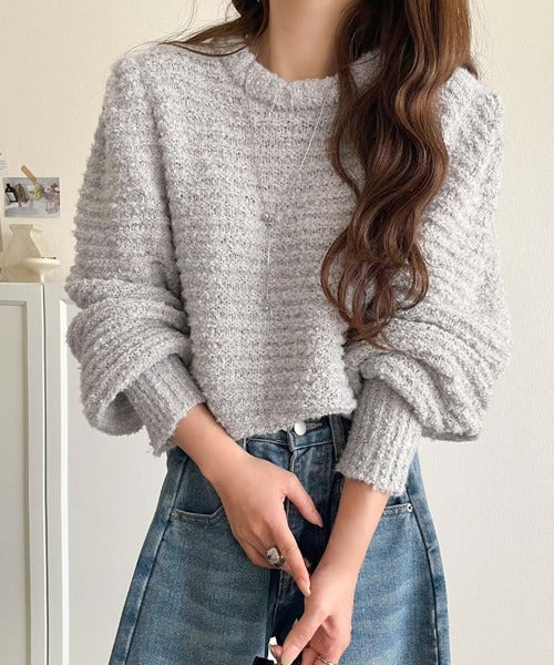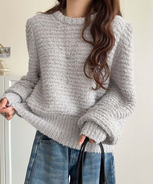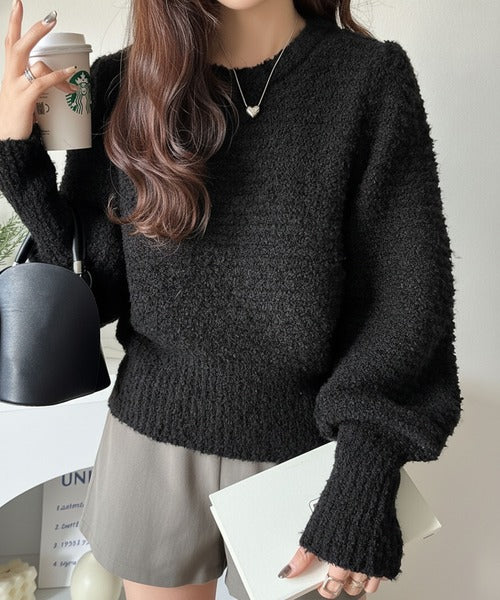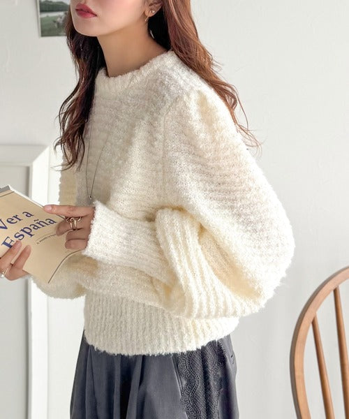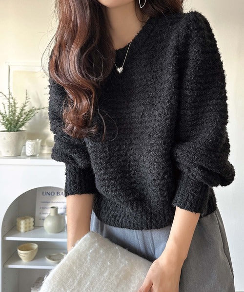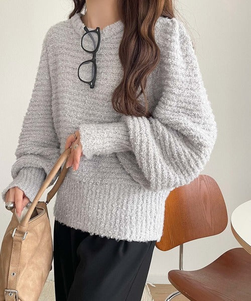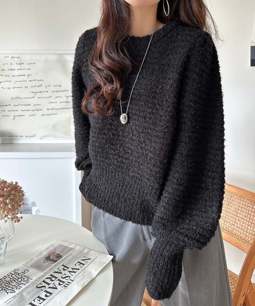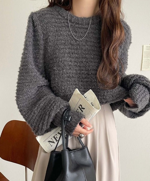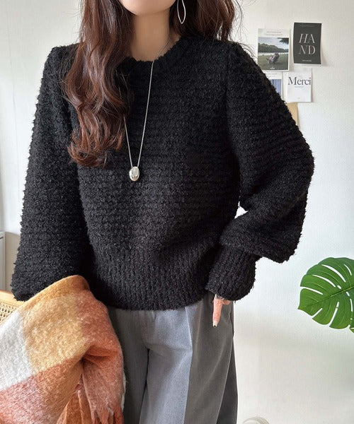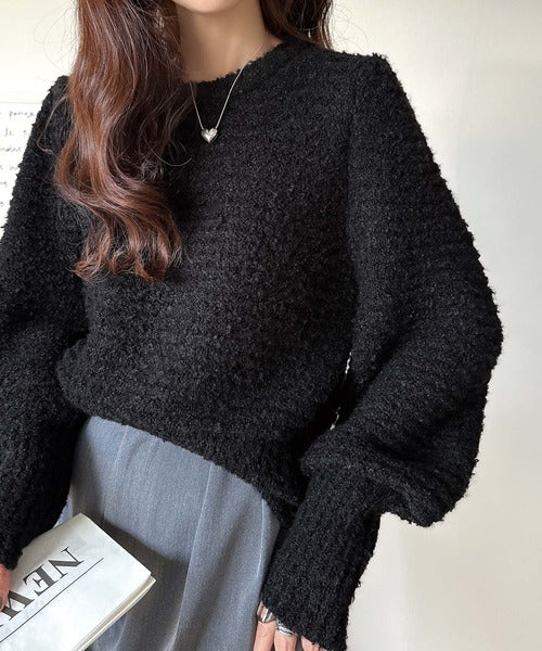 ふんわり感が特徴のブークレー糸を使用したぽわん袖クルーネックニット。