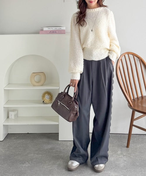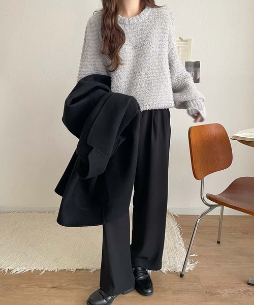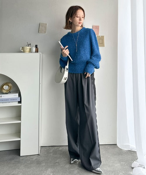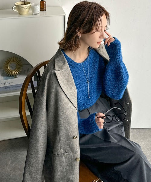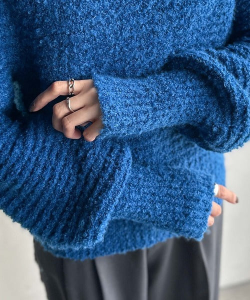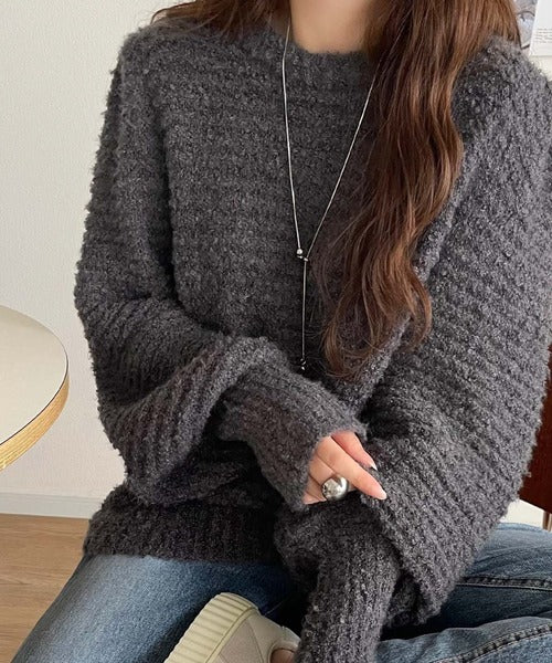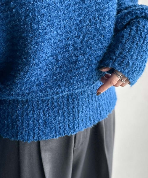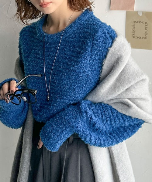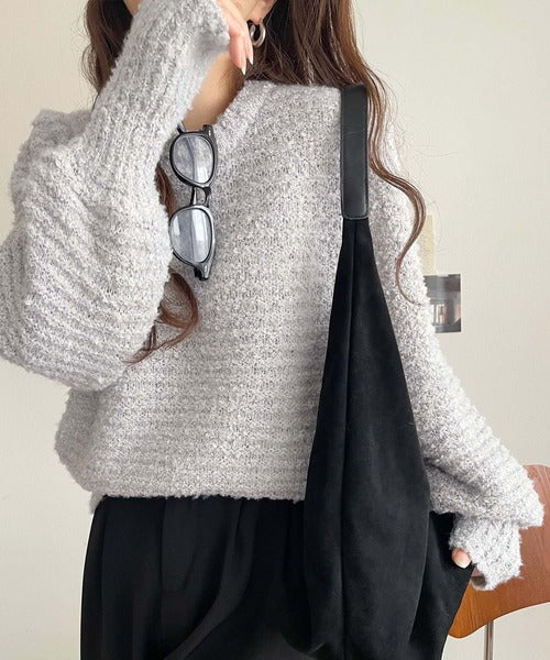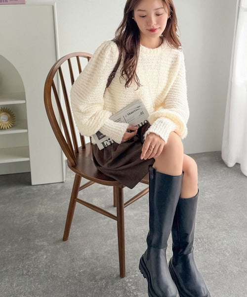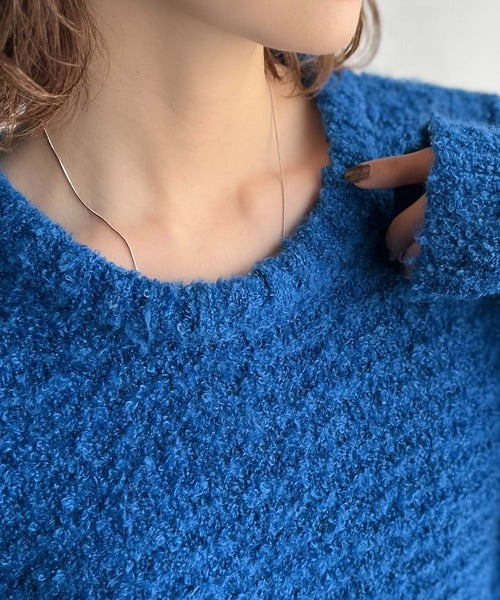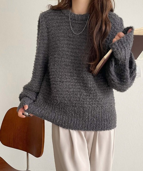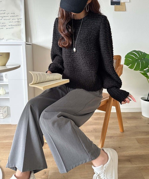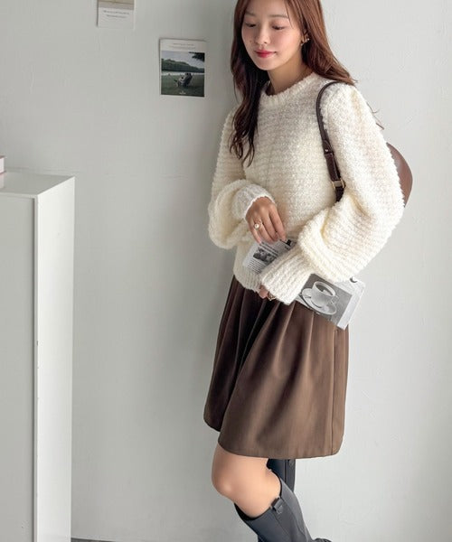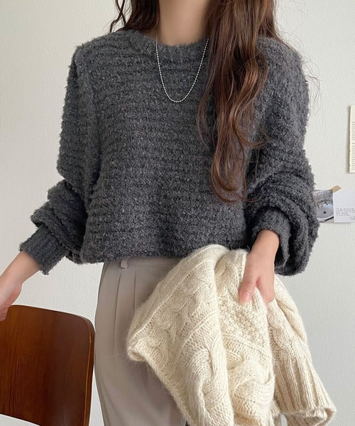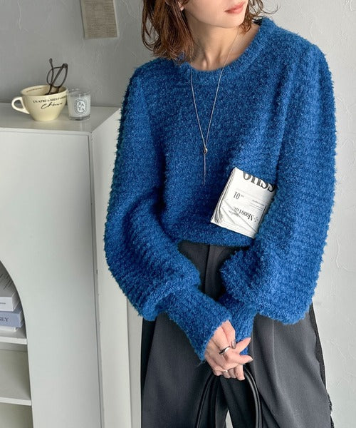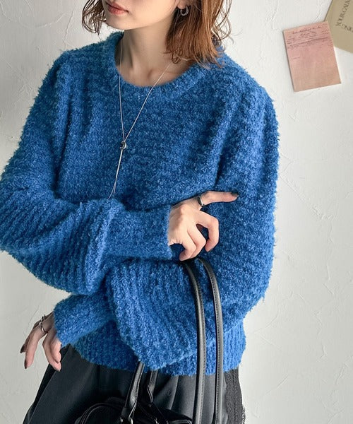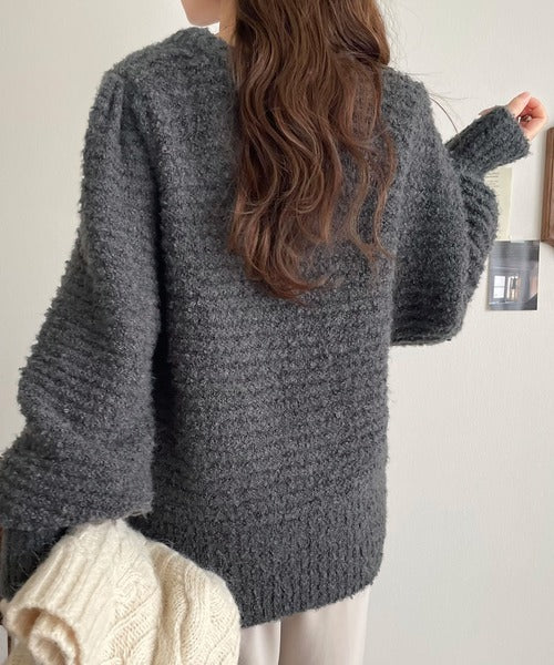 ふんわり感が特徴のブークレー糸を使用したぽわん袖クルーネックニット。