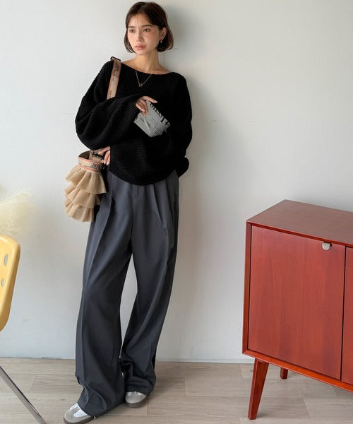 シンプルな中にもさりげない存在感を放つ、コクーンスリーブシンプルプルオーバーニット。
