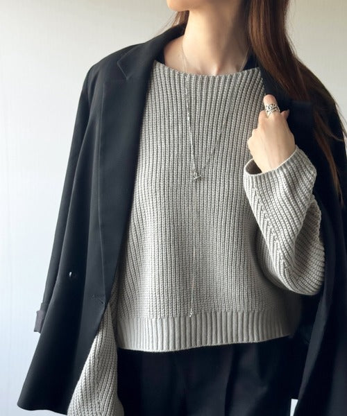 程よく肉厚な畦編みは、着るだけで立体的なシルエットをつくり、ふんわりとした袖が女性らしい柔らかさをプラスします。