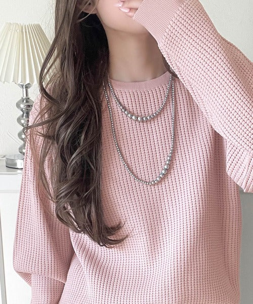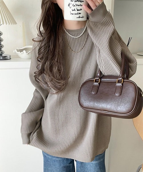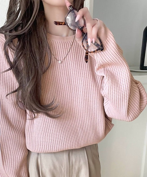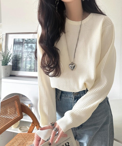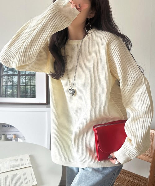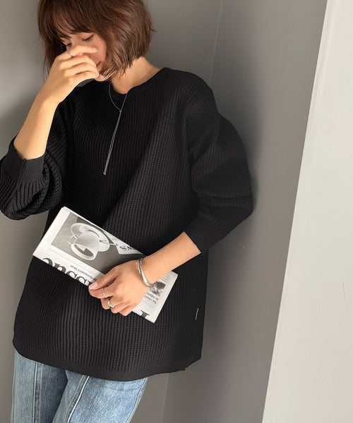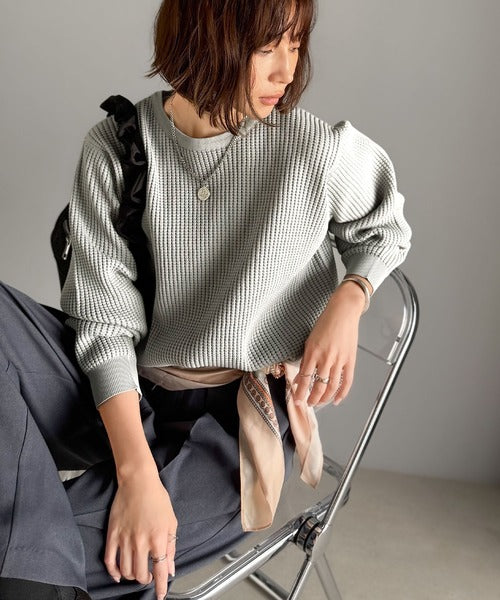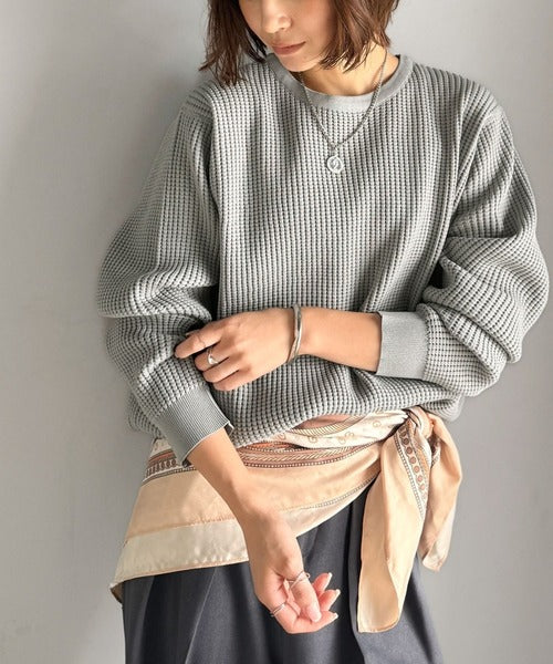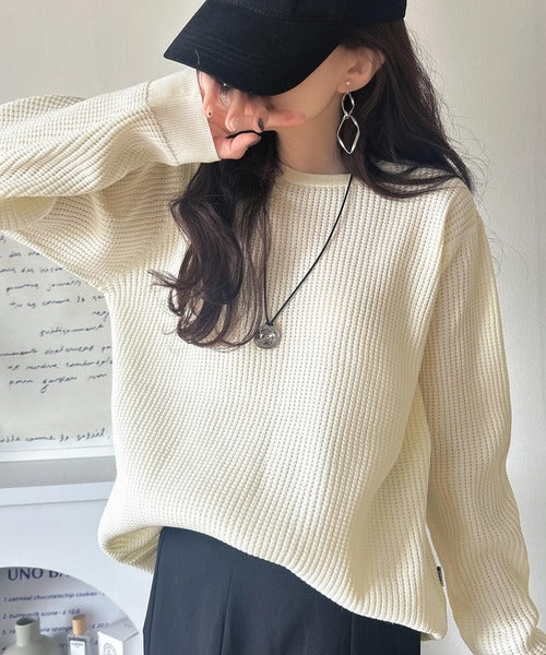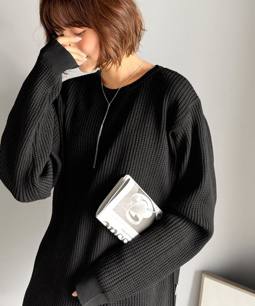 サーマルクルーネックニットは、程よい厚みと独特のワッフル編みが特徴。