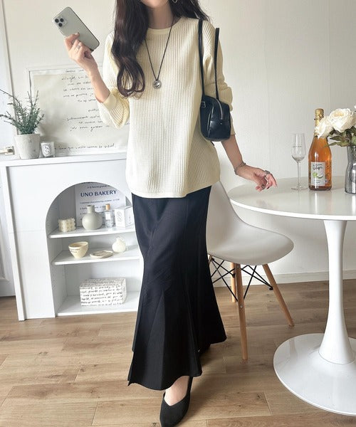 パンツにもスカートにも合わせやすい絶妙な丈感で、インでもアウトでも着こなしが決まる優秀ニット。