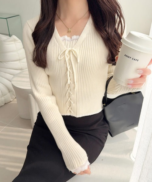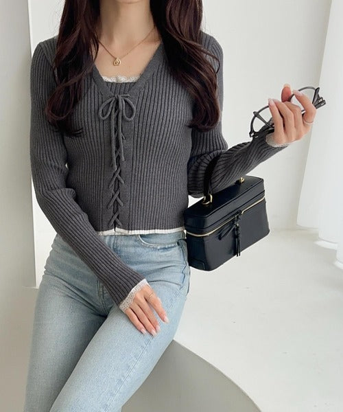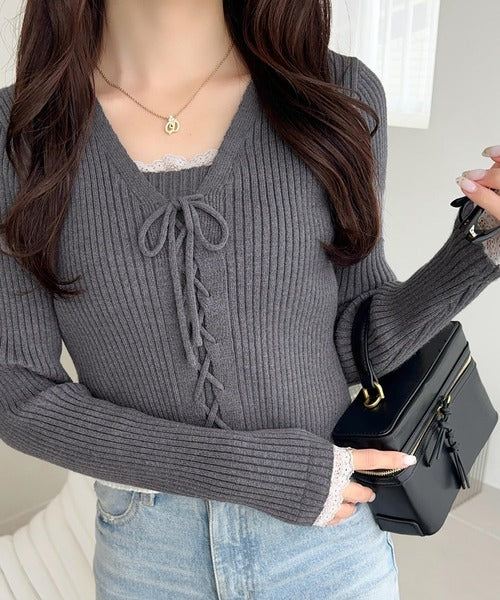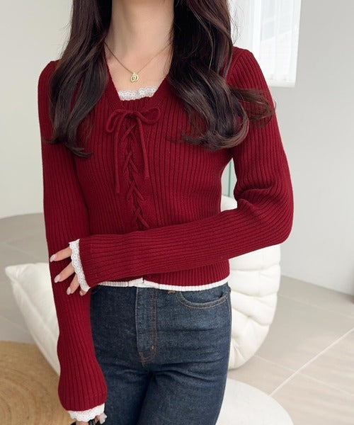 チラッと見えるレースが女性らしいデザインのリブニット♪