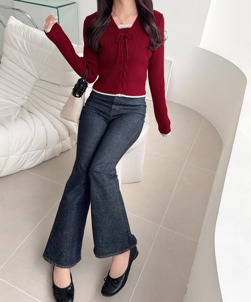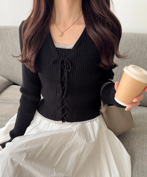 トレンド感たっぷりのレースアップデザインが目を惹くリブニットトップス。