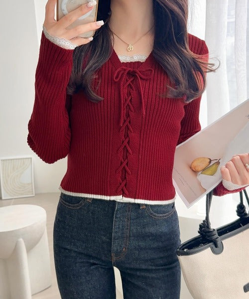 【mily bilet】レースアップで魅せる、大人フェミニン。袖レース使いリボンデザインリブニットプルオーバー mi1029158