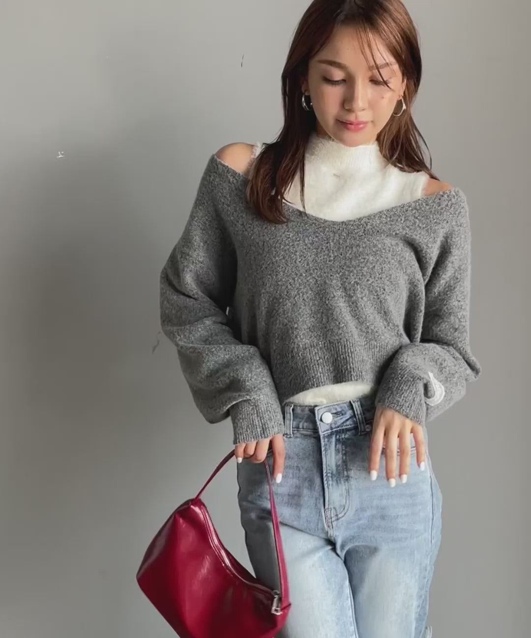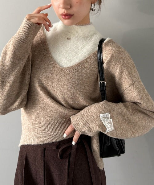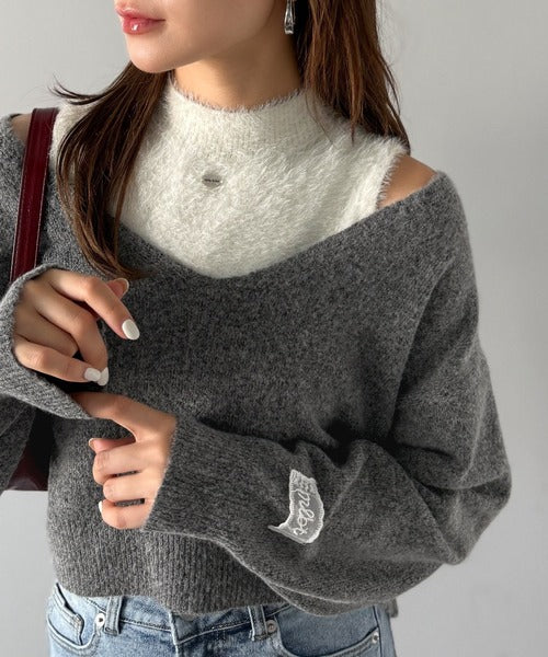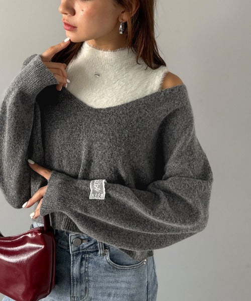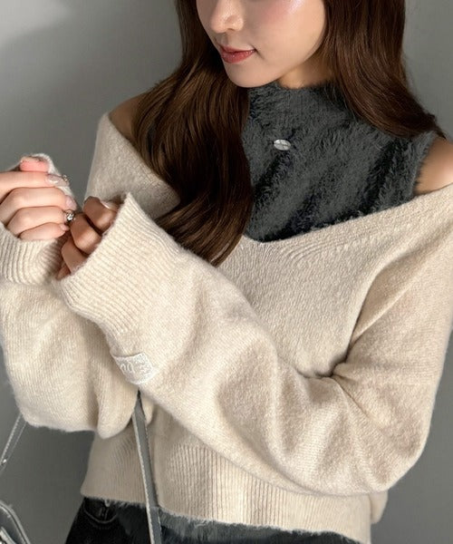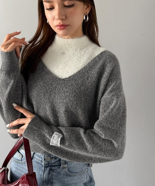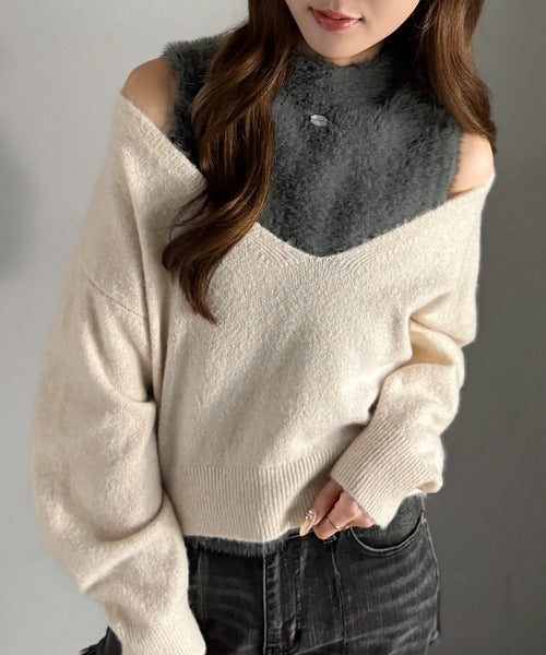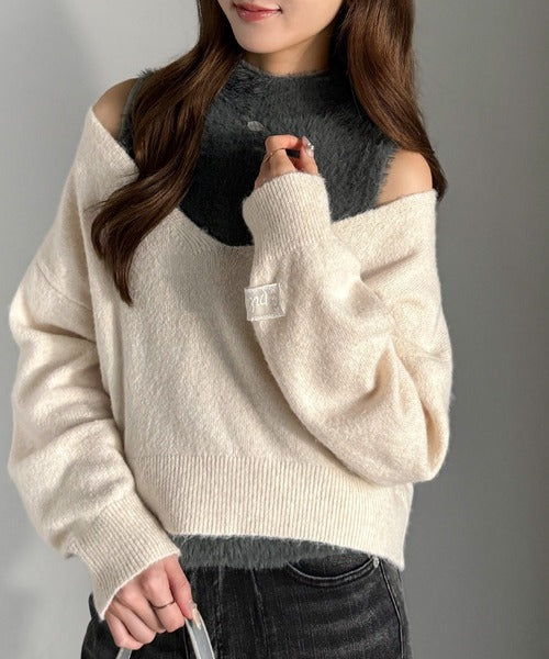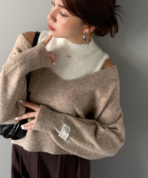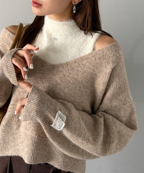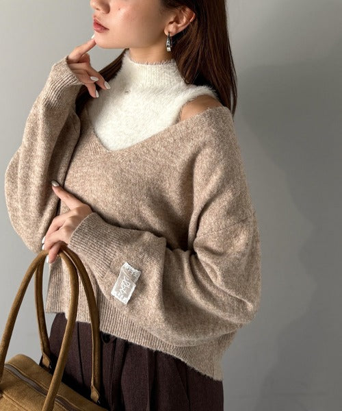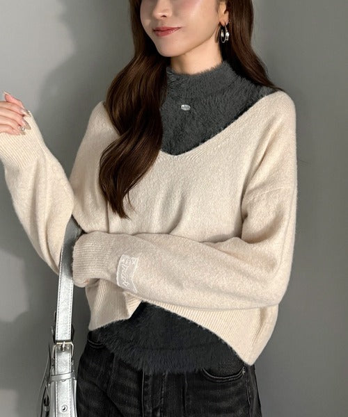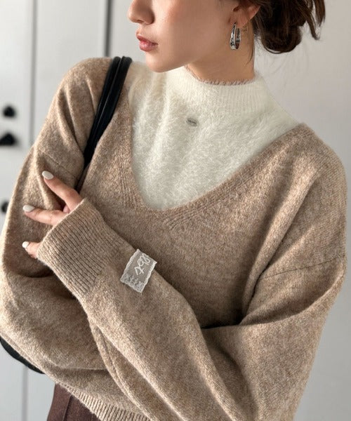 すっきりとしたVネックニットと、ふんわり毛足のあるプチハイネックフェザーニットがセットになった特別感のある一枚です!