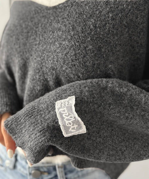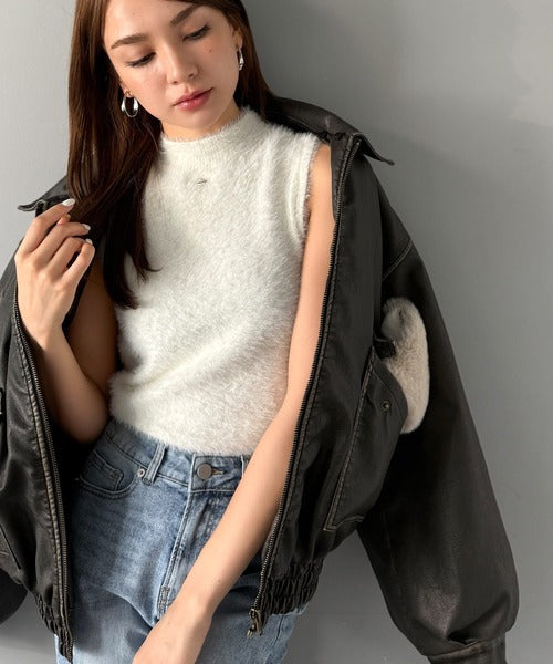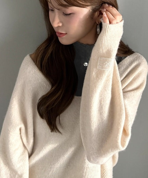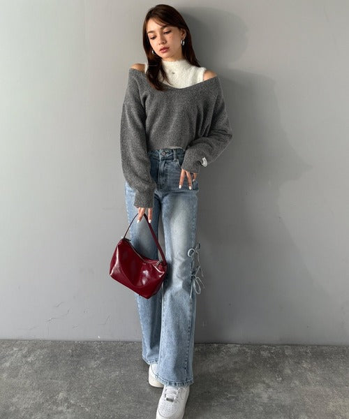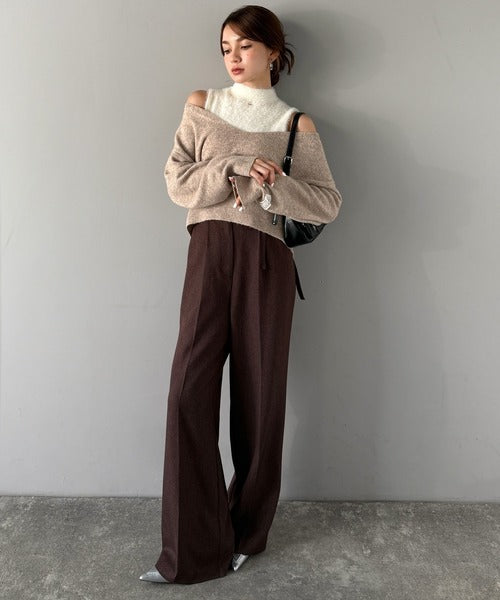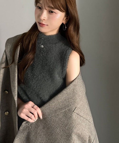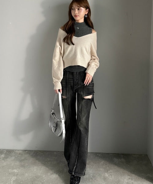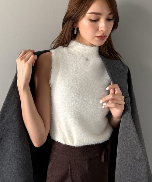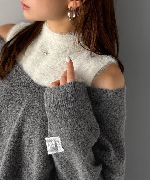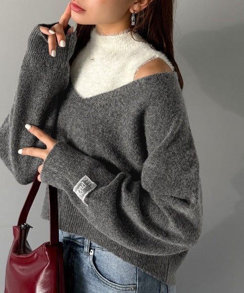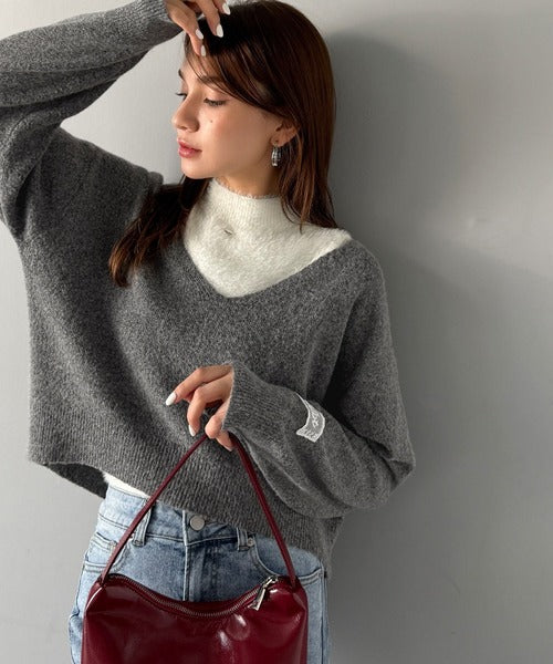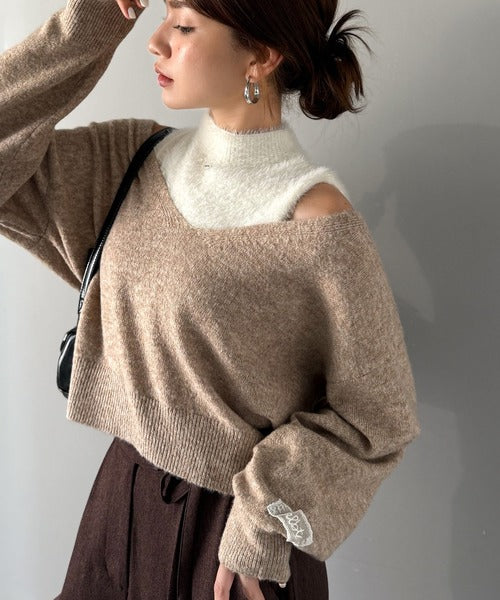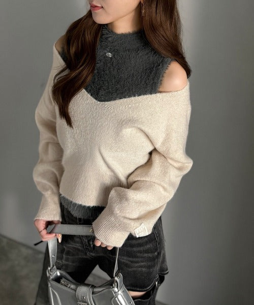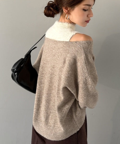 すっきりとしたVネックニットと、ふんわり毛足のあるプチハイネックフェザーニットがセットになった特別感のある一枚です!