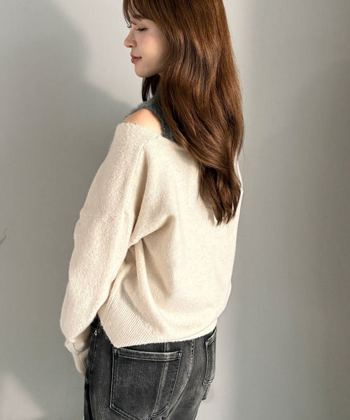 Vネックニットとフェザーニットインナーのセットアンサンブル。