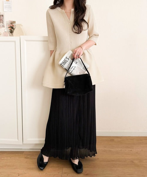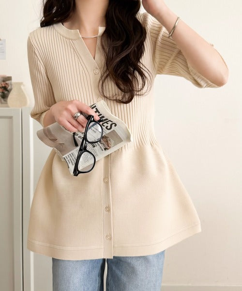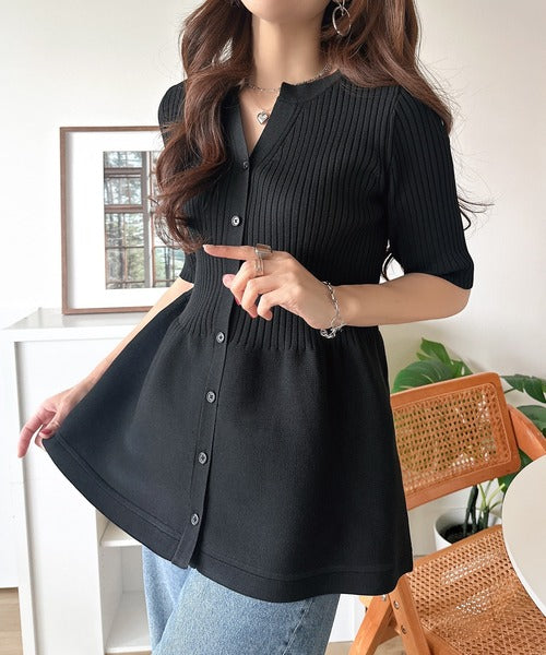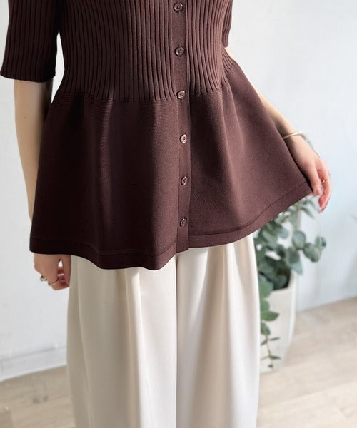 縦ラインを強調するリブ編みと、ふんわり広がるペプラムデザインが