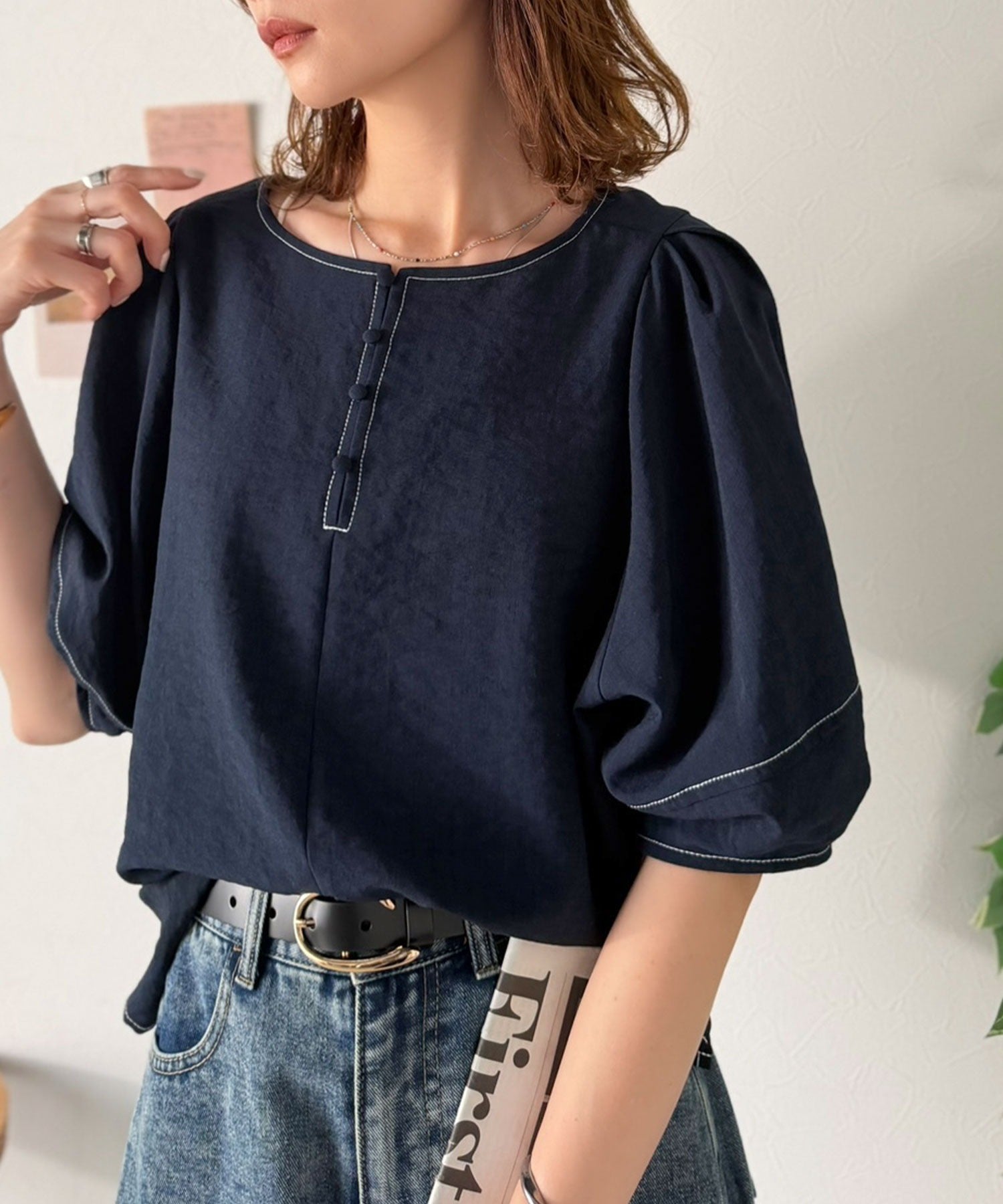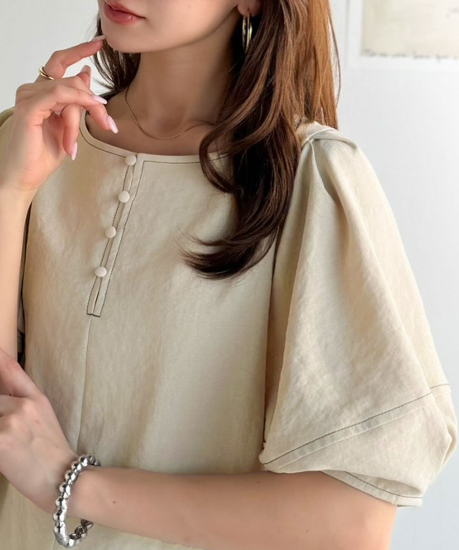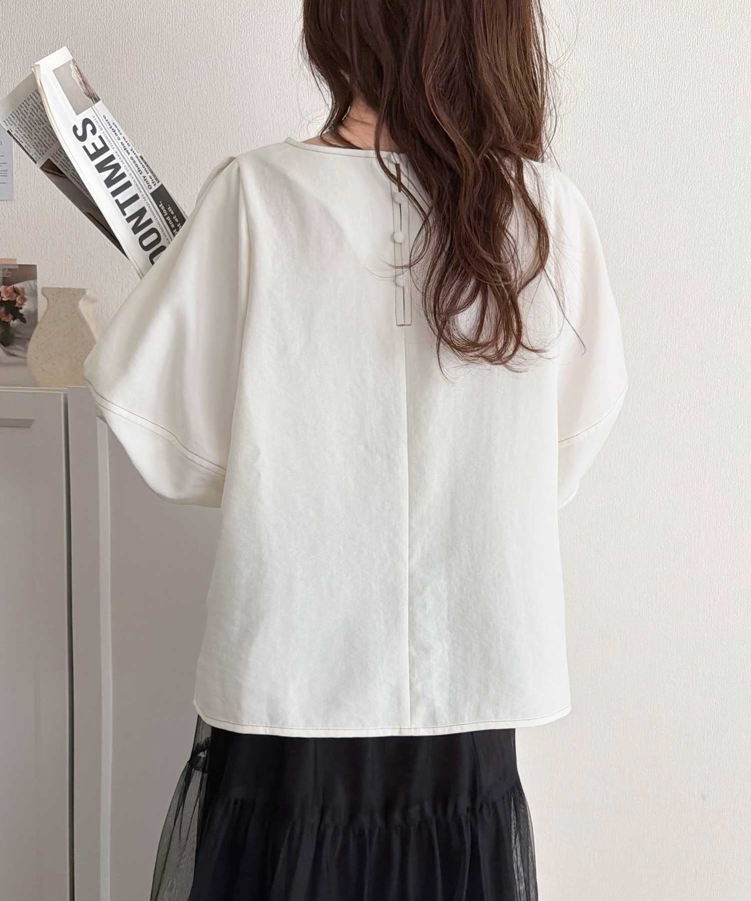ふんわりスリーブで華奢見えを演出、大人のきれいめブラウスです。