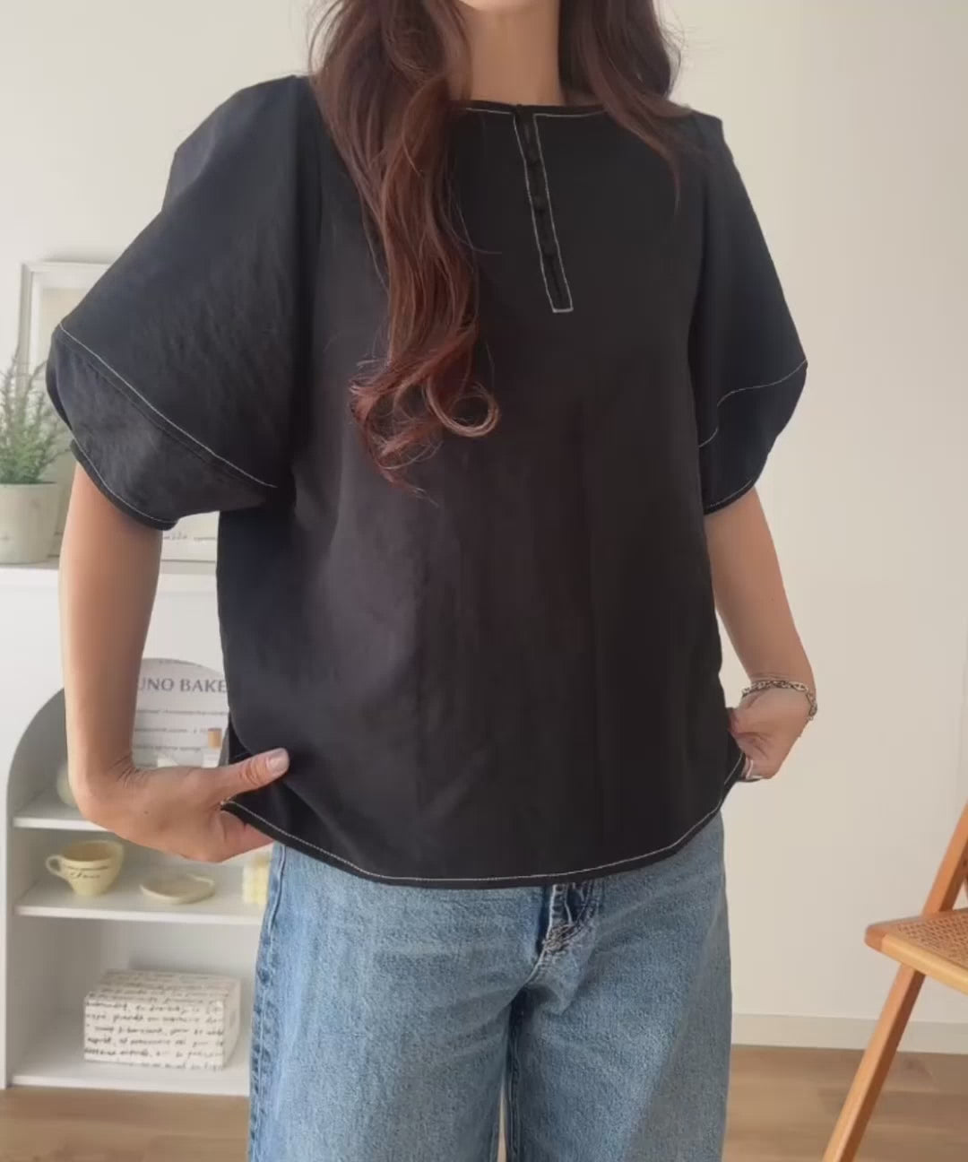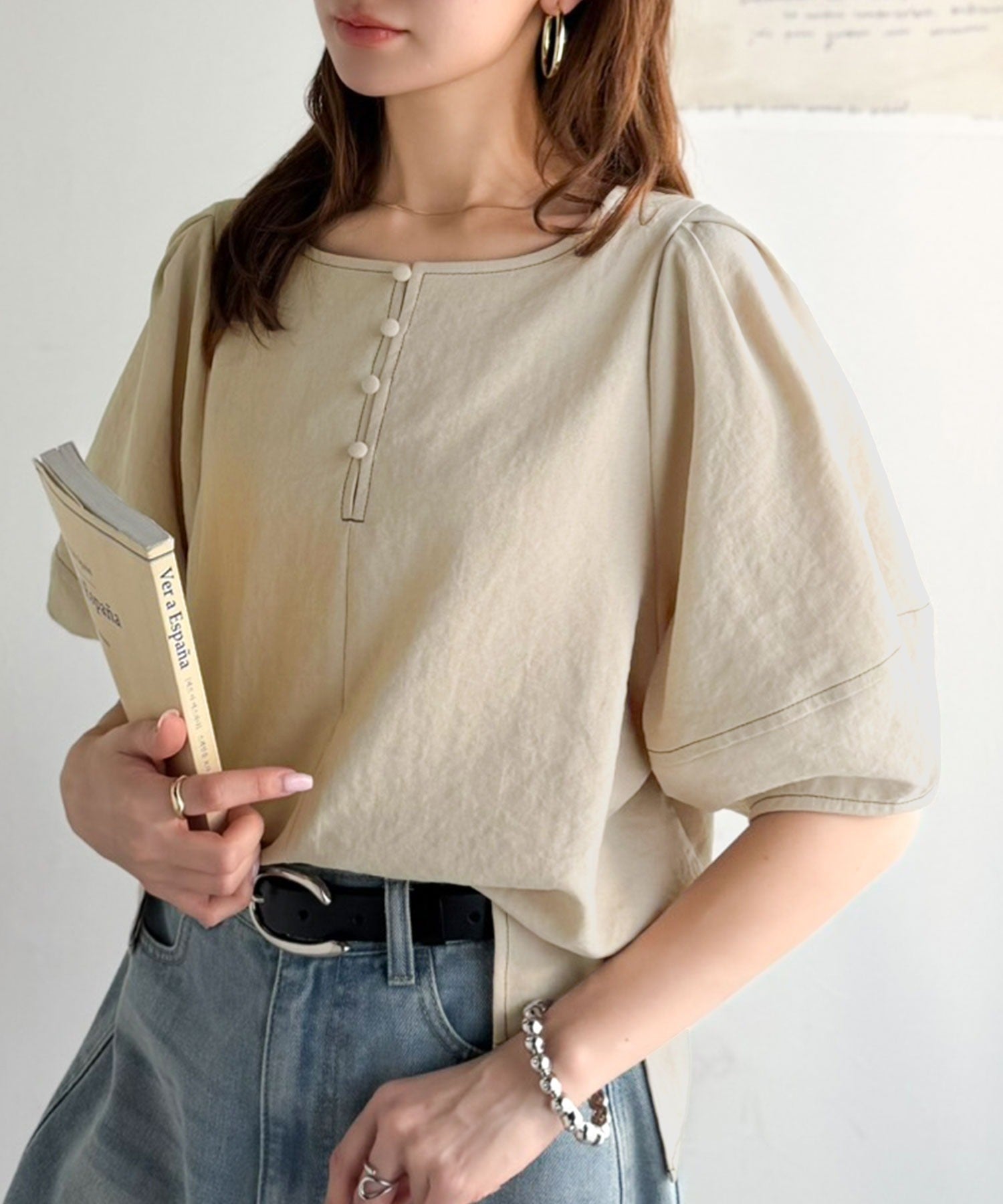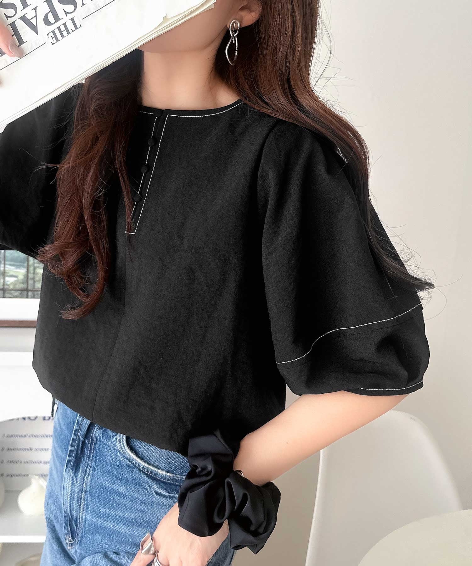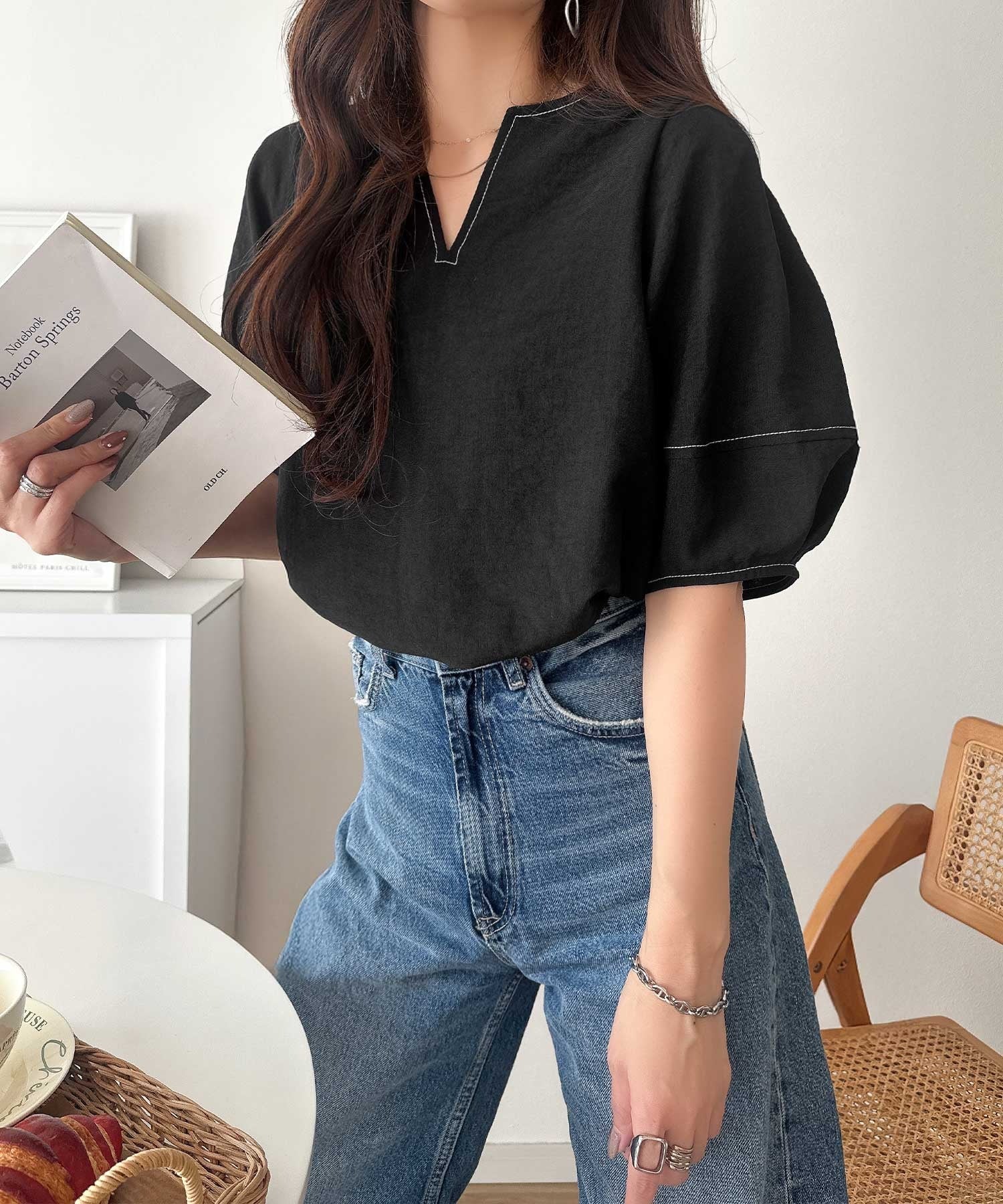 ふんわりスリーブで華奢見えを演出、大人のきれいめブラウスです。