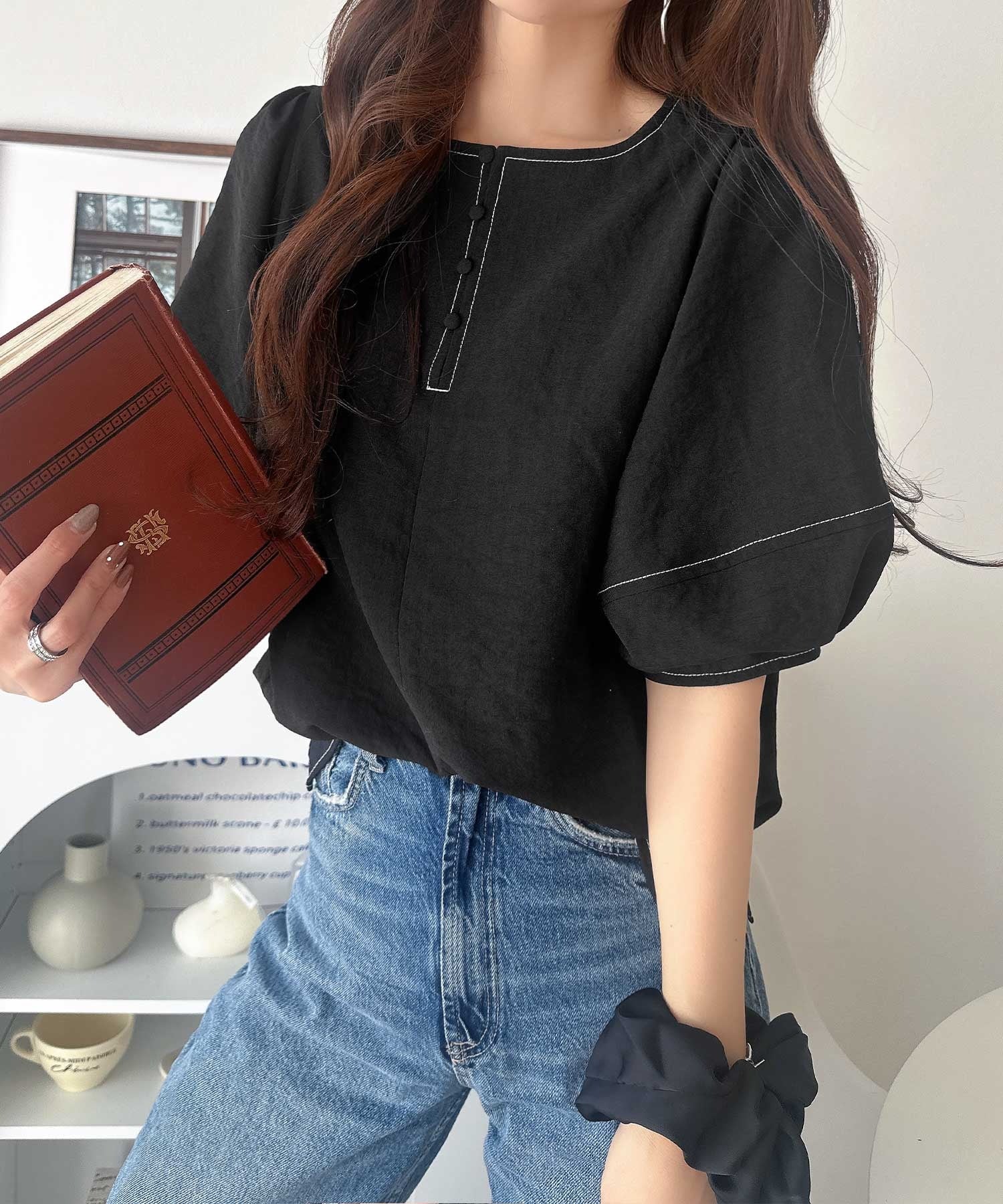 【UVカット、接触冷感、吸水速乾、防シワ機能付き】ふんわりスリーブで華奢見え叶う♪配色ステッチランタンスリーブブラウス ce1265053