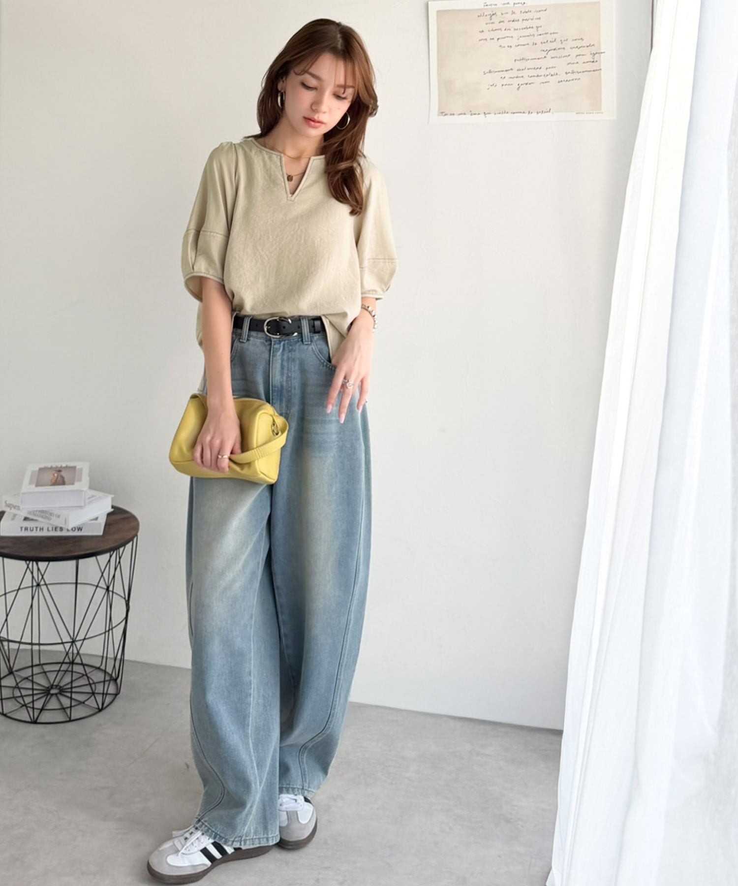 デニムやワイドパンツなどのカジュアルなアイテムと合わせれば甘すぎないスタイルに仕上がります。