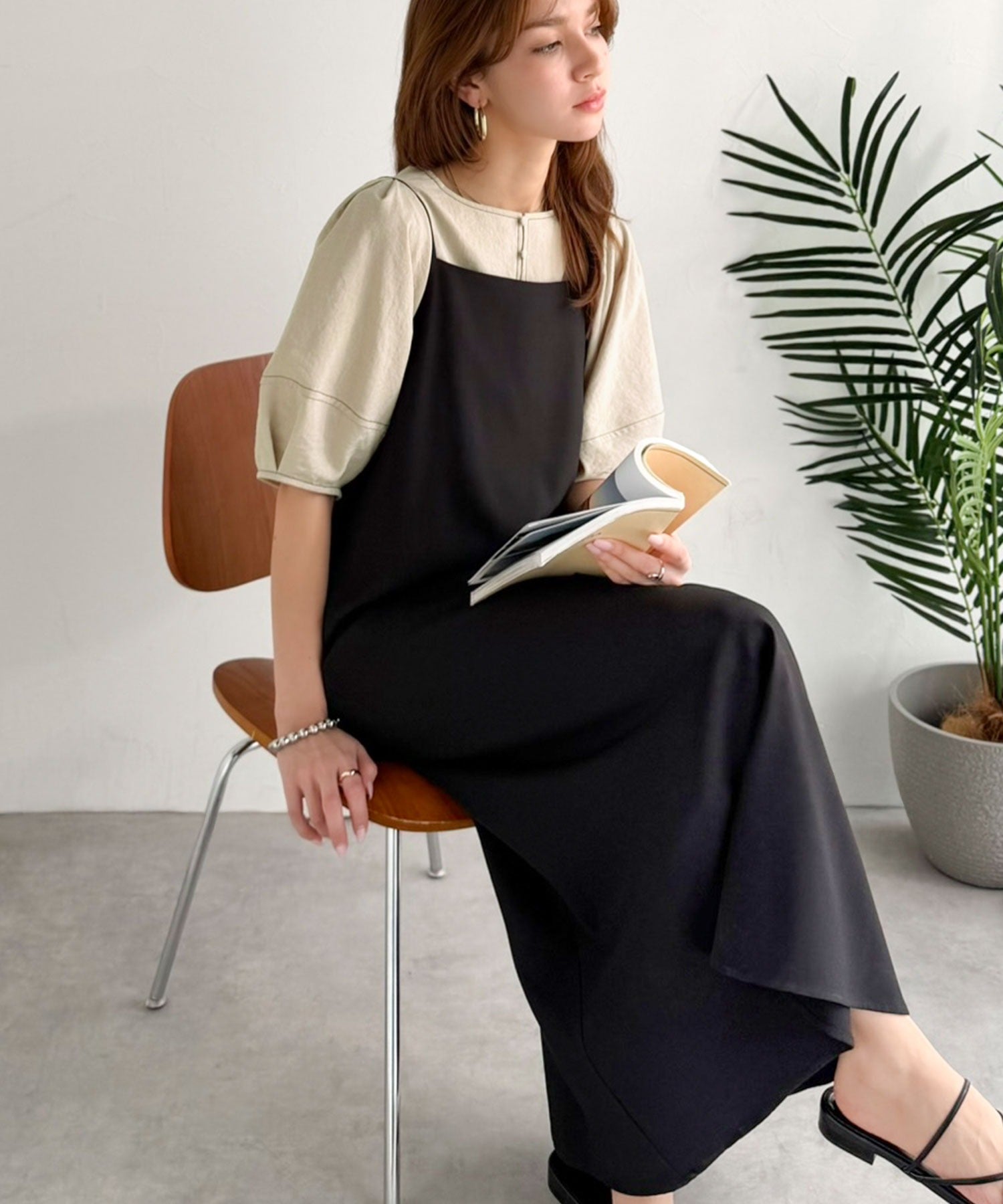 アクセントになる配色ステッチと、立体的なランタンスリーブが特徴のデザイン。