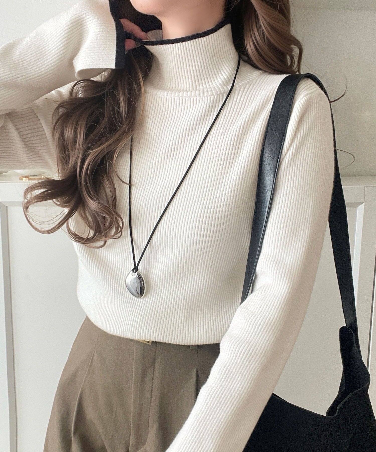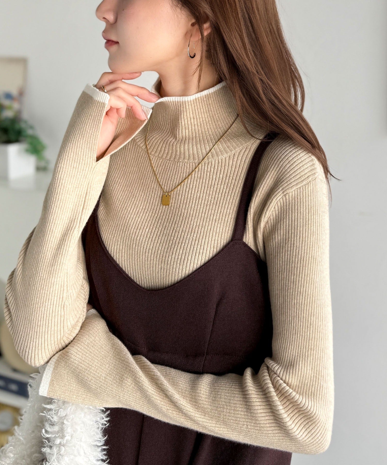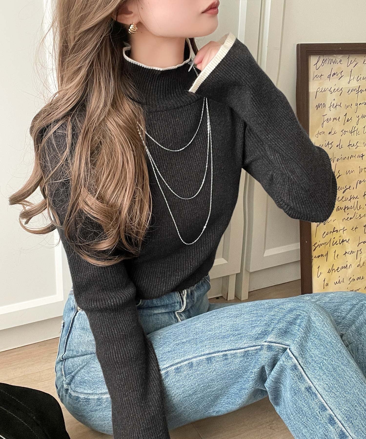 衿と袖口の配色ラインが、顔まわりを華やかに引き立てるハイネックリブニット。