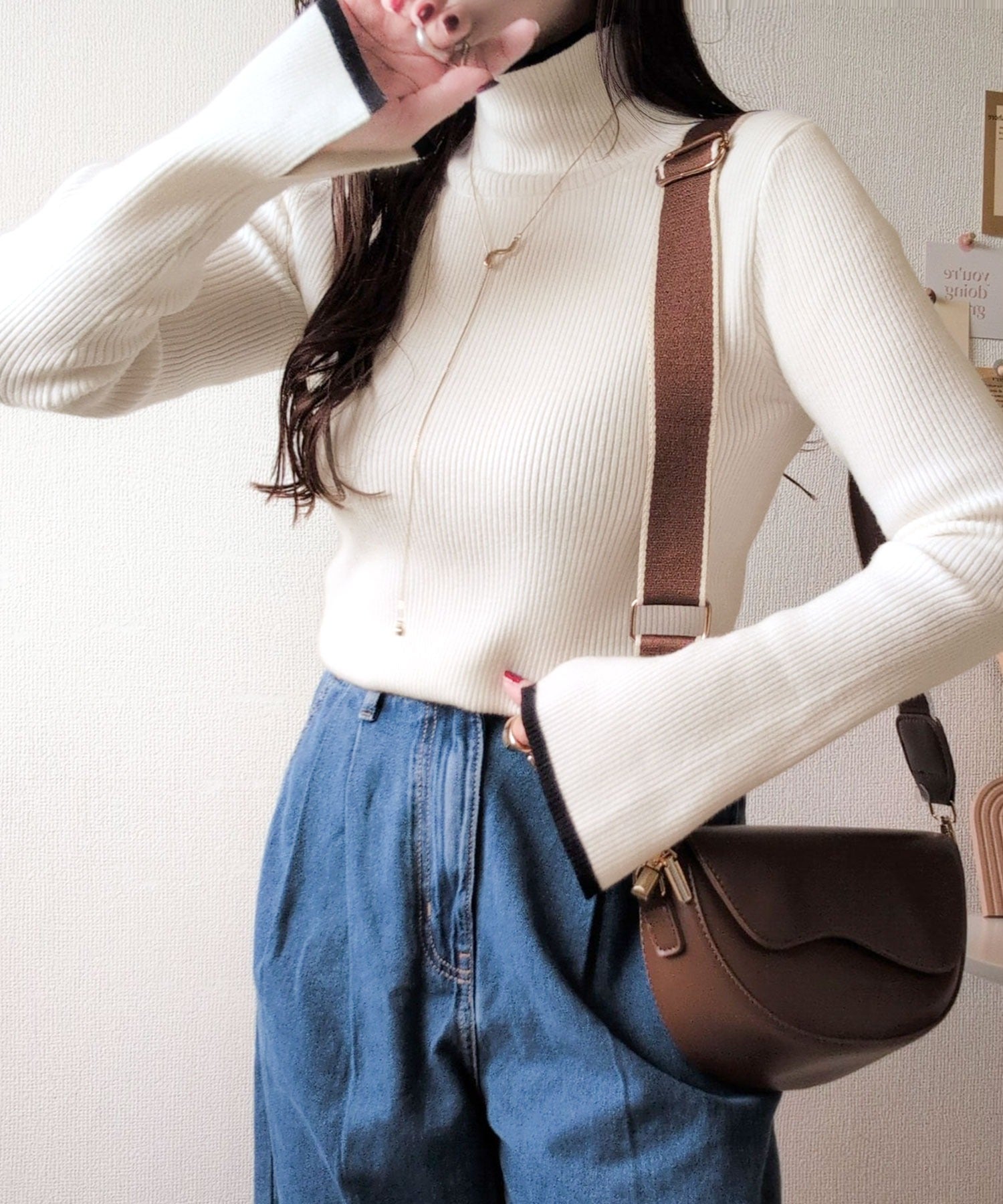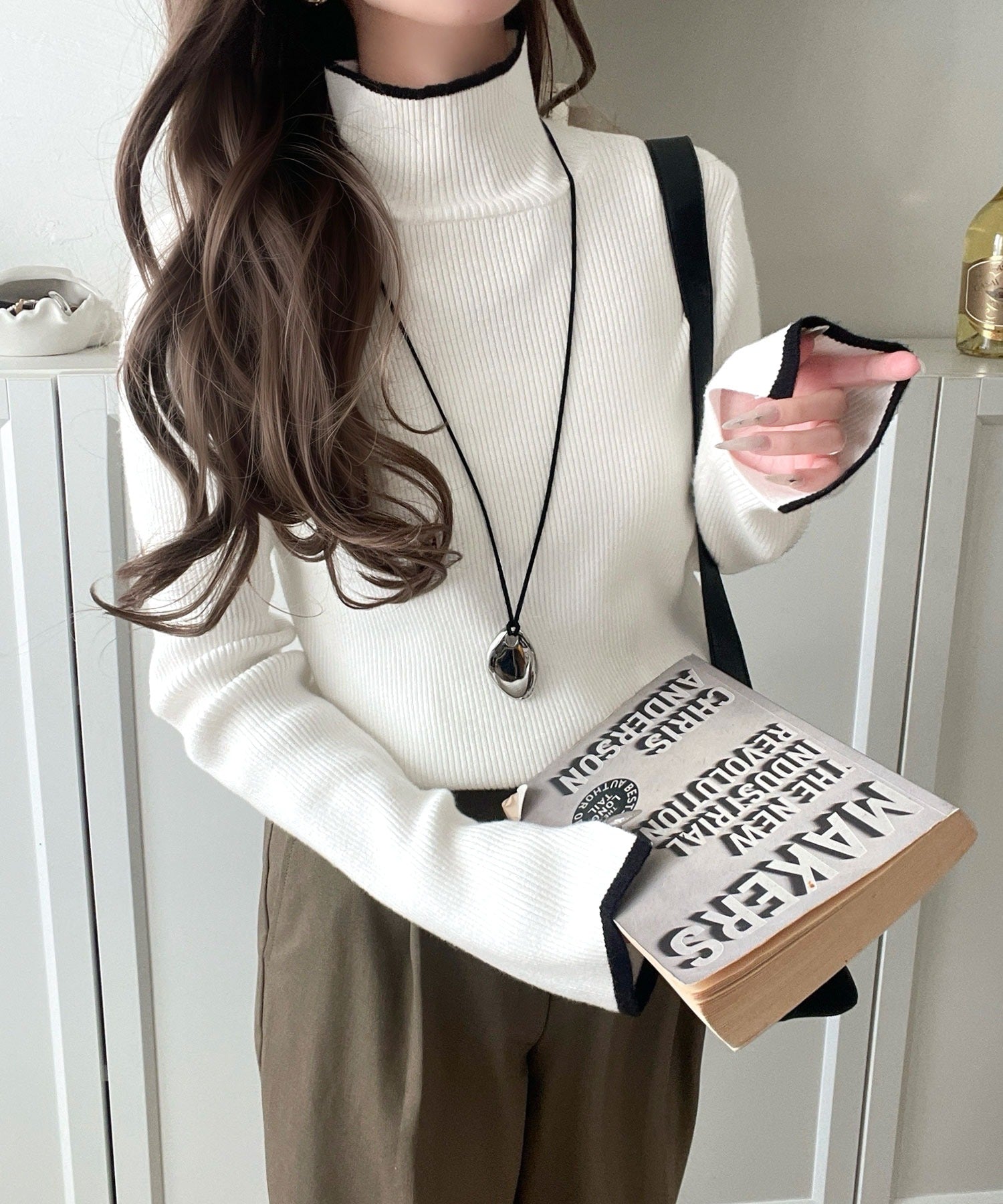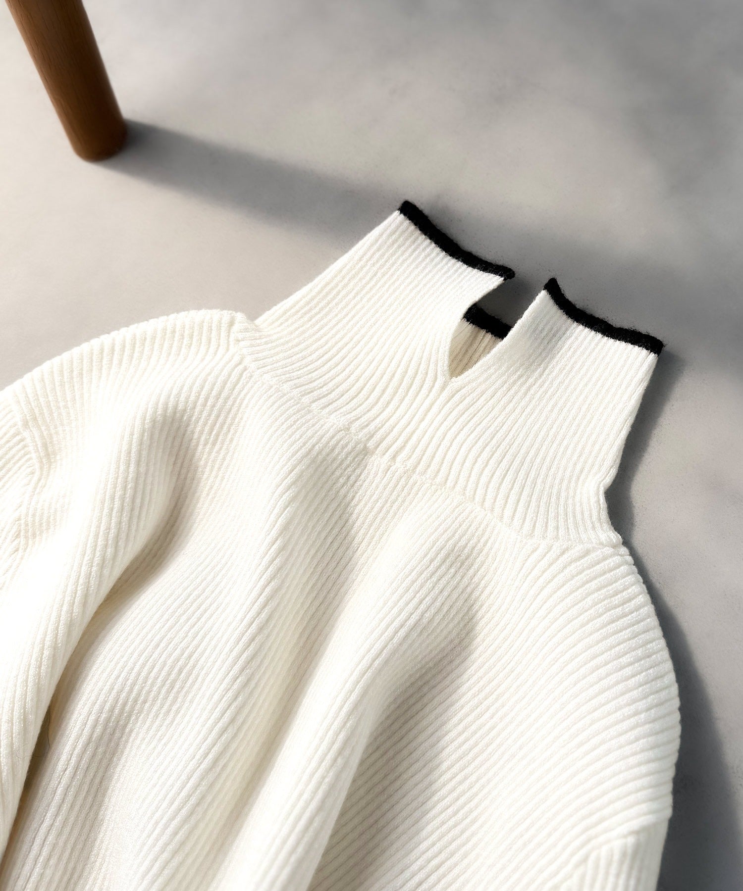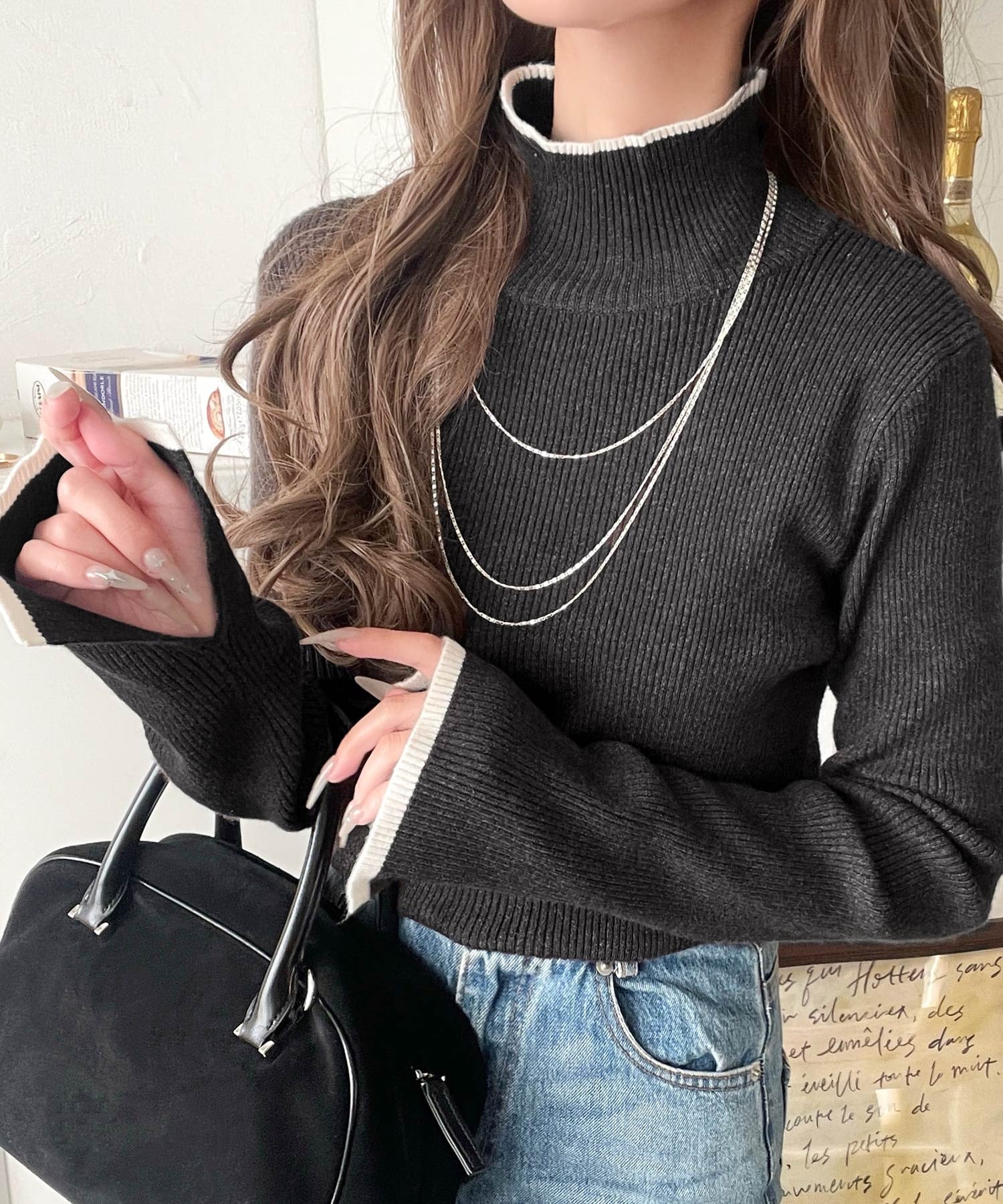 衿と袖口の配色ラインが、顔まわりを華やかに引き立てるハイネックリブニット。