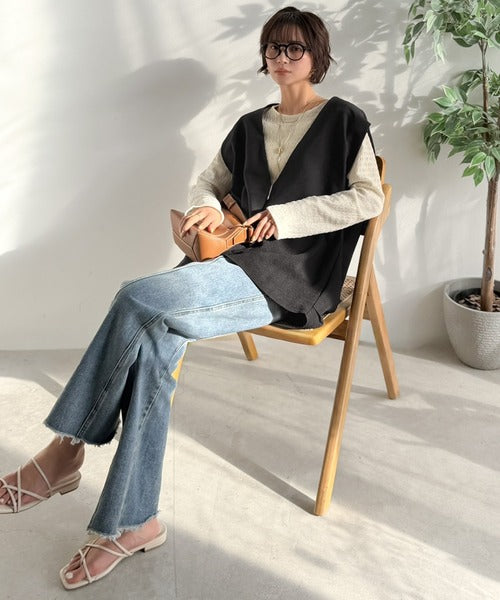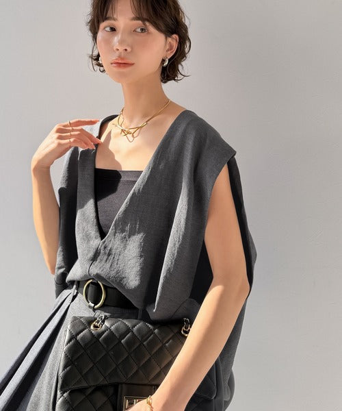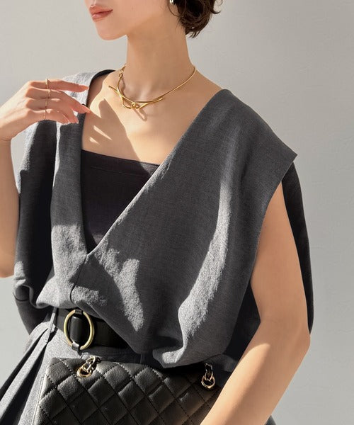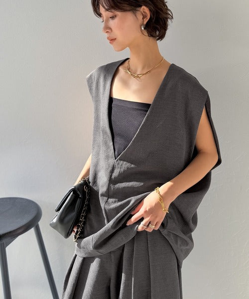 深めのVネックとドロップショルダーを組み合わせた、抜け感のある大人ベスト!