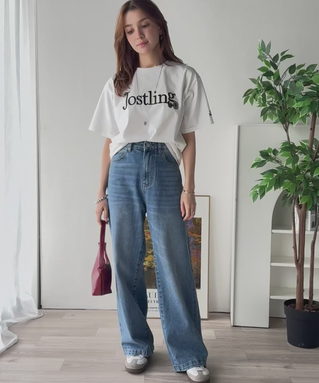 全体的にゆったりとしたシルエットのストレートデニムは、華奢見せ効果も。