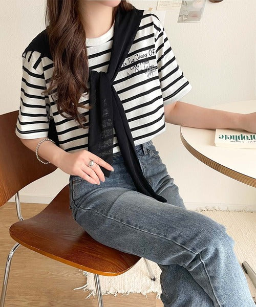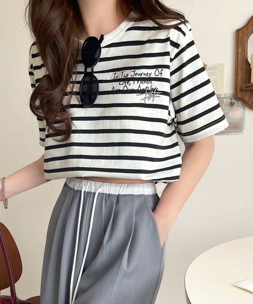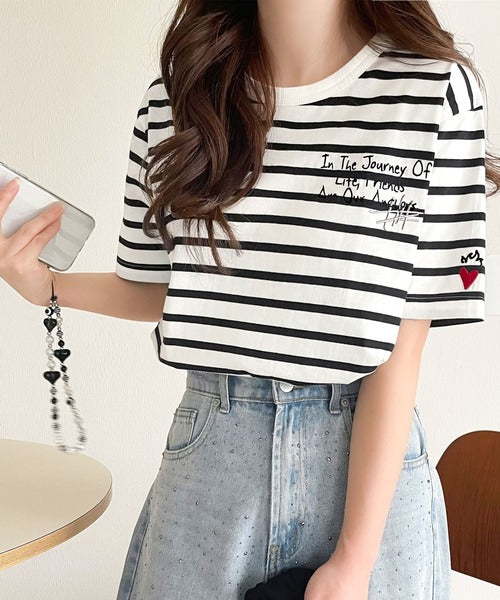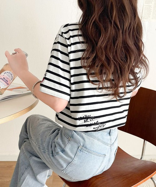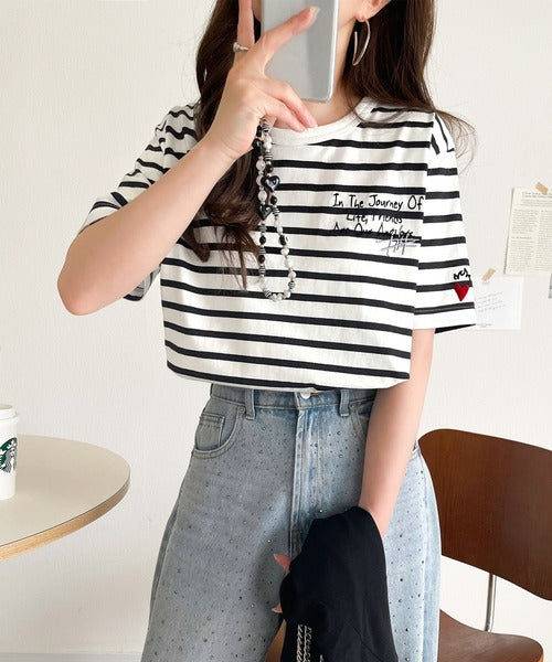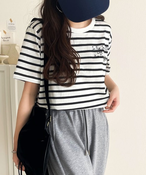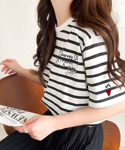 【sustaina+】アートのように刺繍が映える。オーガニックコットン100%らくがき風刺繍 無地&ボーダー柄半袖Tシャツ ce1260396
