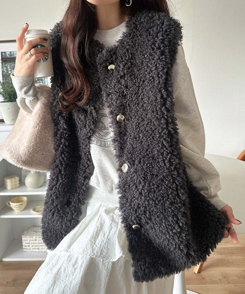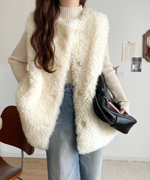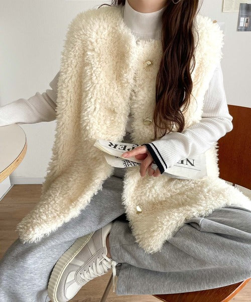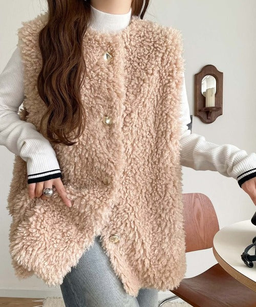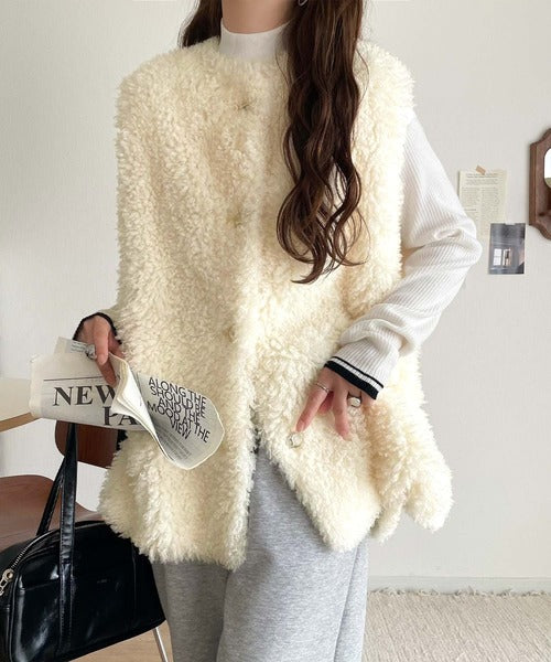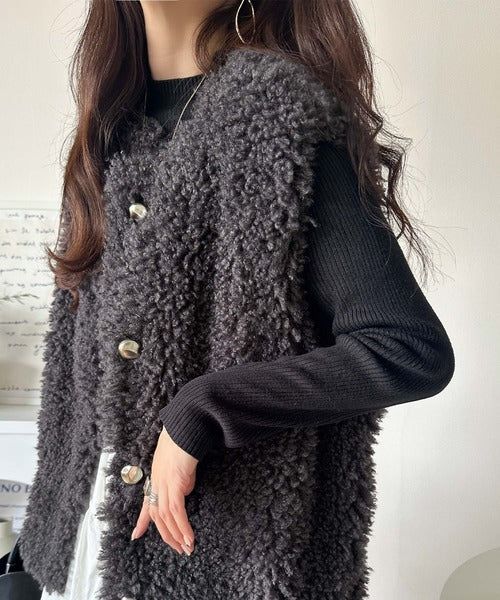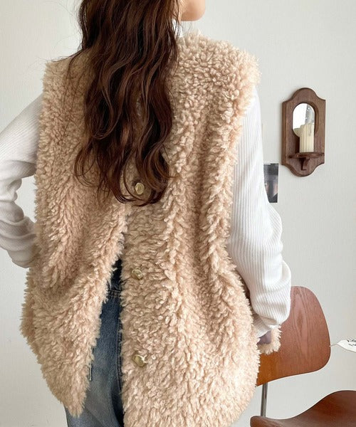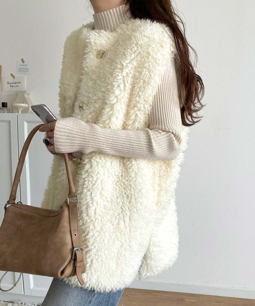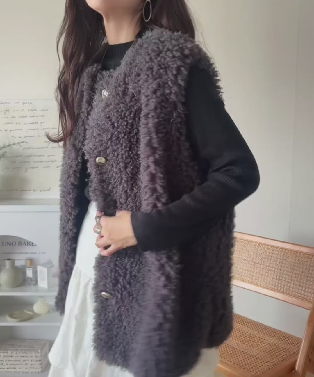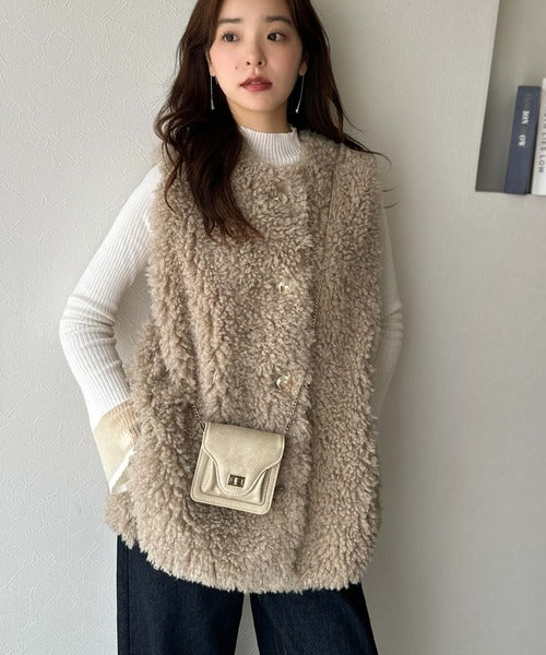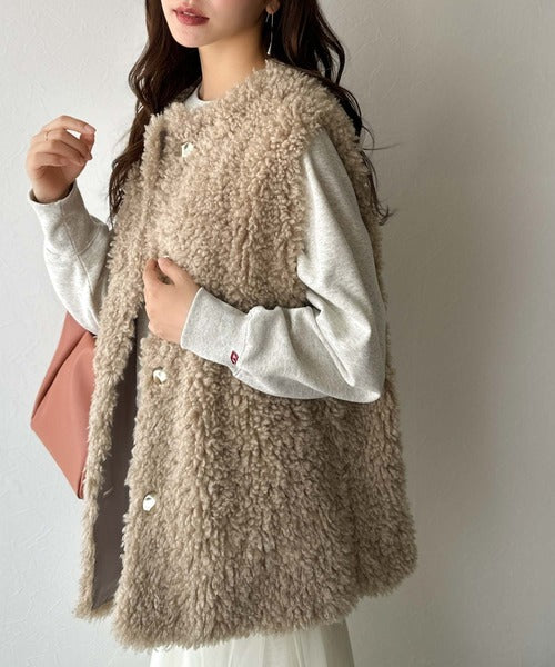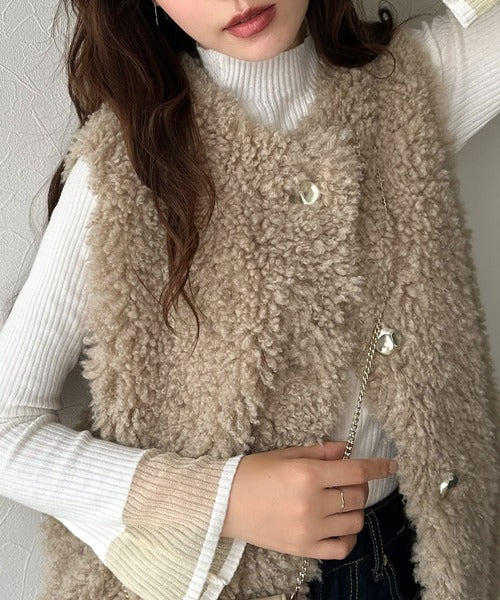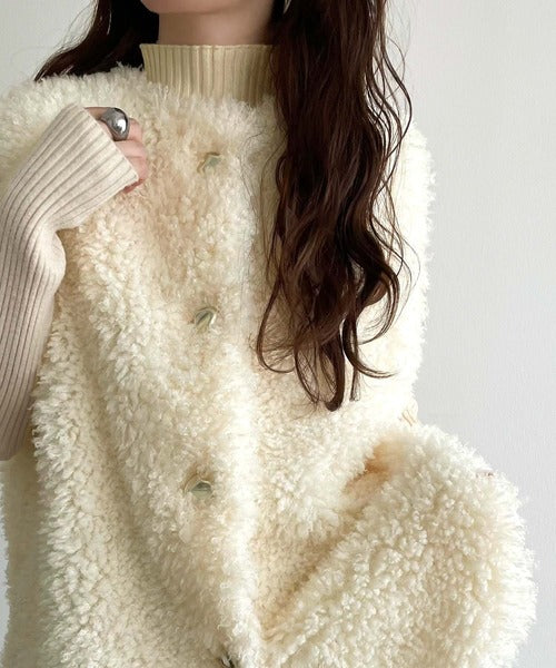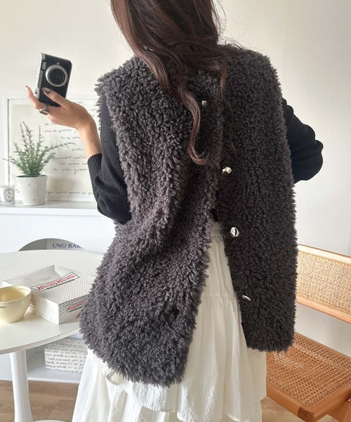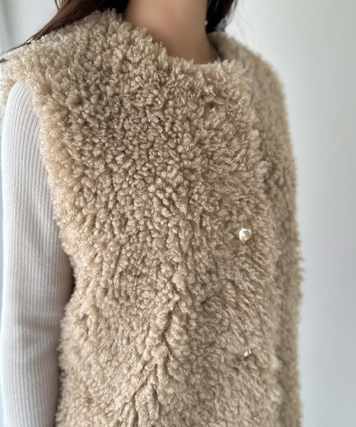 ふわふわのプードルボア素材で仕立てた、見た目も暖かさも文句なしの2wayベスト。