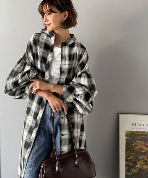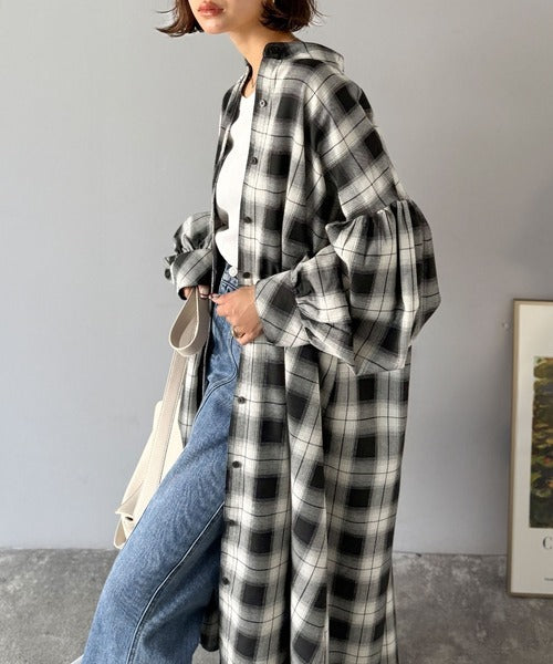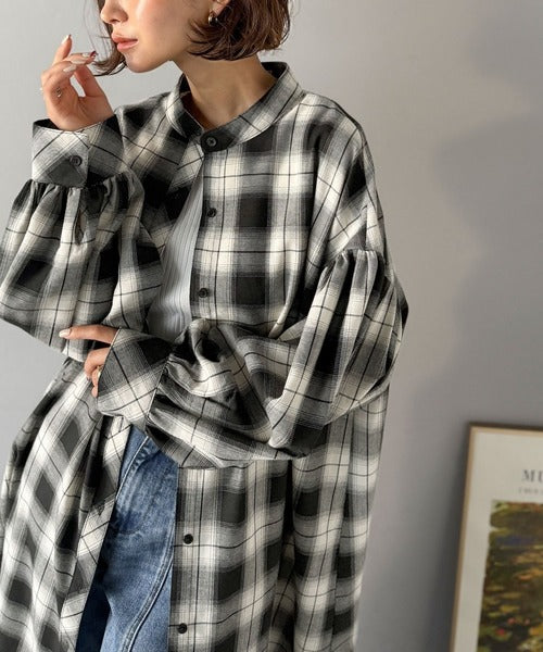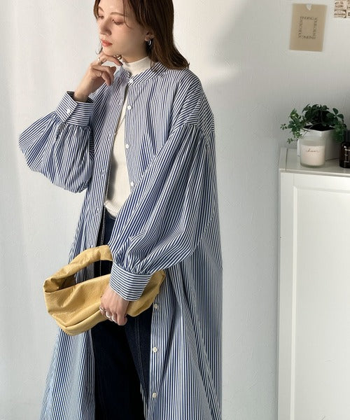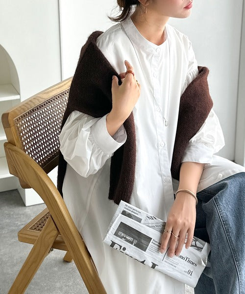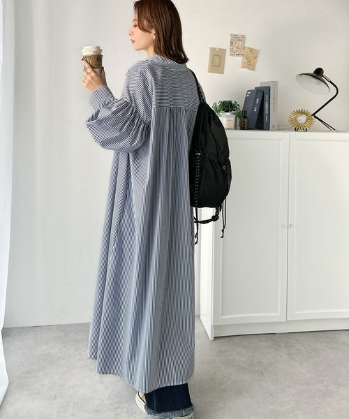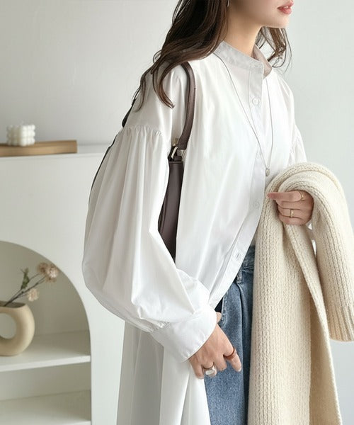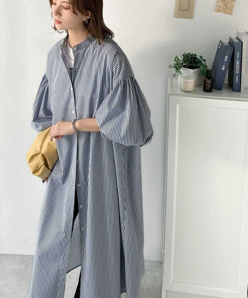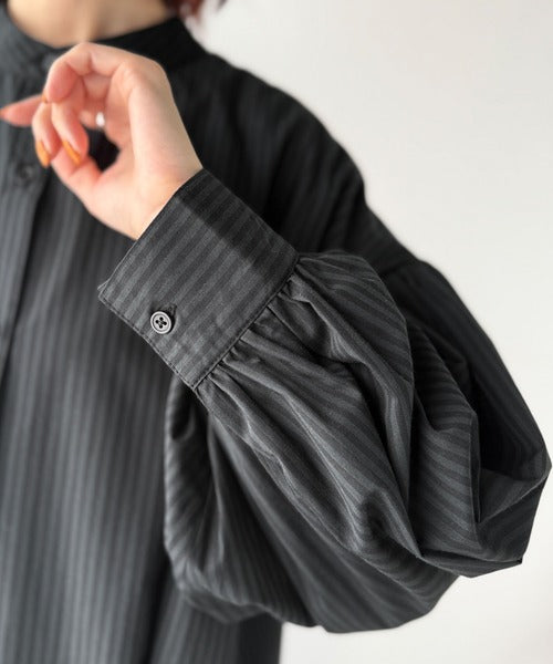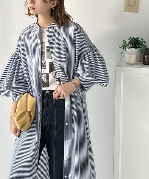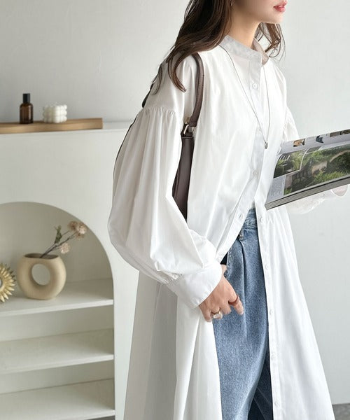 首元はすっきりとしたバンドカラー仕様で、全体にたっぷりギャザーを施したボリューム感のあるシャツワンピース。